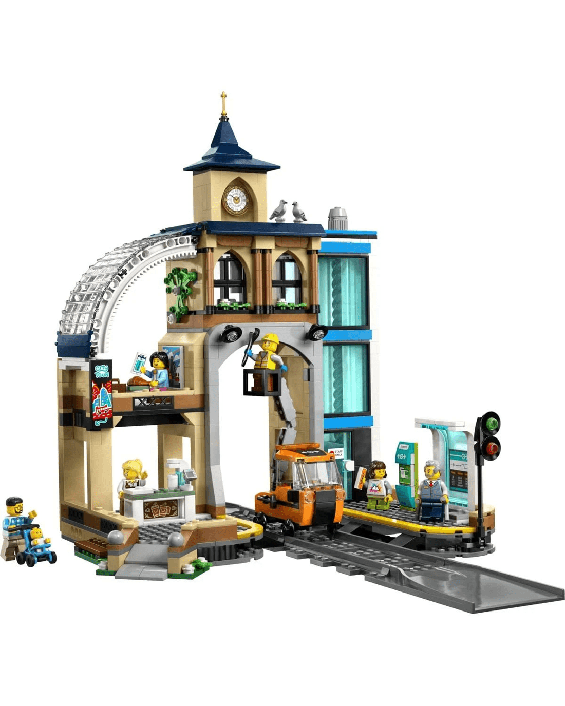 This LEGO City Central Train Station construction toy is packed with cool features for imaginative play across three levels. Topped with a classic clock tower, the toy station includes a cosy coffee bar, working lift, control room, bus stop, two passenger platforms, a timetable display and a ticket machine. Kids also get a railway maintenance vehicle with a cherry picker, plus six minifigures, a baby figure and two pigeon figures for role play and storytelling.