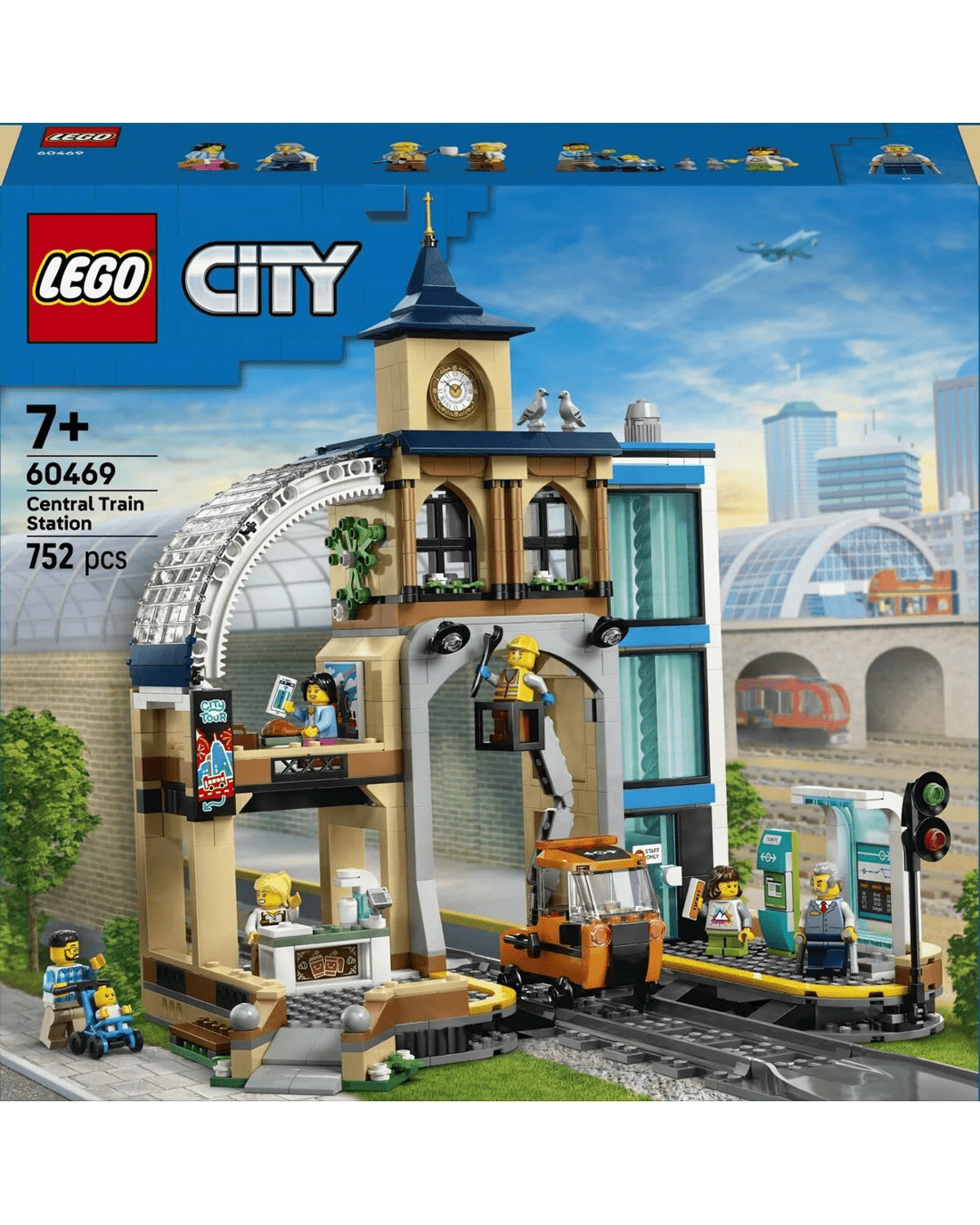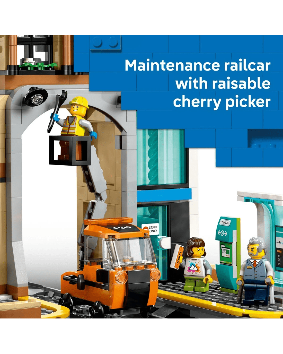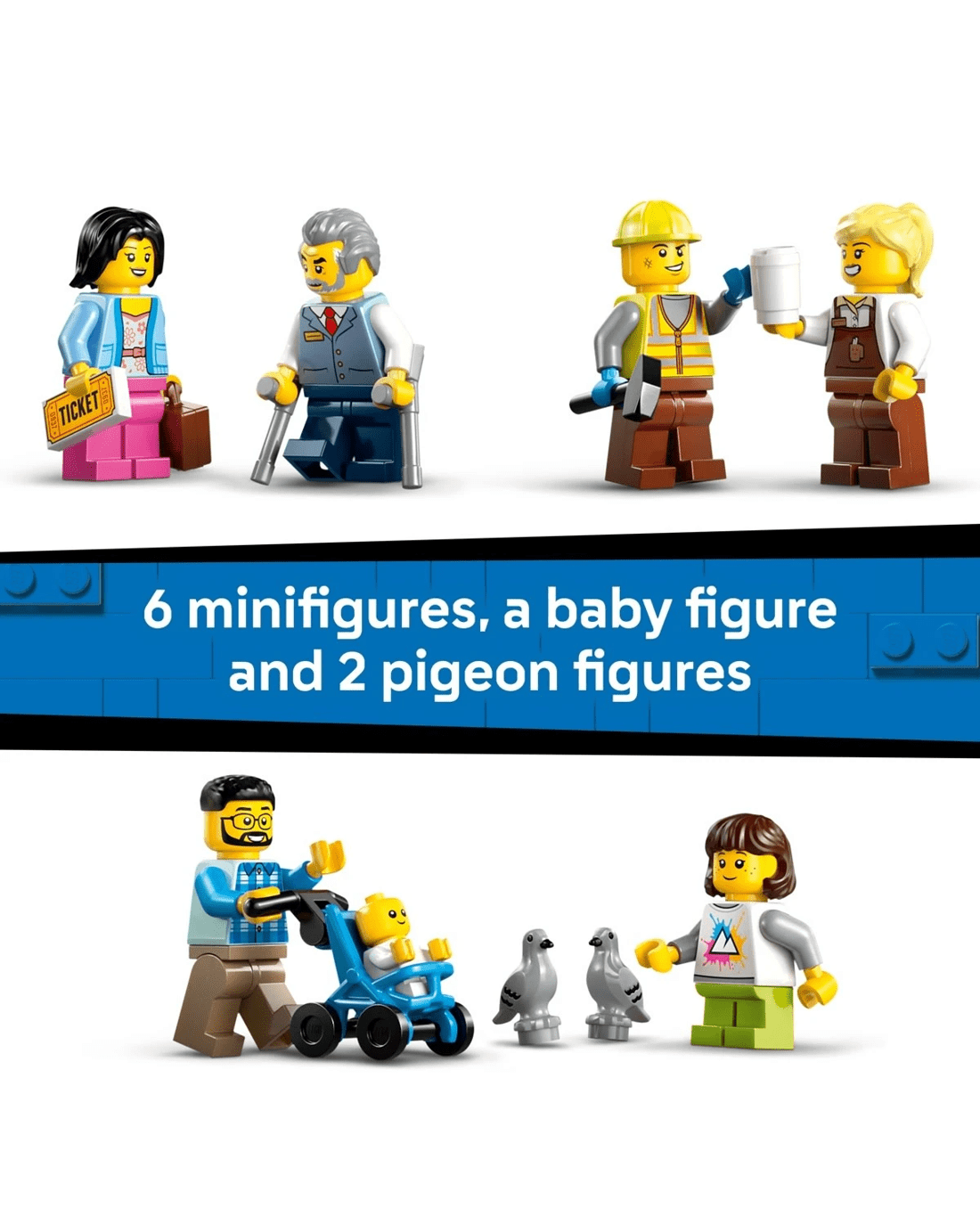 - What’s in the box? - All kids need to build a toy train station and a railway maintenance vehicle with a raisable cherry picker, plus 6 minifigures, a baby figure and 2 pigeon figures for role play