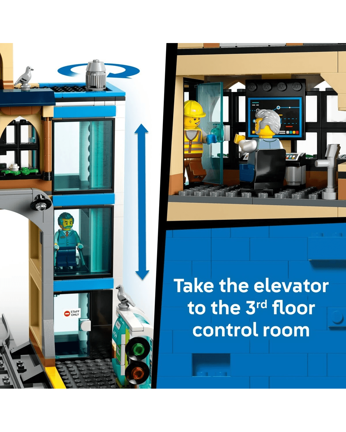 - Just like the real thing - The toy train station includes 2 platforms, a timetable, ticket machine, working lift, clock tower, control room, coffee bar and a seating area with a transparent roof