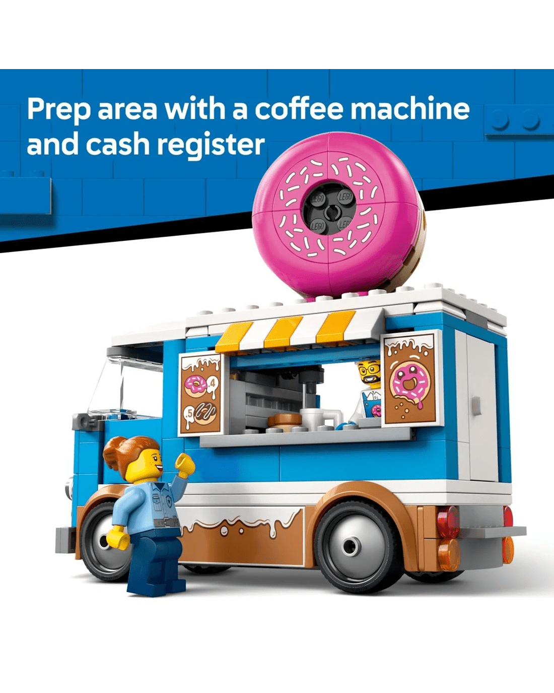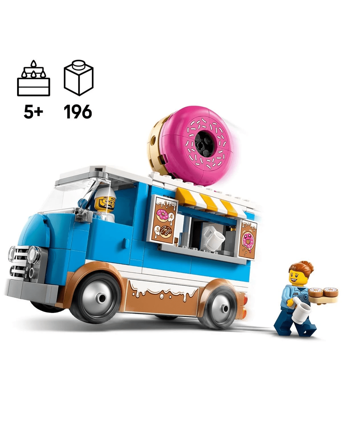 Introducing the ultimate vehicle toy for sweet-treat fans. The LEGO City Doughnut Truck playset comes with a delicious icing decoration, giant roof doughnut and an accessible prep area with a coffee machine and cash register. Kids can serve up tasty doughnuts and drinks from the service window and detach the kiosk for added play options. Just add the seller and customer minifigures and let the fun begin.