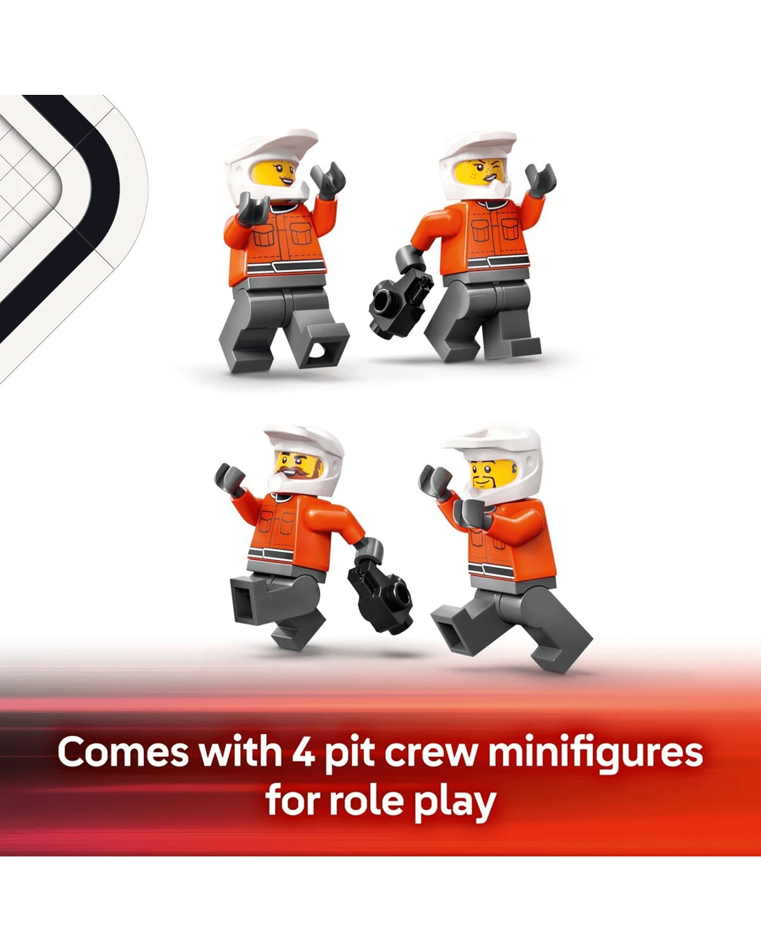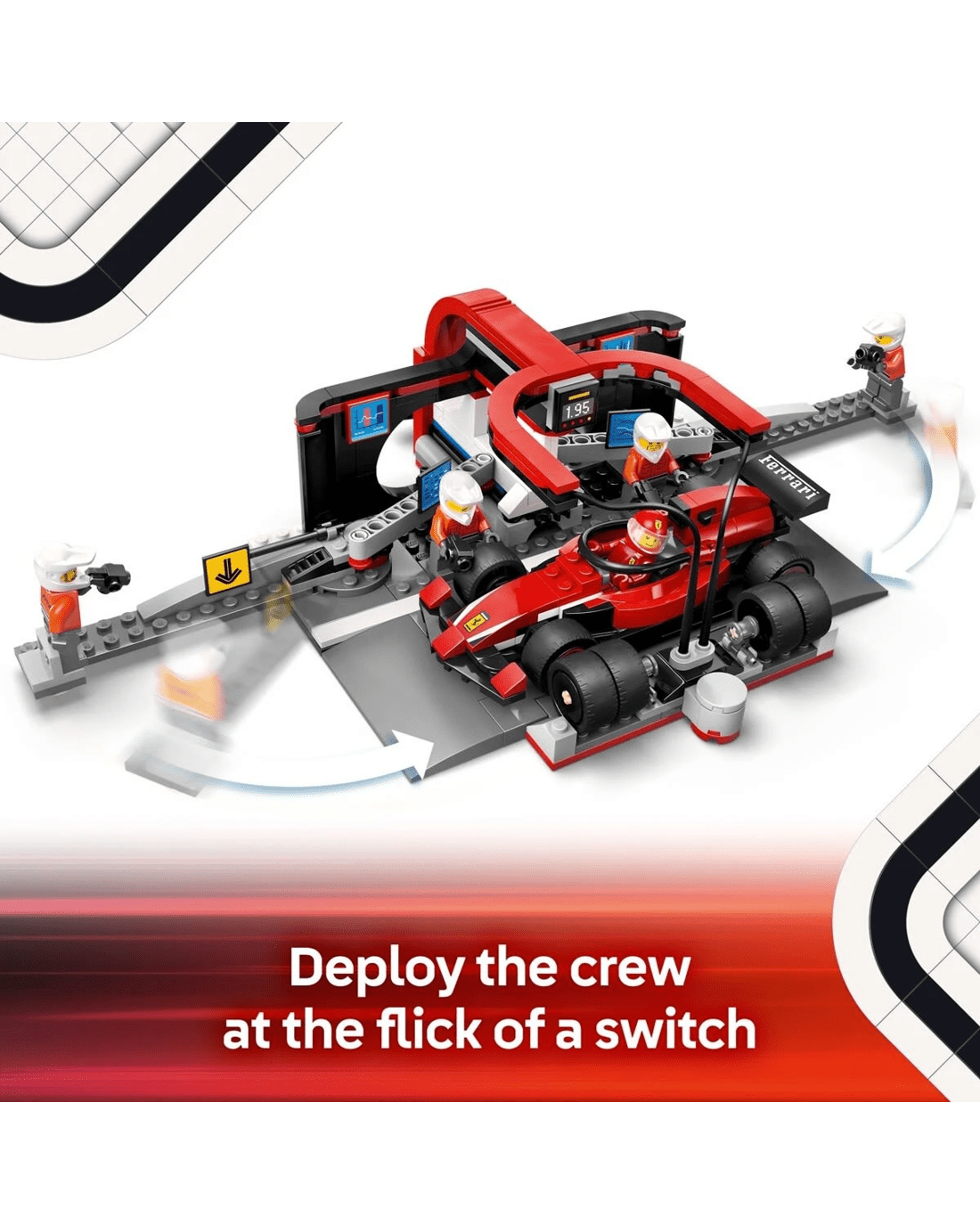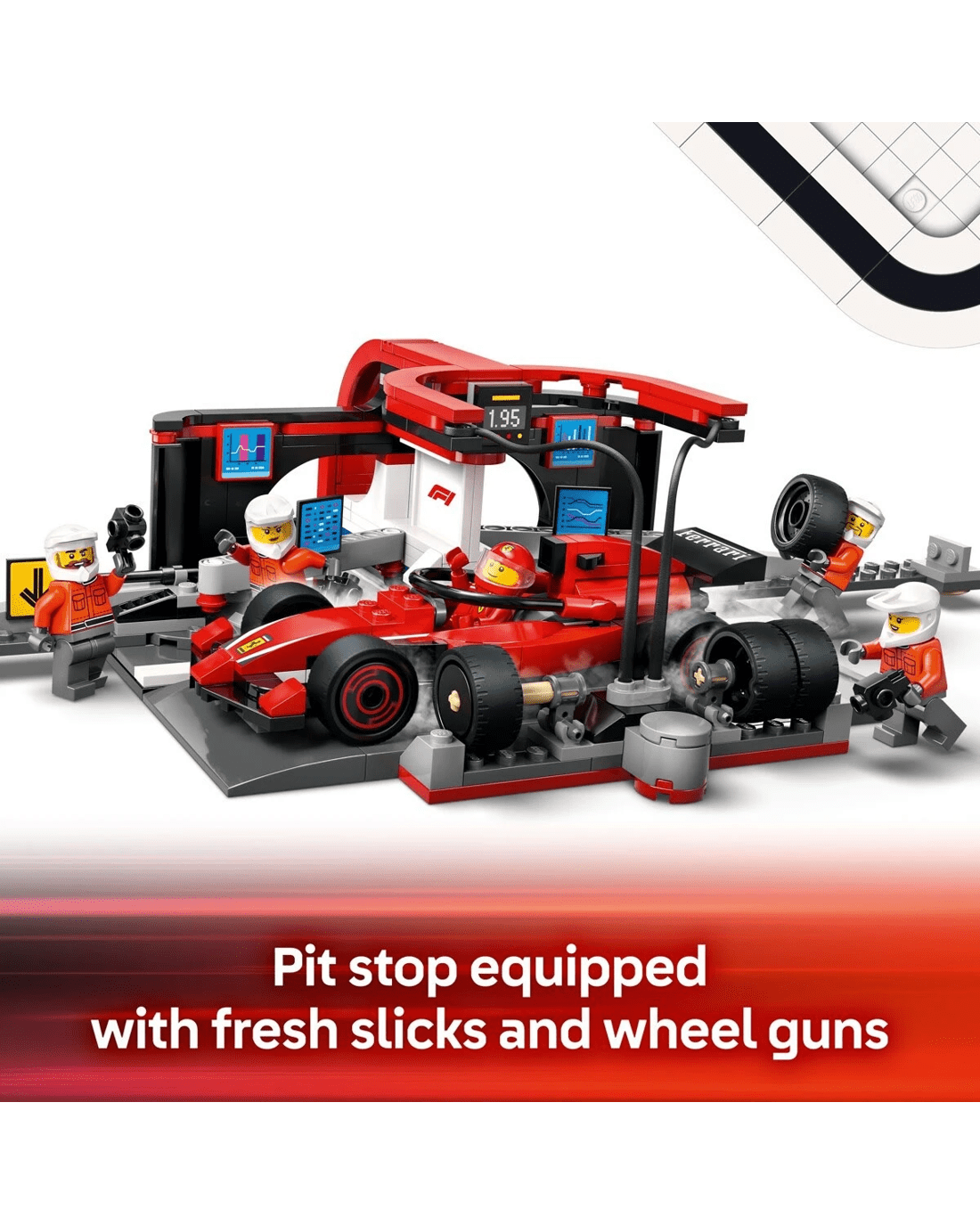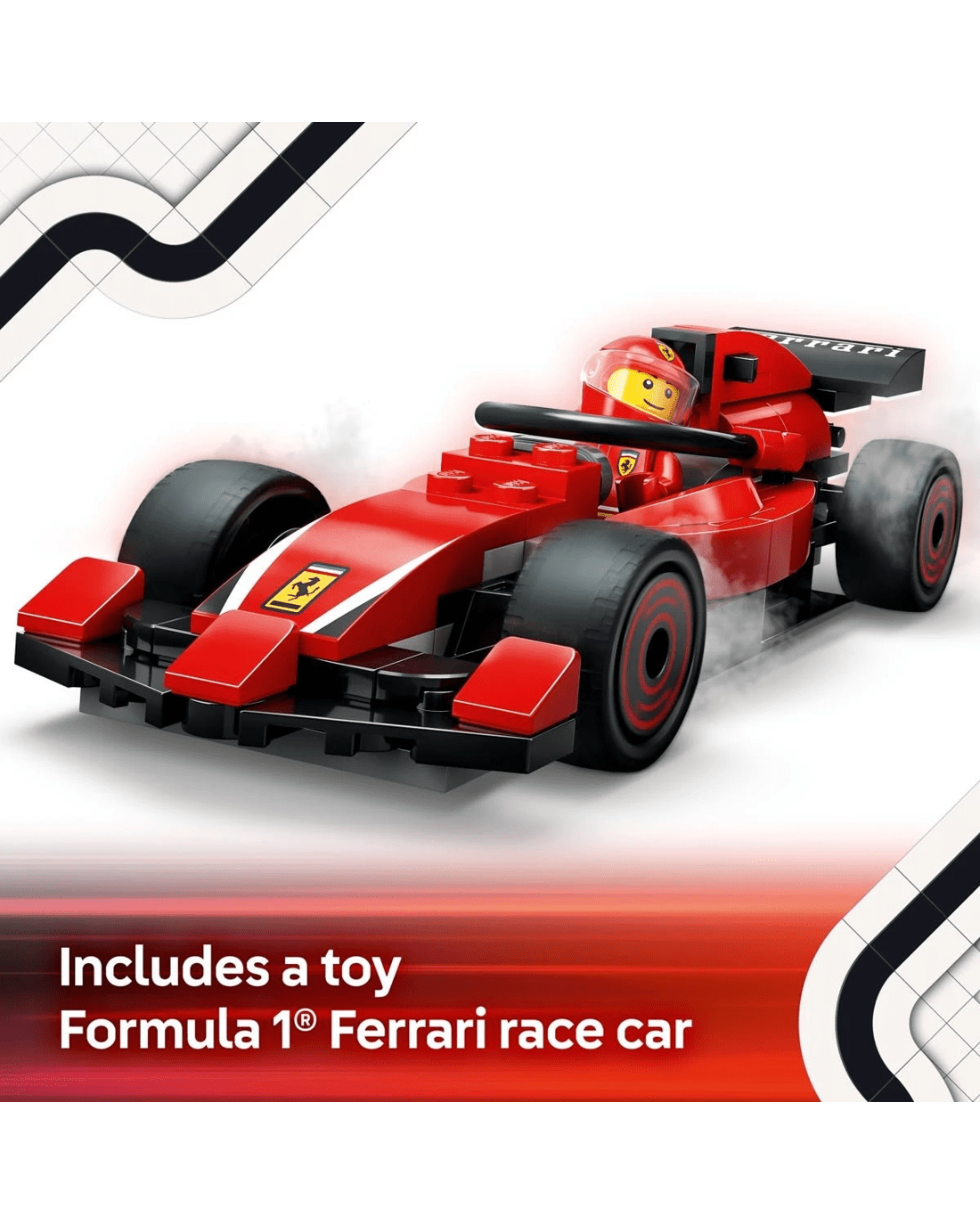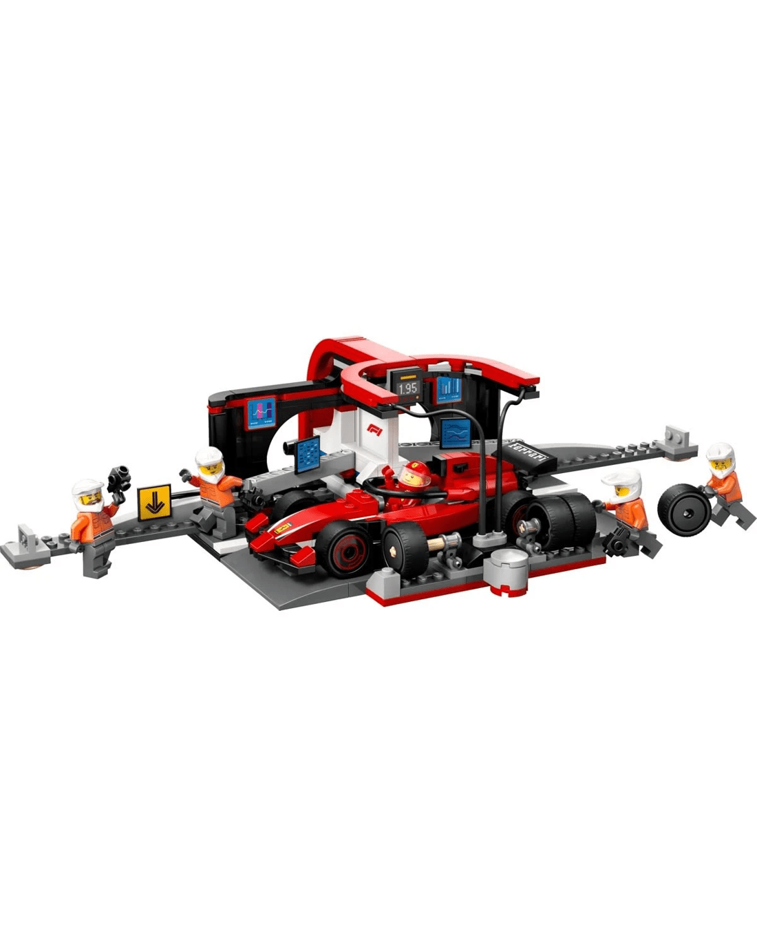 - What's in the box? - Everything kids need to build an F1 pit and Ferrari toy car, plus driver and 4 pit crew minifigures