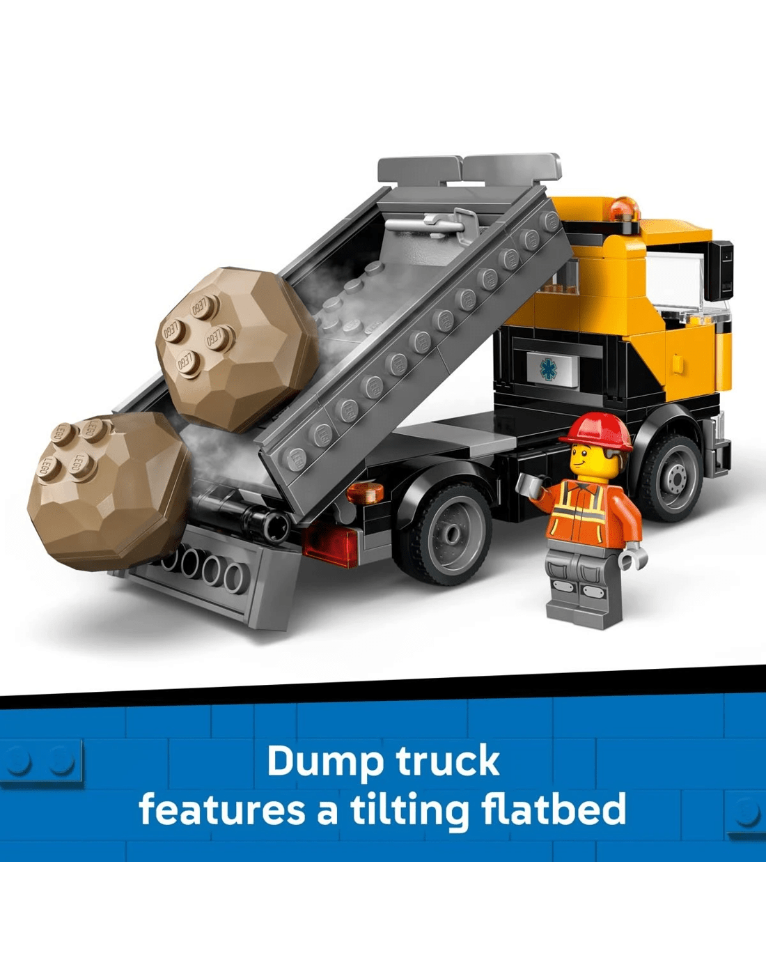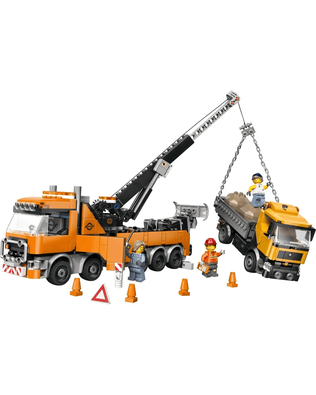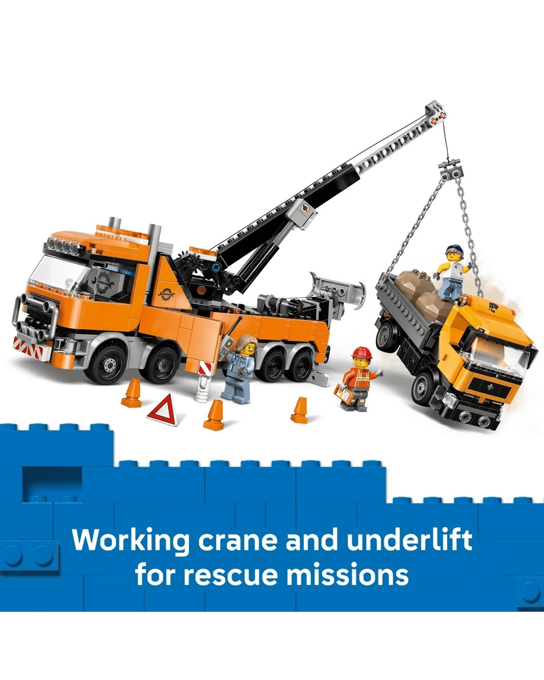 - What’s in the box? - This vehicle rescue playset includes everything kids need to build a toy rotator tow truck and a dump truck, plus 2 toy boulders, a restraining chain and 3 minifigures