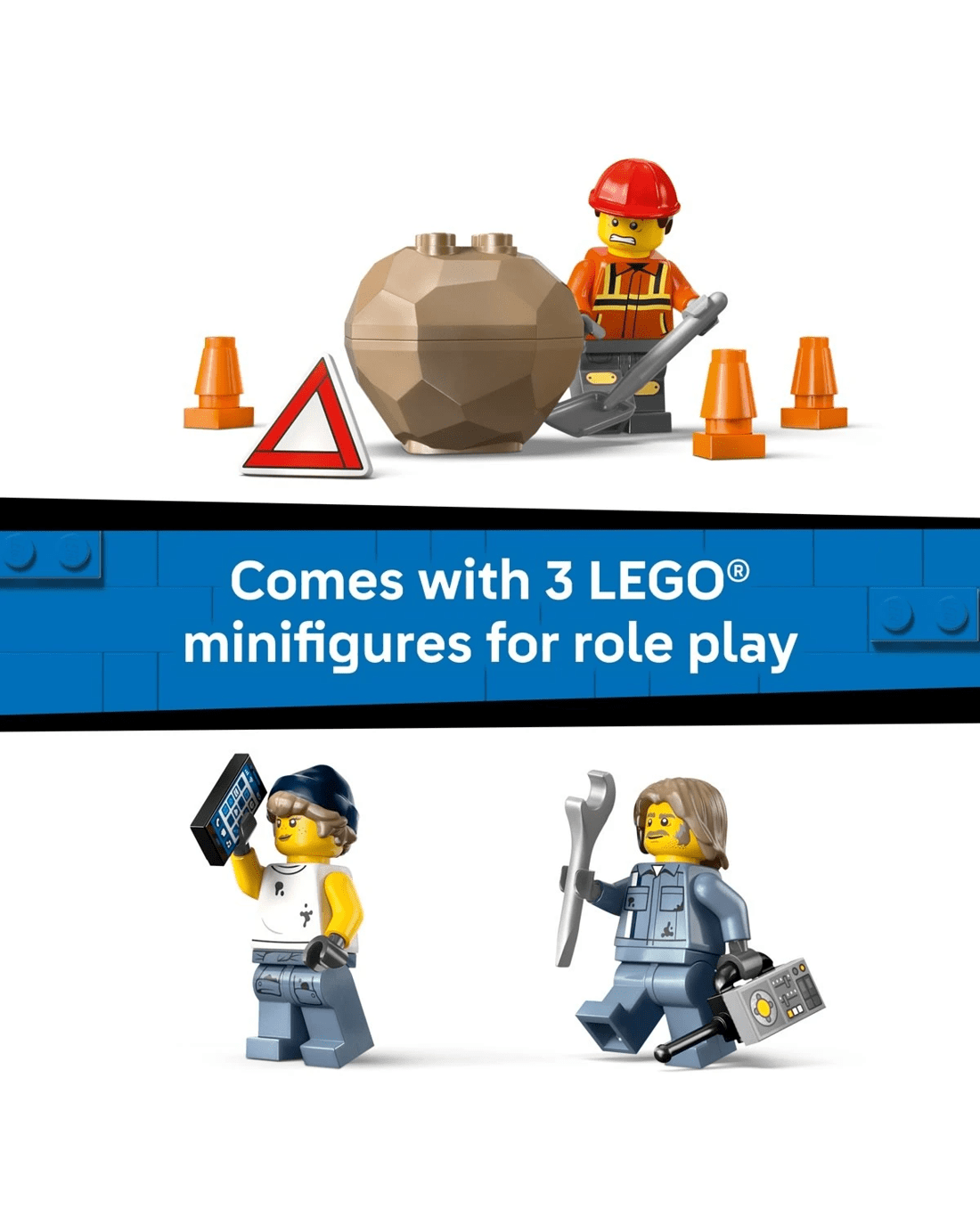 - LEGO minifigure accessories - Includes 4 traffic cones, 2 telephones, a walkie-talkie, wrench, shovel and a warning triangle