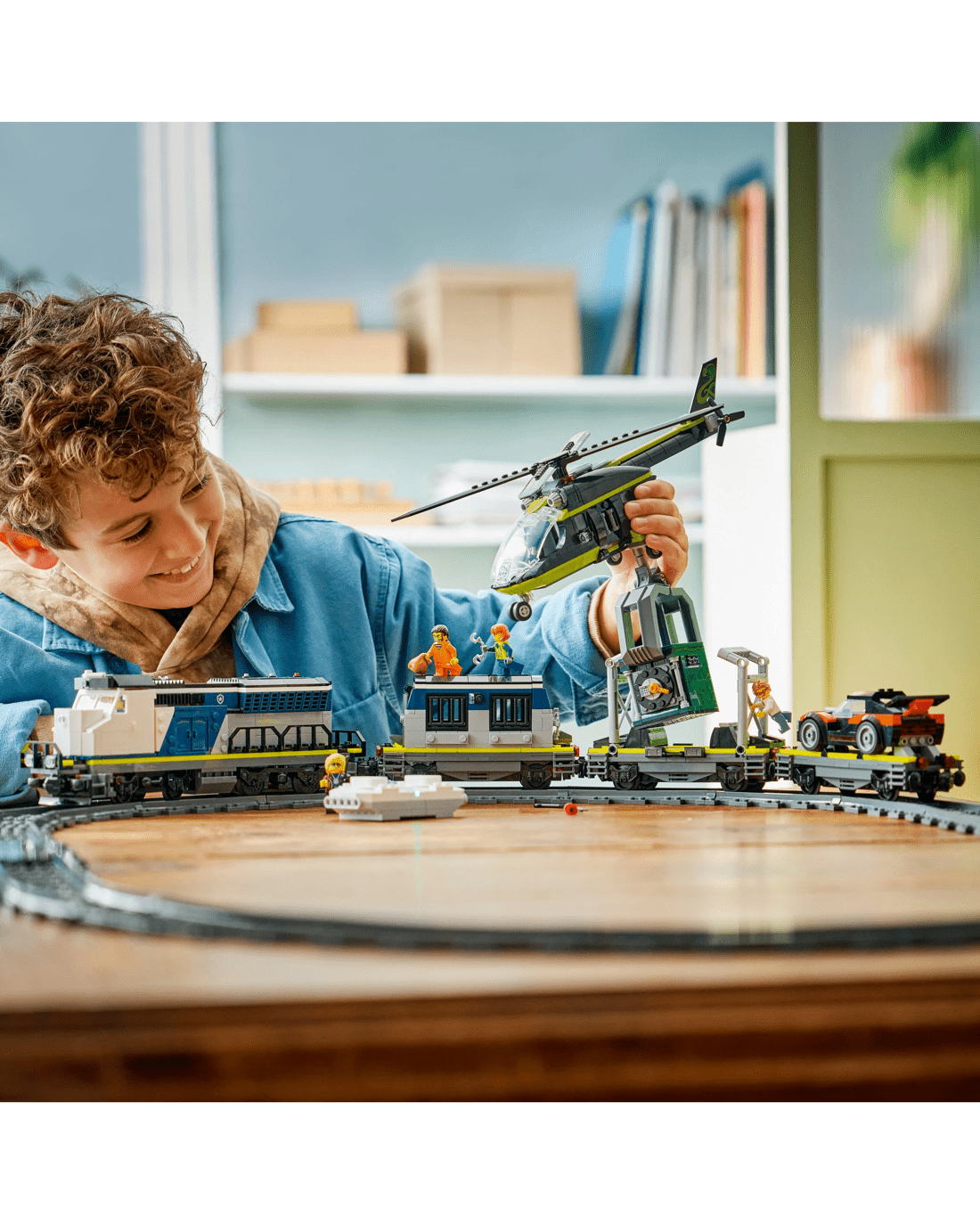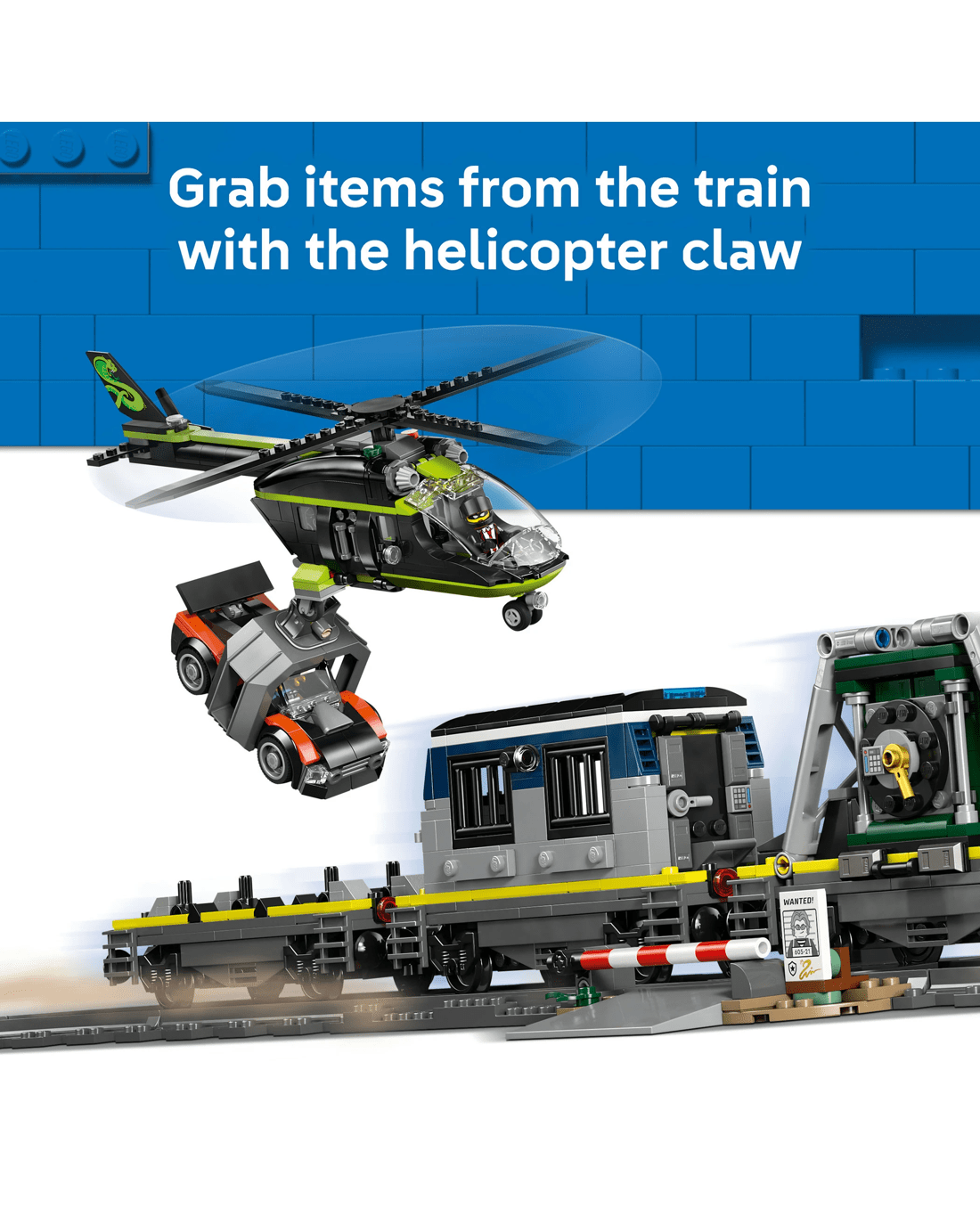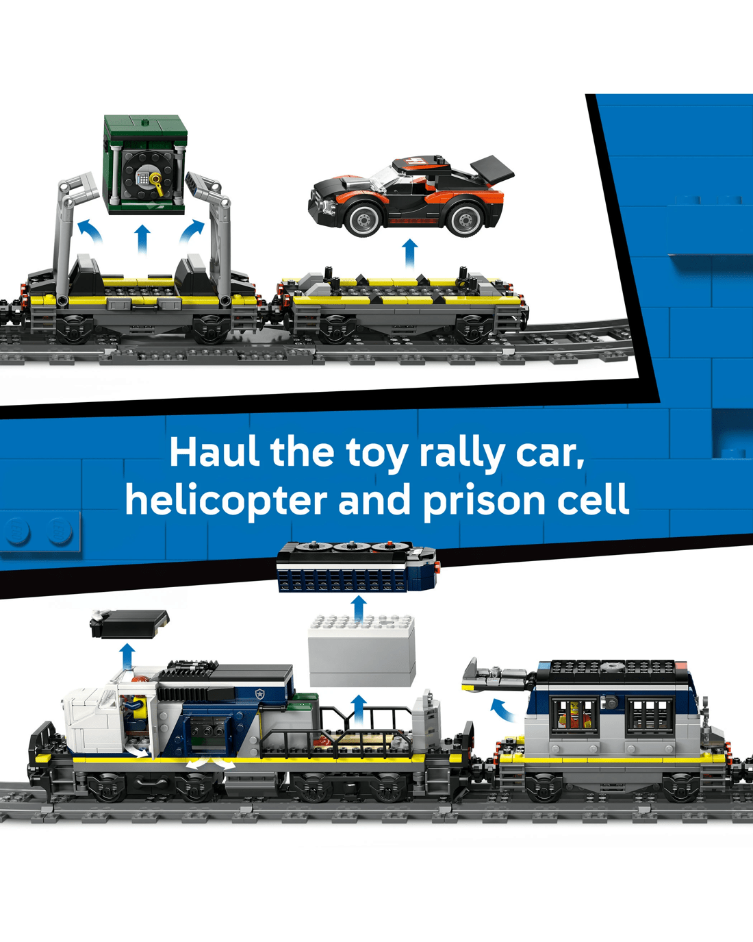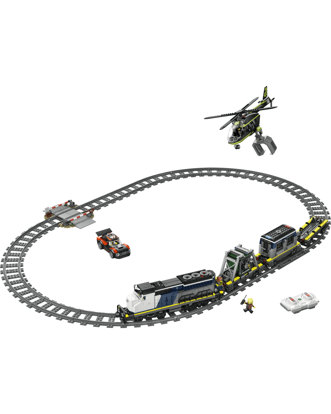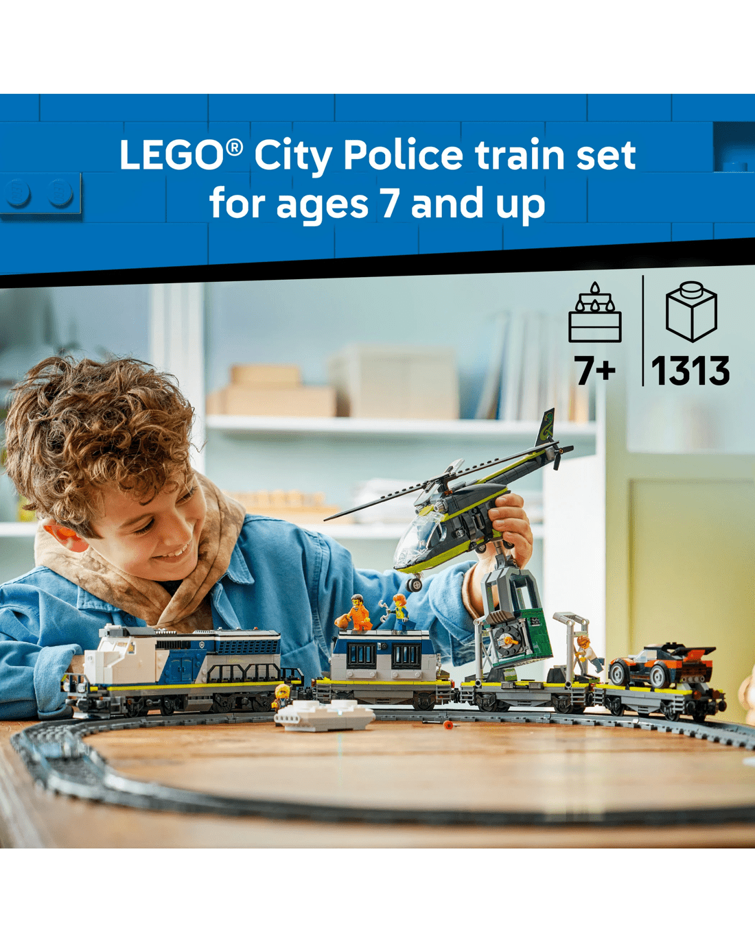 - Toy Train Police Playset - The LEGO City Police Train Heist building kit features a motorised train, plus a helicopter, rally car, tracks and 6 minifigures for imaginative play