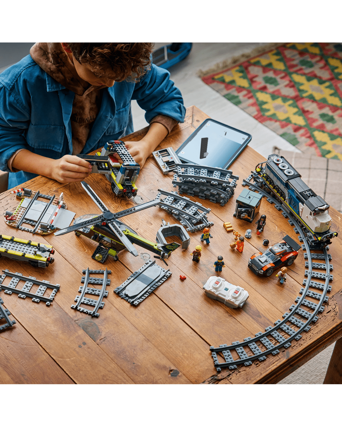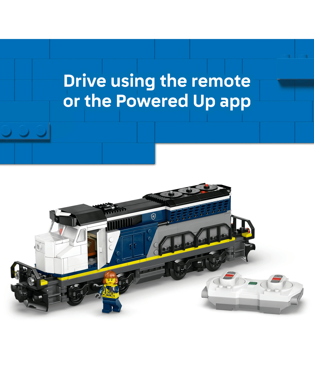 - Electric Train Set for Kids - Comes with an oval train track and a motorised police locomotive that can be controlled via the included remote or a smart device with the Powered Up app