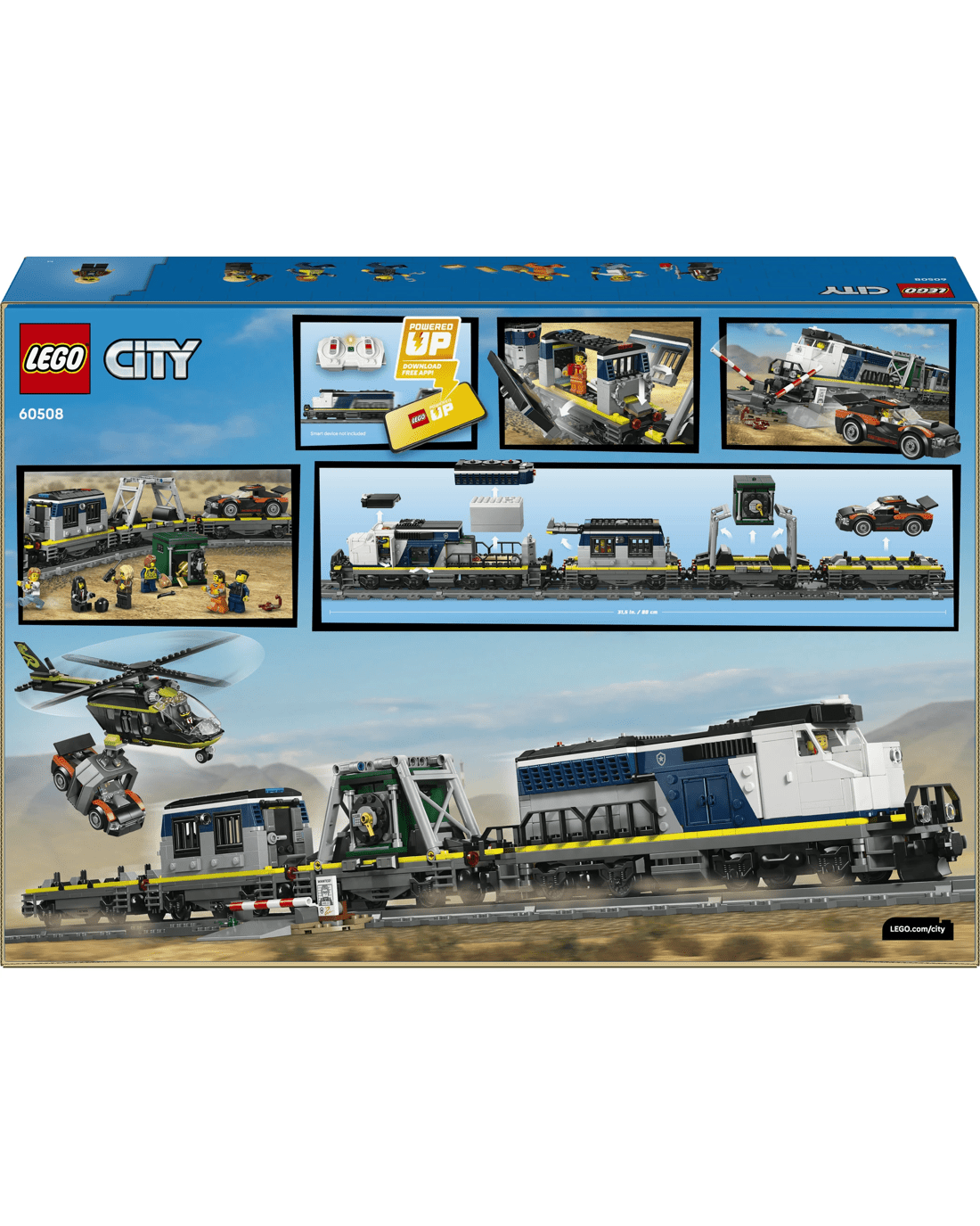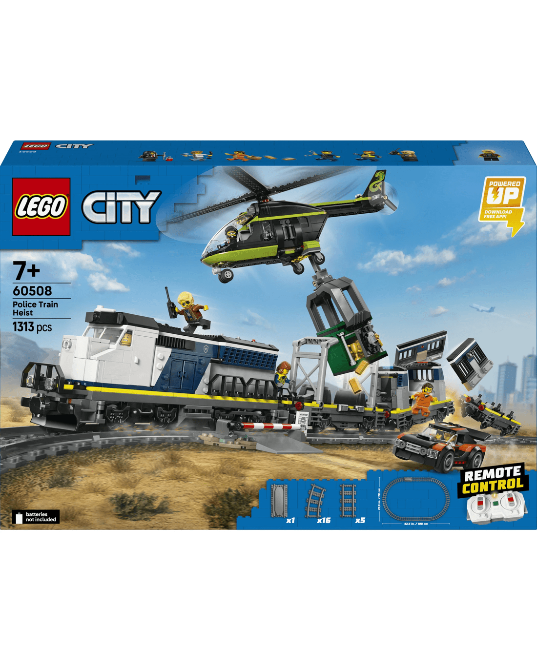- What’s in the Box - This toy train set includes all kids need to build a Powered Up locomotive, 3 flat wagons, a toy rally car, helicopter, prison cell, bank safe, railroad crossing and 6 minifigures