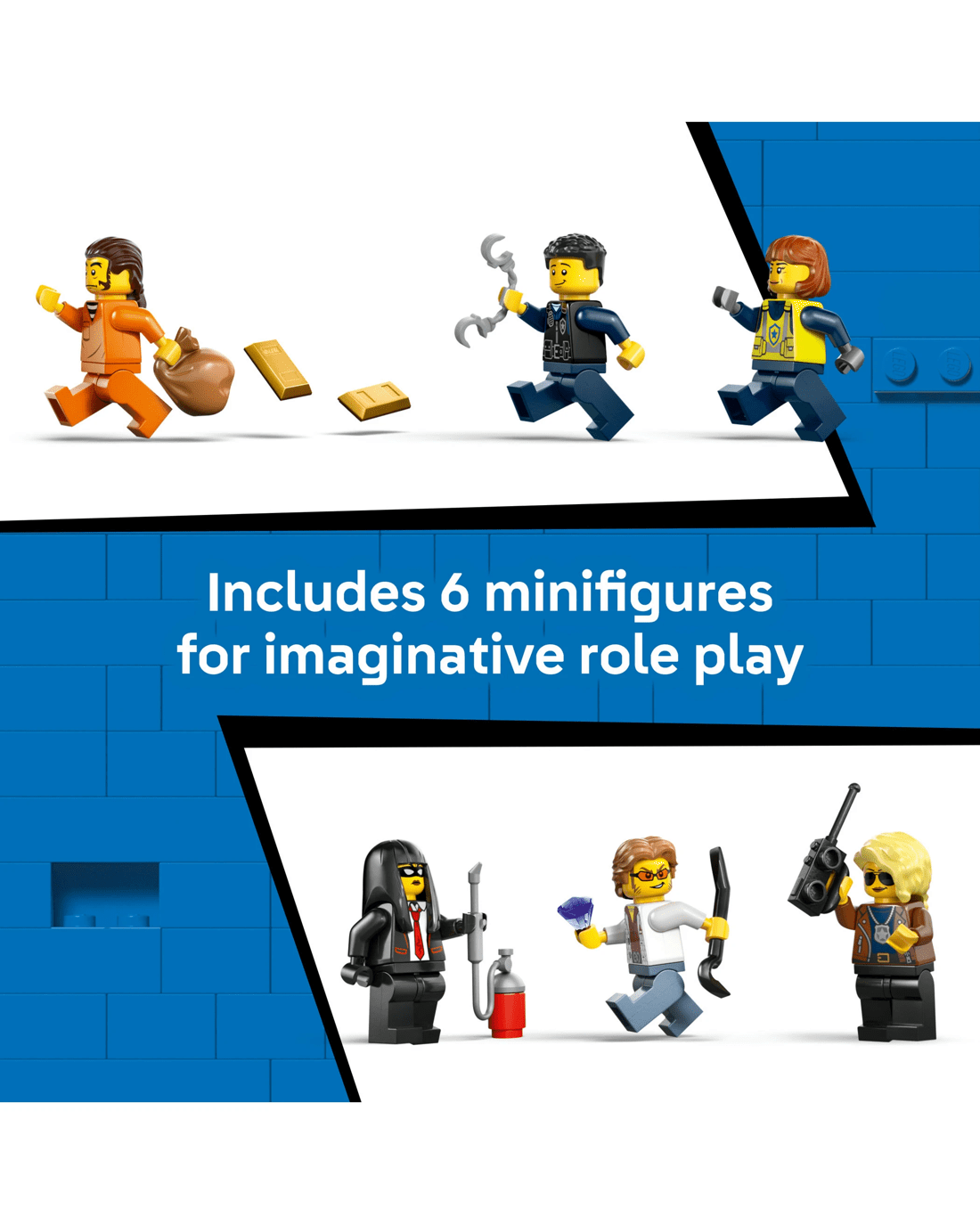 - Fun Features for Storytelling - Functions include a crook’s helicopter with a grabbing claw for heisting the bank safe, rally car and prison cell from the police train