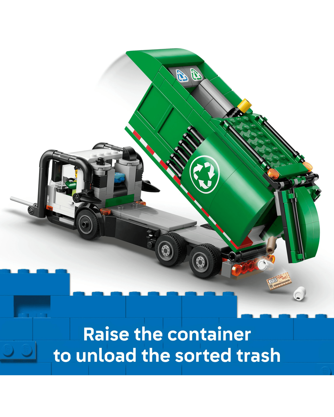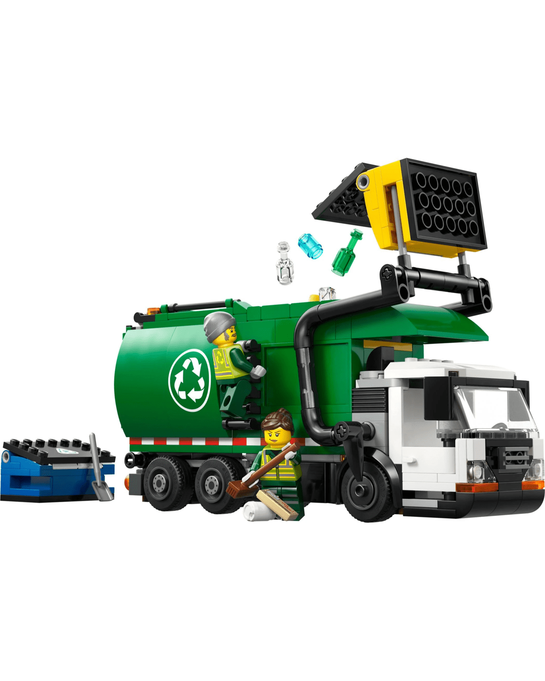 - Buildable Recycling Truck Toy - This model truck kit includes everything kids need to build a detailed toy recycling vehicle and 2 recycling bins, plus driver and worker minifigures