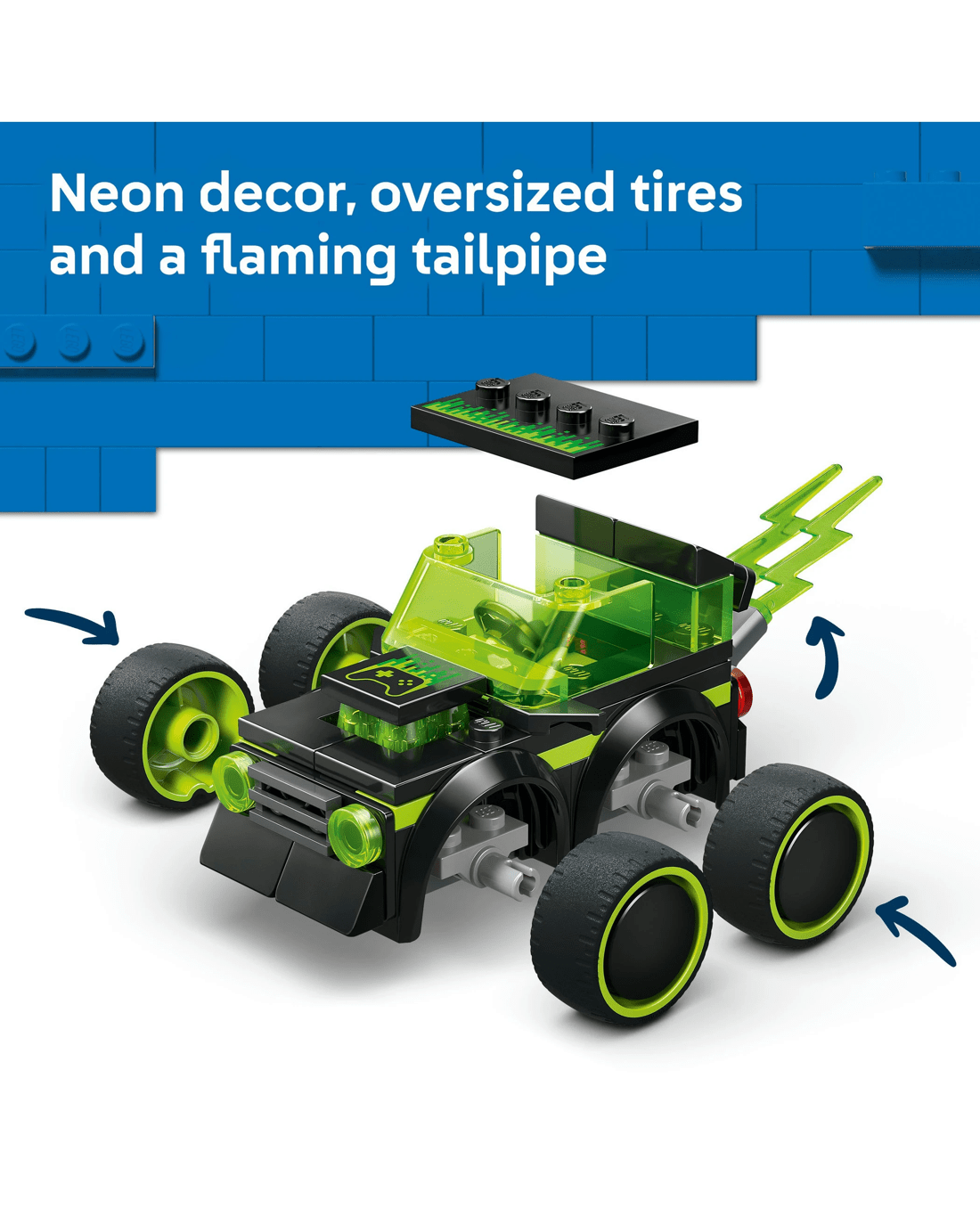 - Mini Car for Creative Play - Features an iconic neon-patterned gaming car design with oversized rubber tyres, a driver's cockpit and a flaming exhaust pipe for imaginative hands-on play