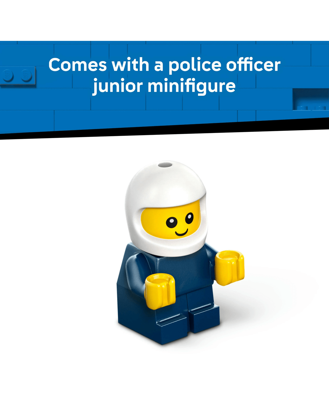 - Rides Police Officer Junior Minifigure - Kids can put the mini police officer behind the wheel and head out on thrilling crook-catching missions