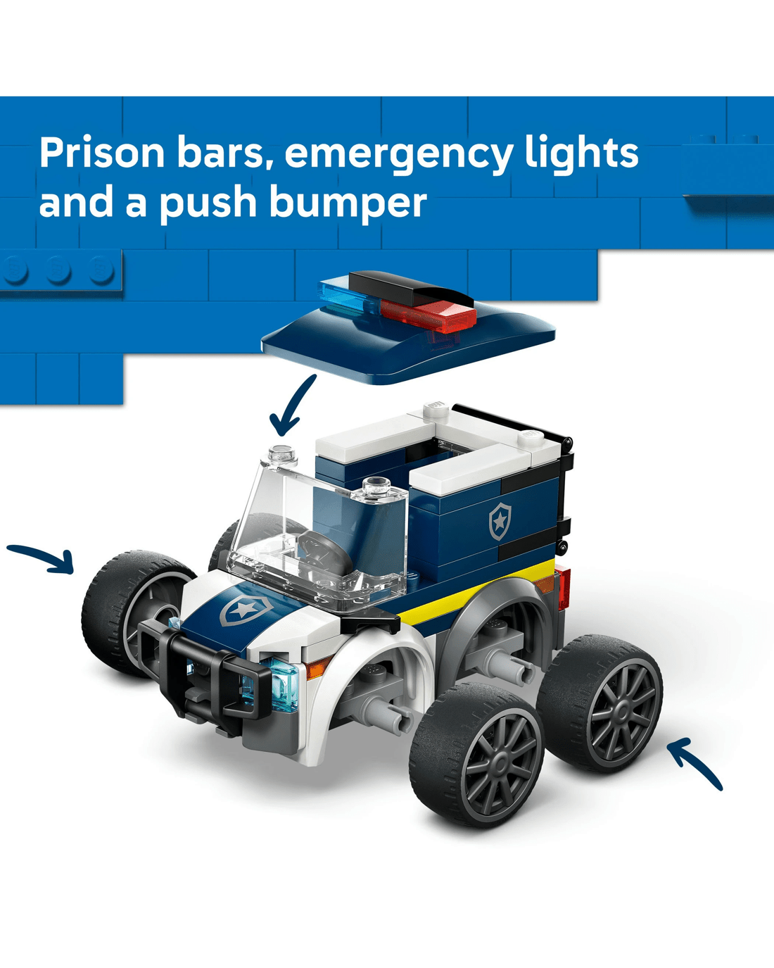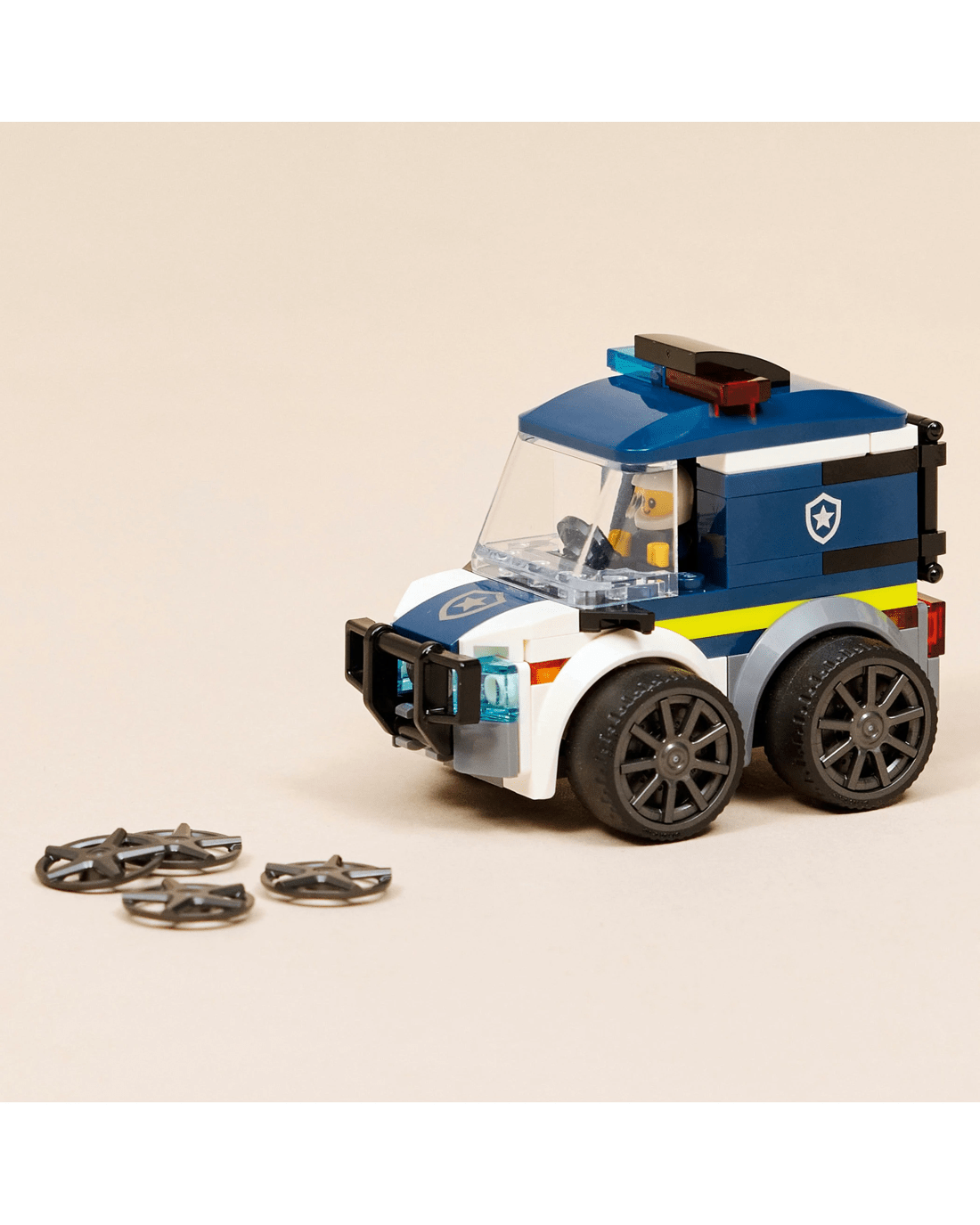 Unleash action-packed police adventures with the LEGO City Rides - Police Truck mini building kit for kids. This compact, buildable toy police truck with cool alloy wheels, low-profile rubber tyres, a push bar, prison bars and toy emergency lights offers young builders a fun way to explore the world of LEGO City. The set also includes a LEGO City Rides police officer junior minifigure that fits perfectly in the driver’s cab for hours of pretend play.