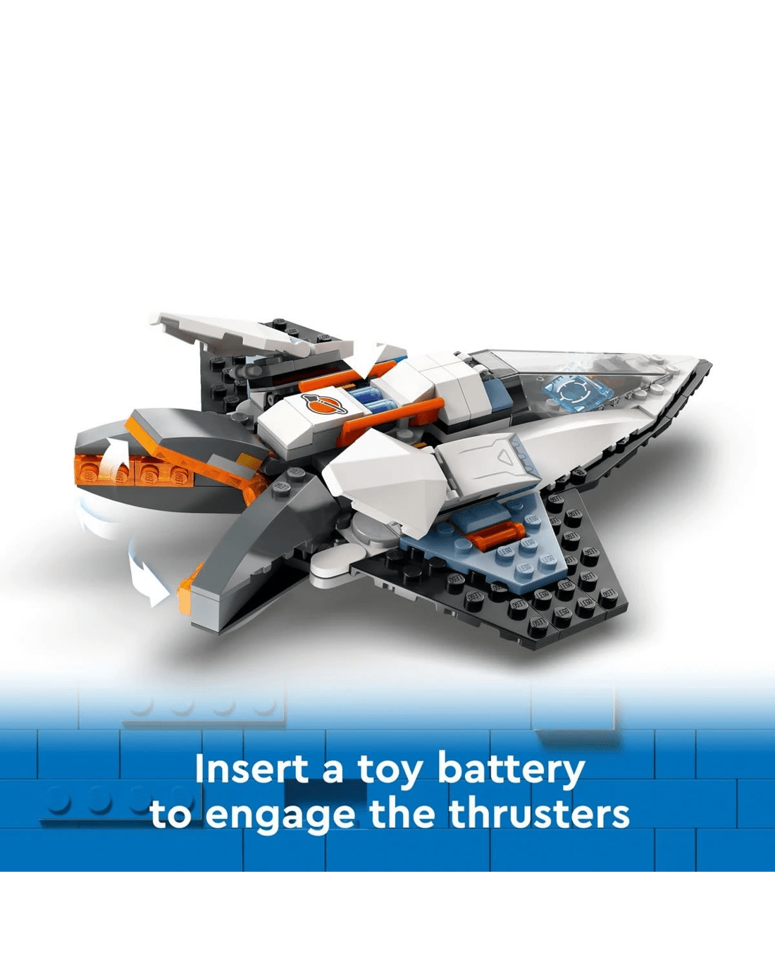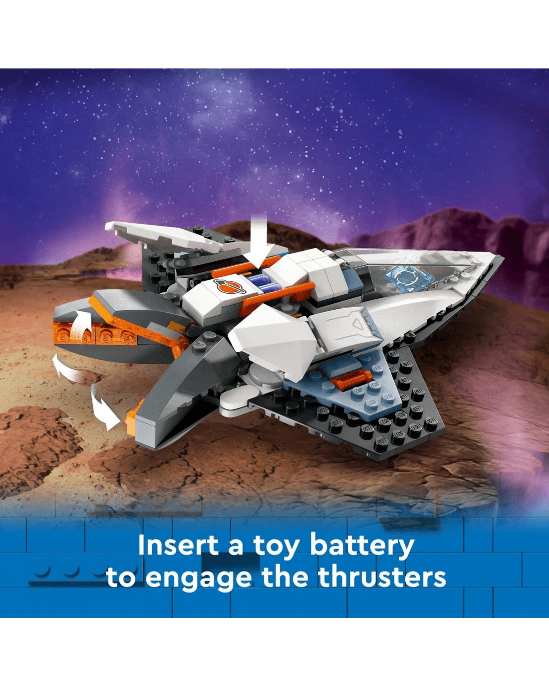 Space adventurers can enjoy thrilling intergalactic action with this futuristic LEGO City Interstellar Spaceship toy playset for kids. This single-seat spacecraft is built for speed. Kids can insert a toy battery pack to engage the fold-out main thrusters for lightning-fast travel to the far reaches of space. The set also includes a drone bot that converts to a jetpack for the included space crew minifigure. Take your space fan on an exciting adventure!