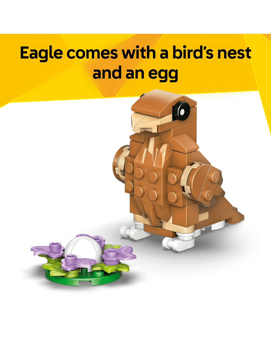 Kids can choose to build a toy hamster with a posable head and front legs and a purple flower. They can also rebuild it into a hedgehog toy with a flower or a posable eagle with its egg in a nest. Once the building and playtime fun is over, each model can be displayed as cute room decor on a shelf or desk.