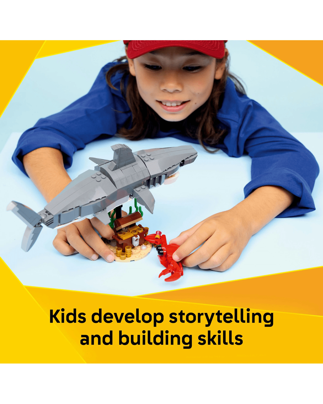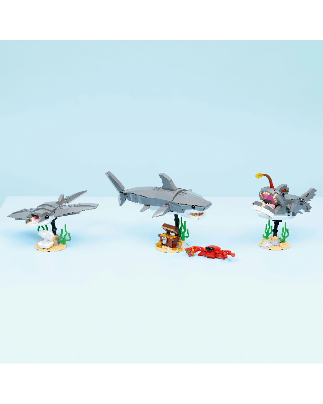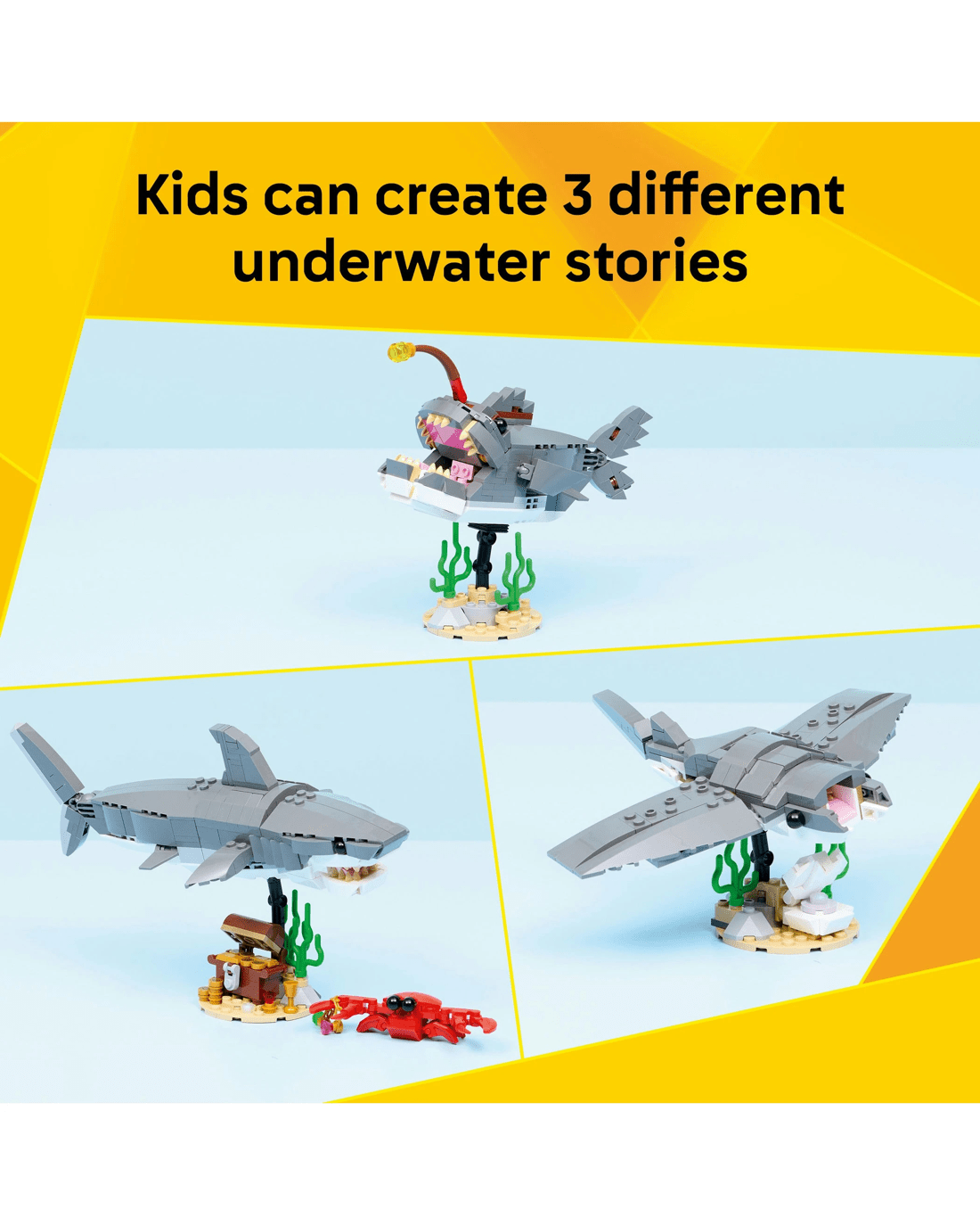 - Endless Pretend-play Options - Kids can enjoy fun stories with 3 sea creature toys (models cannot be built simultaneously): a shark toy with a treasure chest or an anglerfish or manta ray