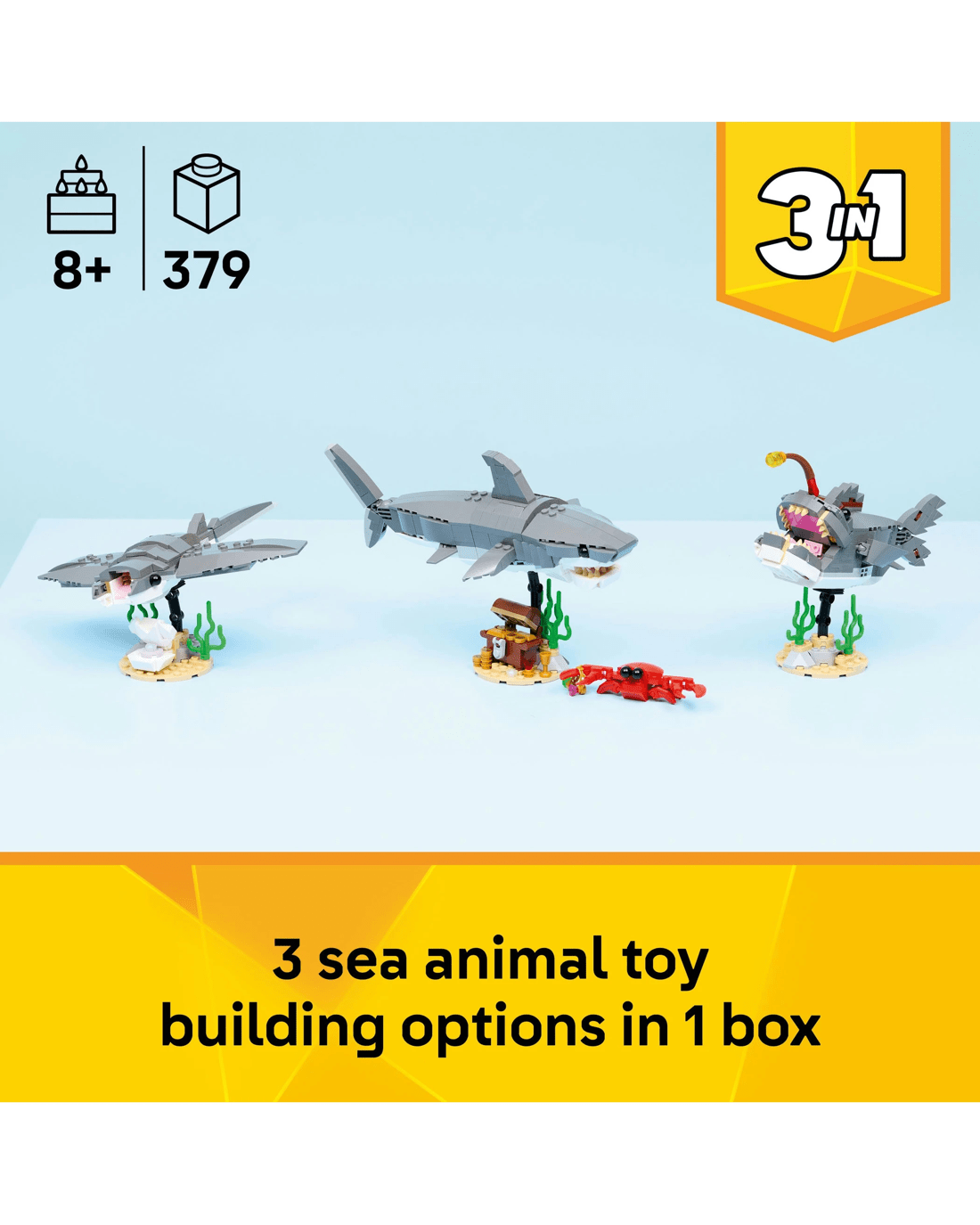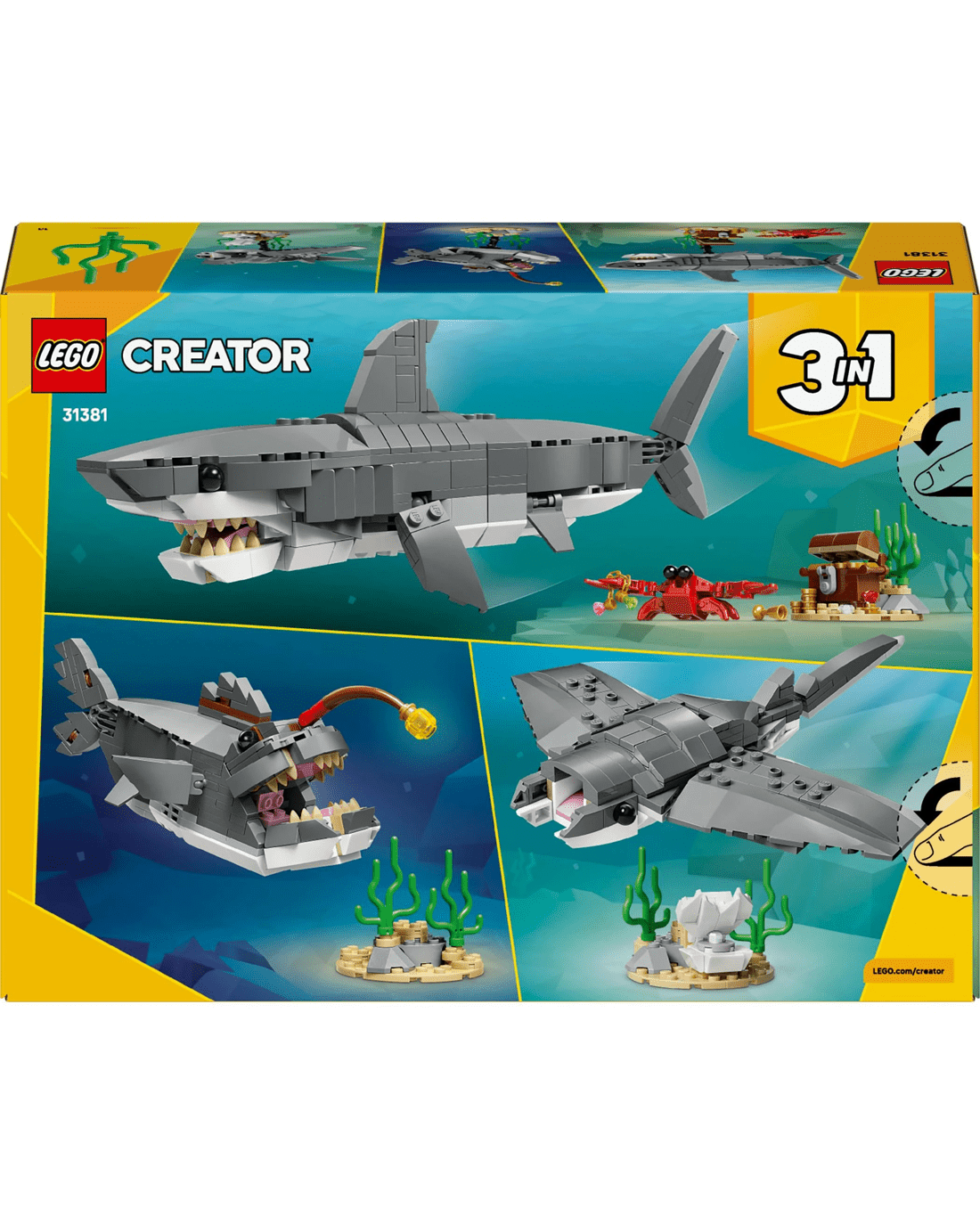 - 3 in 1 Sea Animal Toys - LEGO Creator 3 in 1 Fierce Shark with a Treasure Chest building toy lets boys and girls build and rebuild 3 ocean animal figures with the same bricks
