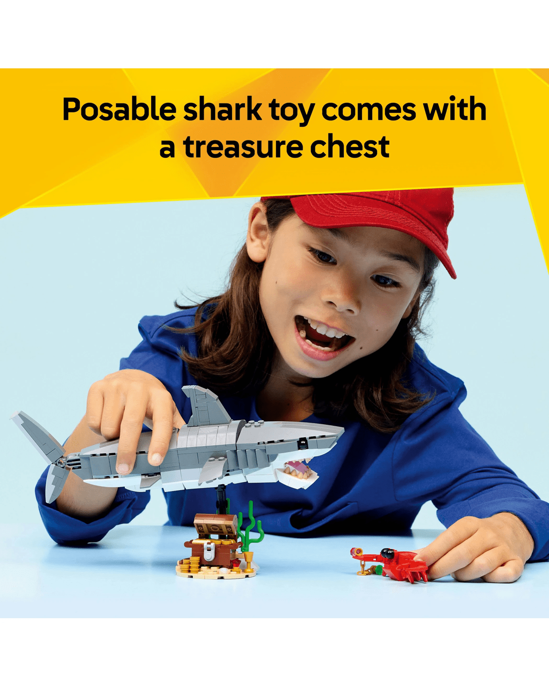 Boys and girls can play out fun underwater stories with this LEGO Creator 3 in 1 Fierce Shark with a Treasure Chest building toy. This impressive sea animal toy set offers kids three different building options with the same set of bricks.