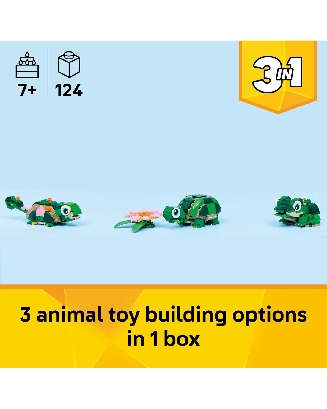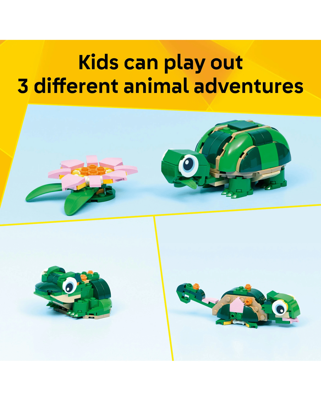 - 3 in 1 Animal Toy for Kids - LEGO Creator 3 in 1 Turtle with a Water Lily Flower building toy lets girls and boys build and rebuild 3 cute animal figures with the same bricks