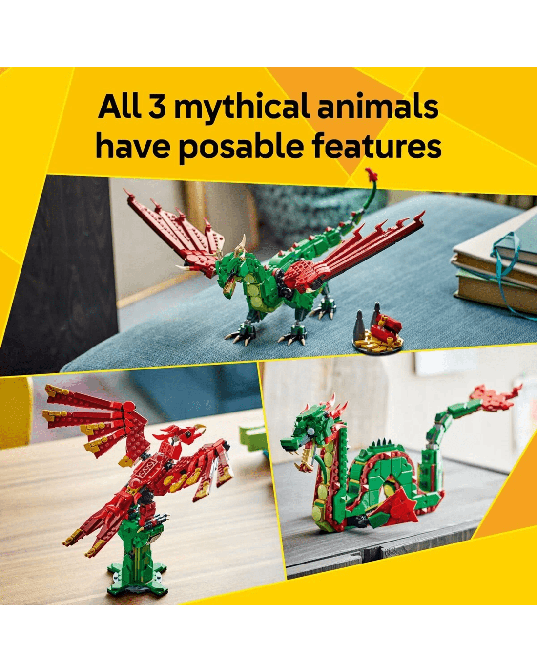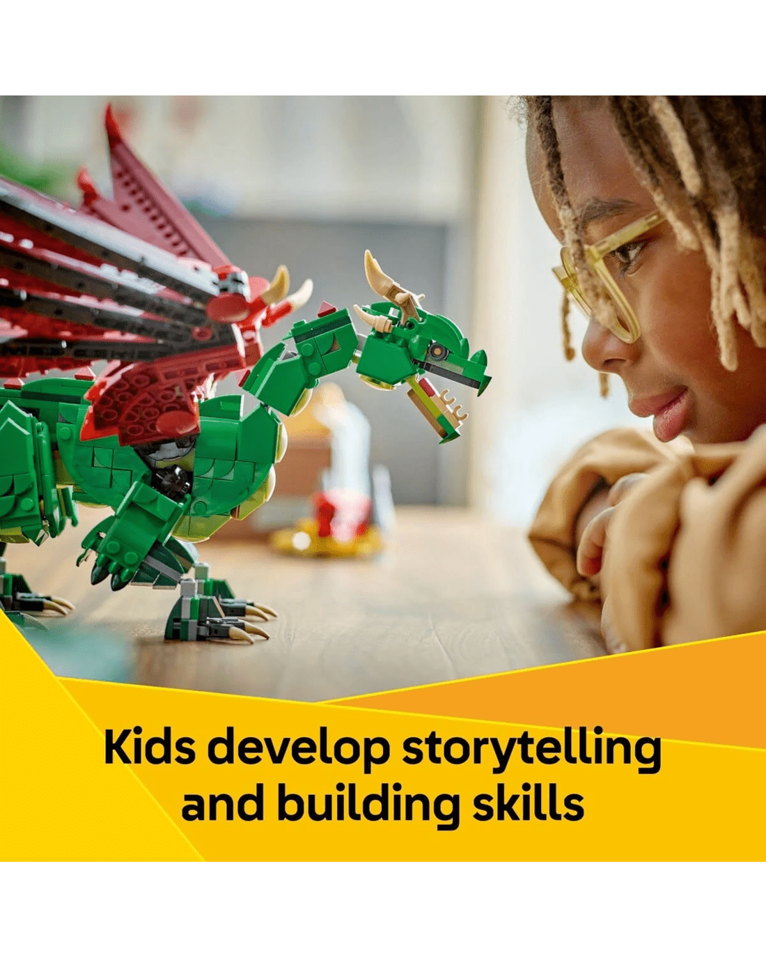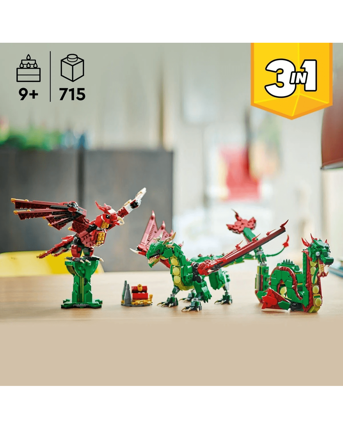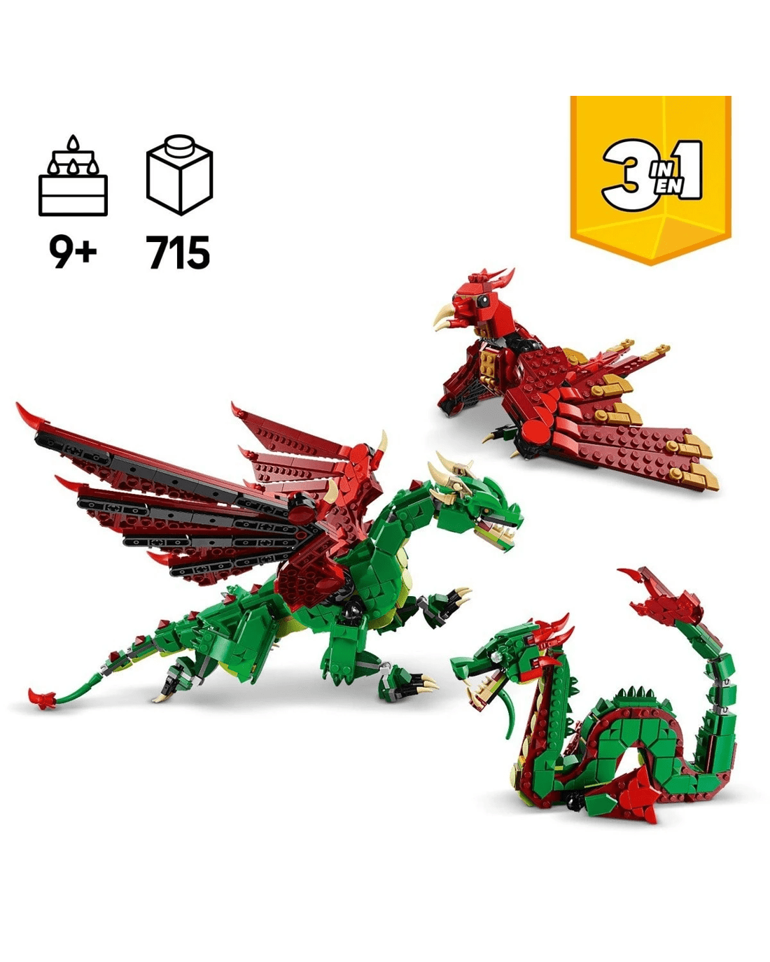 - 3 medieval creature toys in 1 box - The LEGO Creator 3-in-1 Medieval Dragon toy lets boys and girls build and rebuild 3 different fantasy animal toys using the same bricks