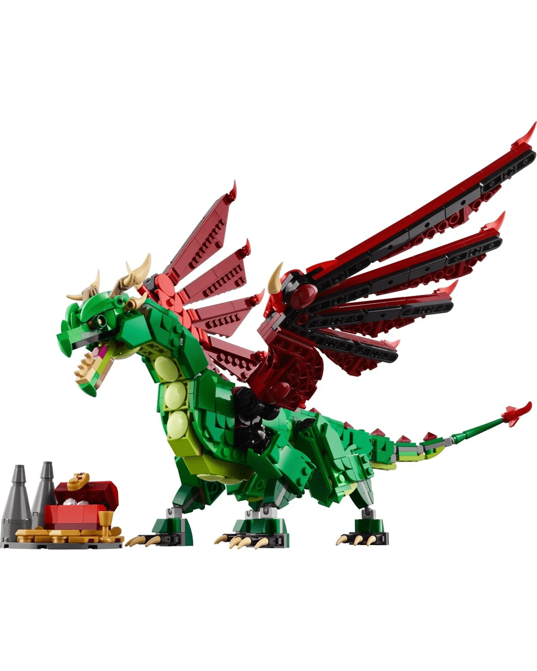 Delight your little time traveller with this LEGO Creator Medieval Dragon creature toy playset. Featuring a dragon figure that lets boys and girls role-play thrilling medieval action, it has a pair of large posable wings that move up and down and fold in and out, as well as posable ankles, toes, neck, jaw, hips and shoulders. It also comes with a treasure chest for added play value.
