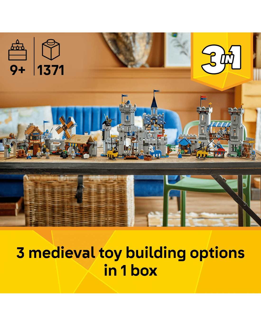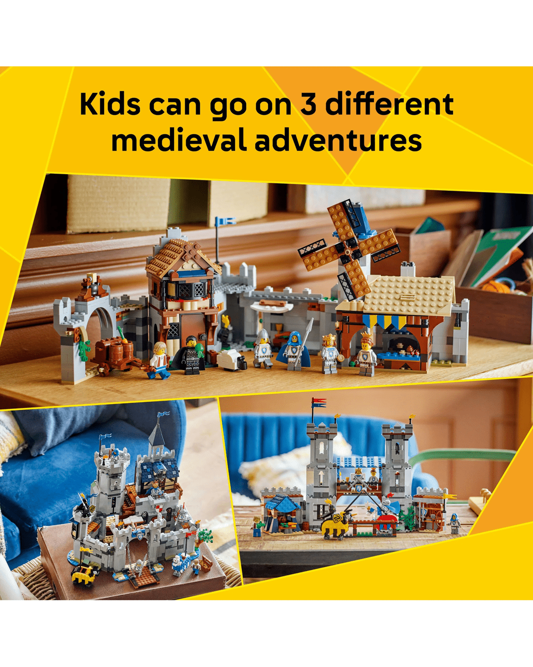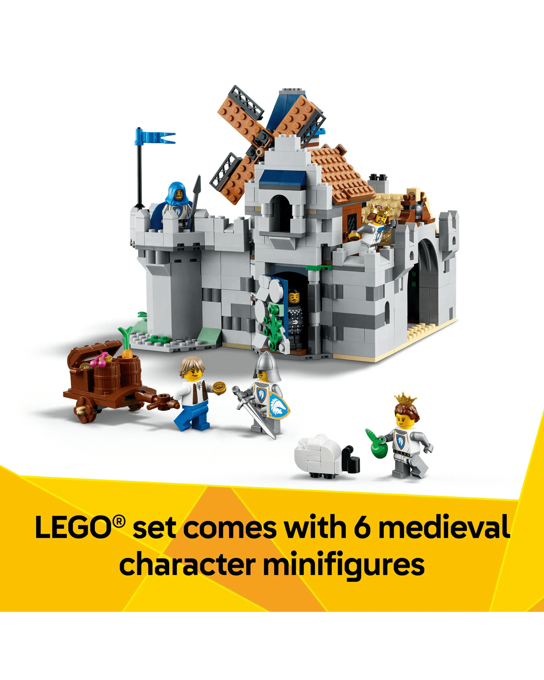 Boys and girls have the choice of three different building options: an interactive castle playset, a jousting set with a small castle or a medieval town playset with a windmill. Each playset comes with six minifigures: a horse knight king, horse knight champion, horse knight archer, horse knight spearman, blacksmith and serpent knight, plus 2 posable horses.
