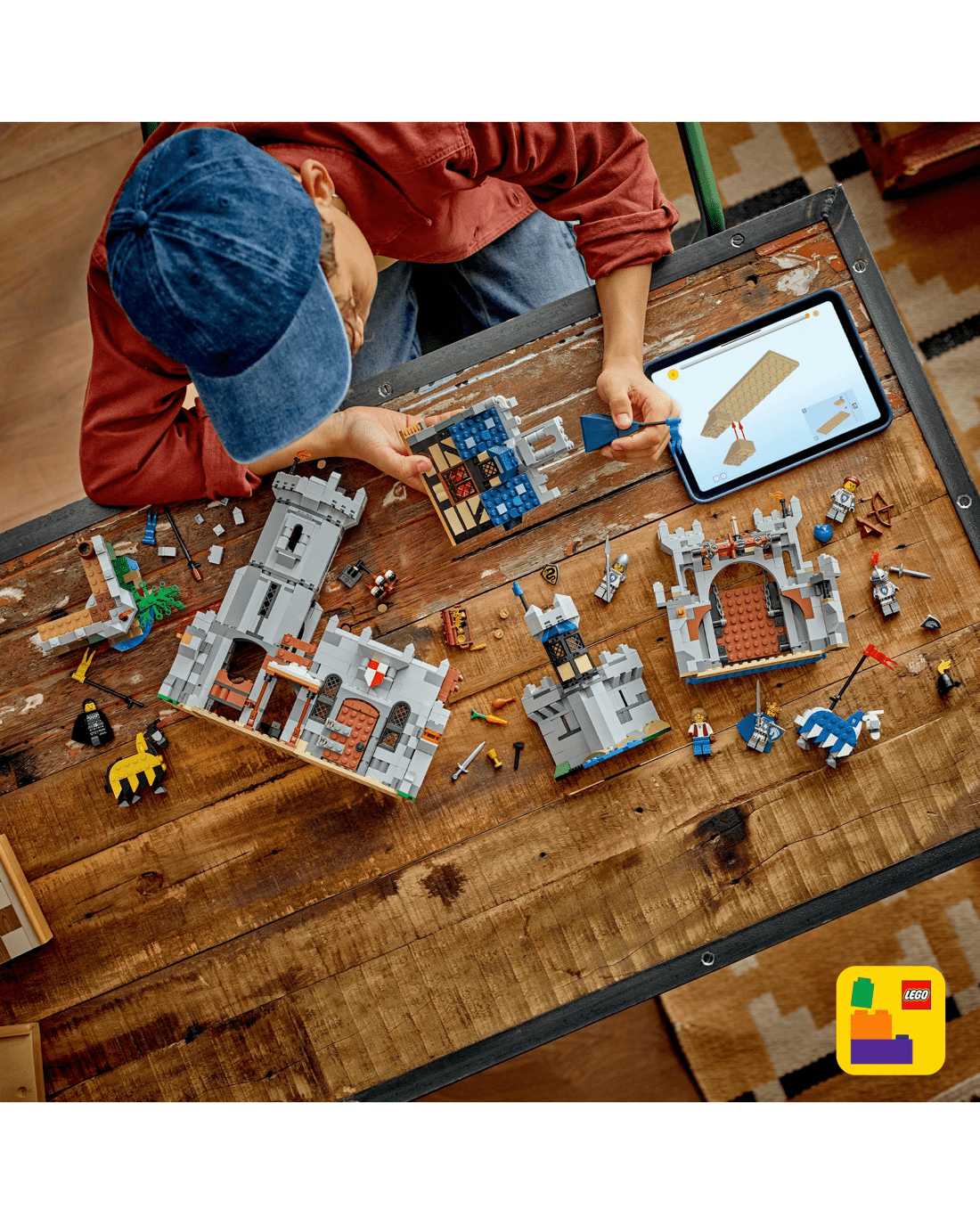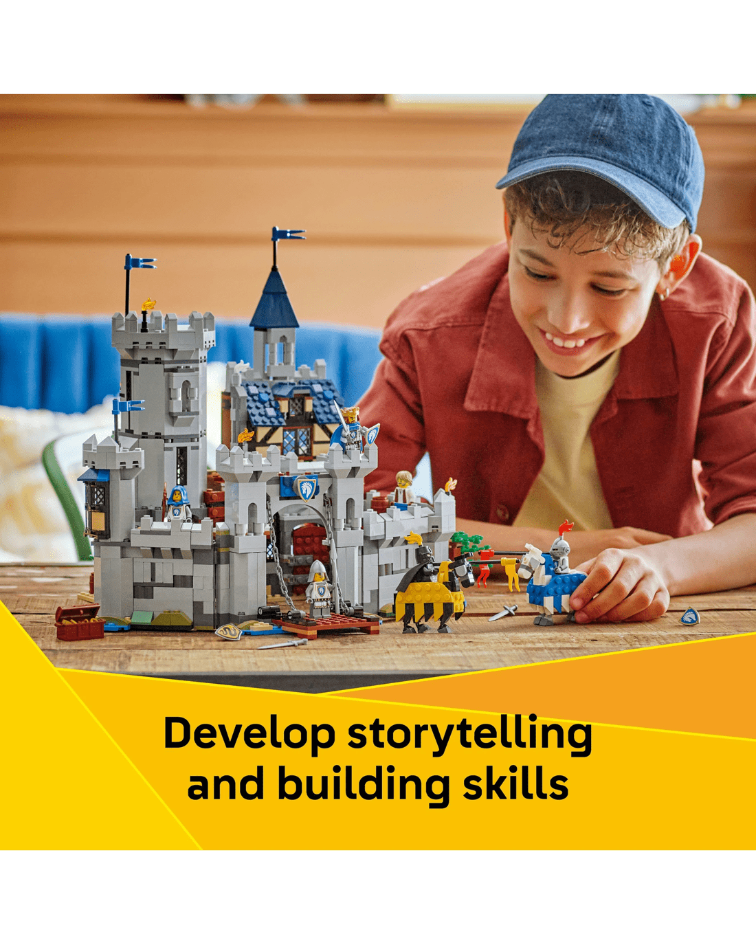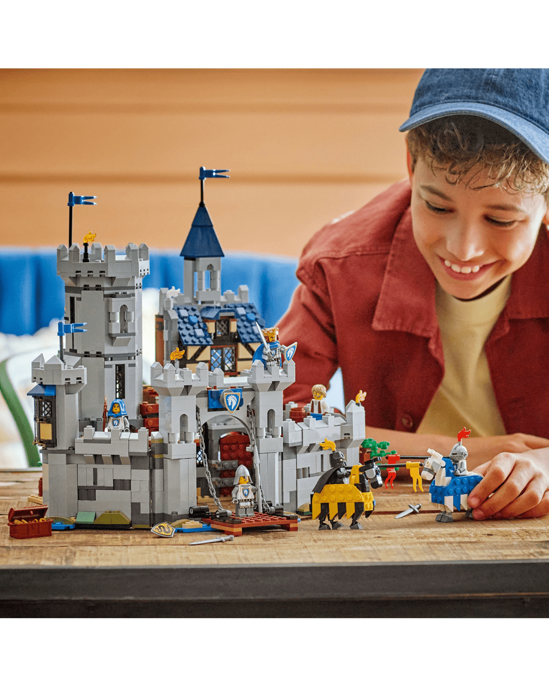 Boys and girls have the choice of three different building options: an interactive castle playset, a jousting set with a small castle or a medieval town playset with a windmill. Each playset comes with six minifigures: a horse knight king, horse knight champion, horse knight archer, horse knight spearman, blacksmith and serpent knight, plus 2 posable horses.