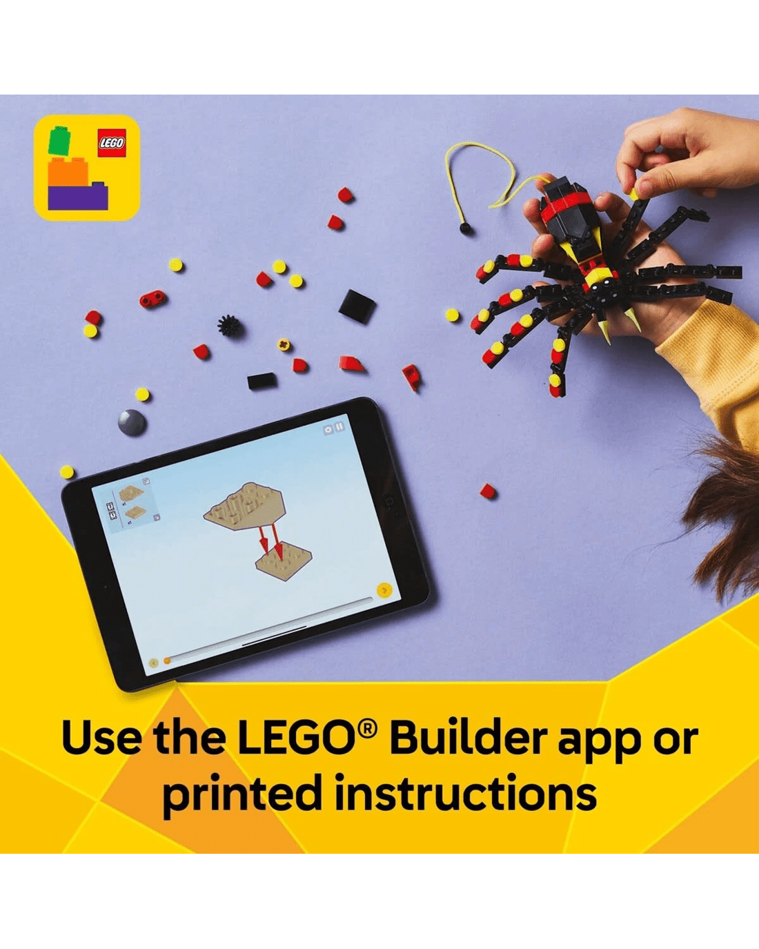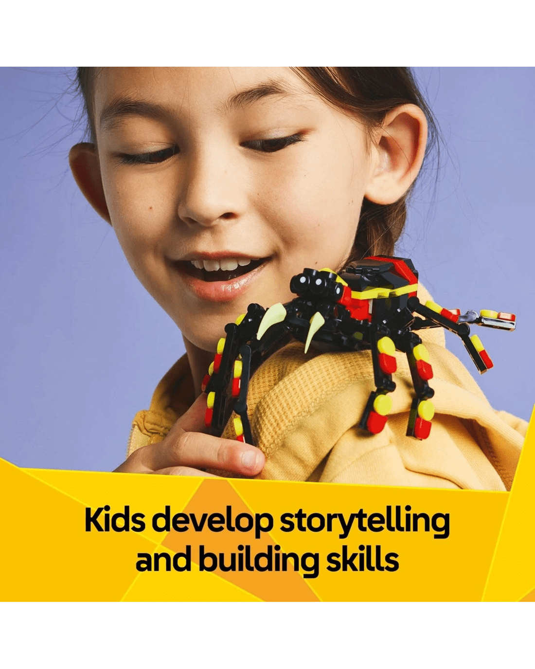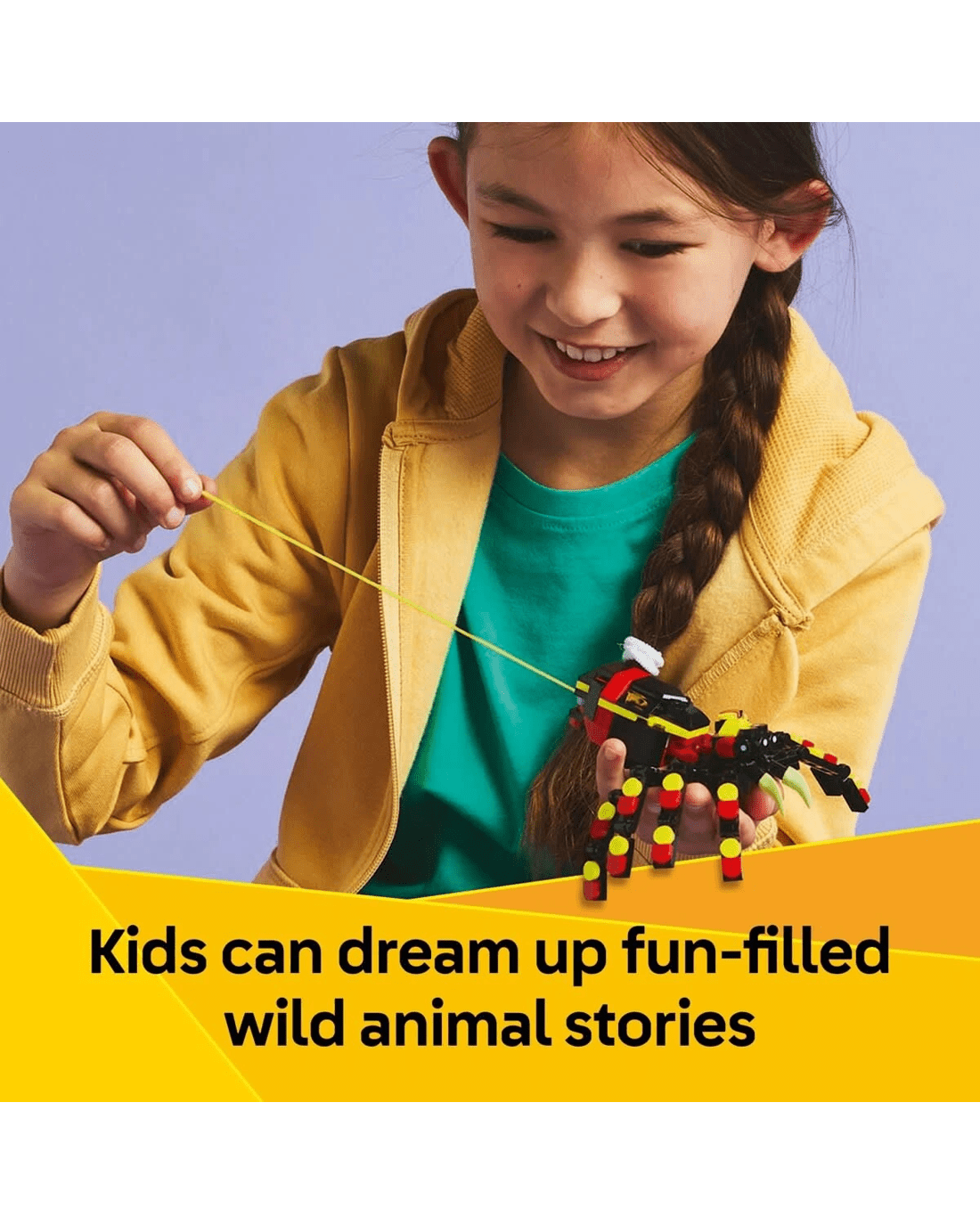 - Spider LEGO set for play and display - Animal figures can be displayed after playtime and kids can pull out a neon-yellow web from the spider toy's back to hang it from a LEGO brick