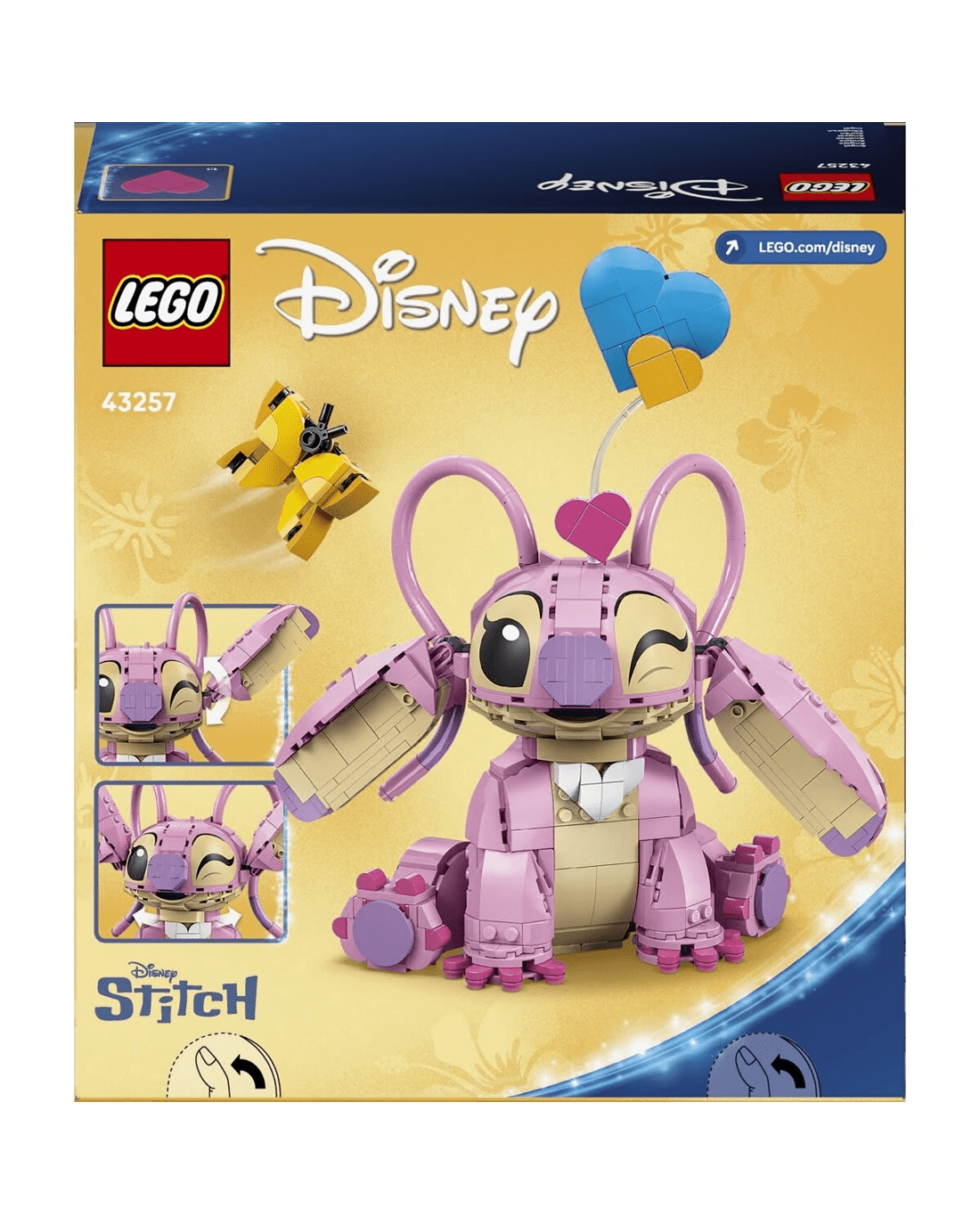 Thrill Lilo & Stitch fans and kids with this detailed Angel LEGO Disney building toy, featuring a posable construction model. Angel, from Disney's Lilo & Stitch TV show, has movable ears and antennae on the back of her turning head. There's also a butterfly and three 'floating' hearts that can be built and used for decoration. Angel is a great gift-giving idea for fans of Disney's Lilo & Stitch and girls and boys to create, play with and display anywhere.