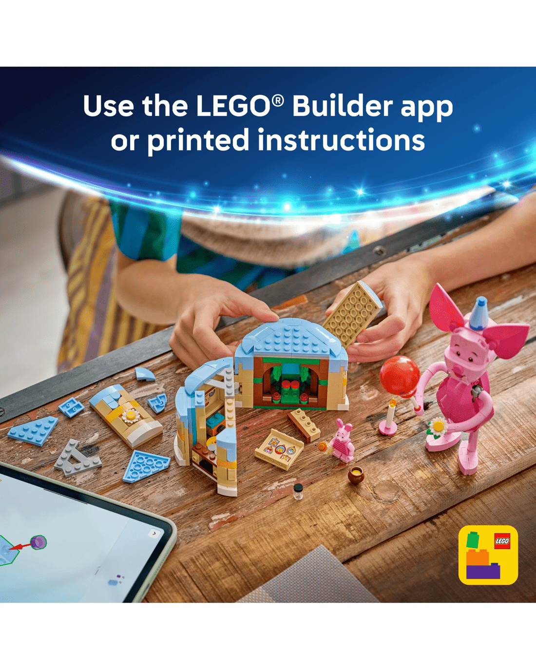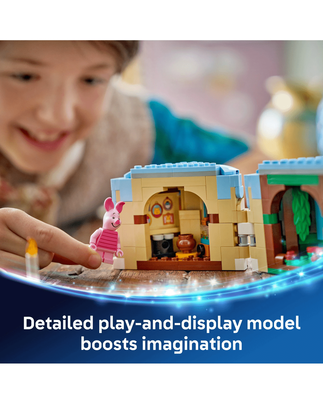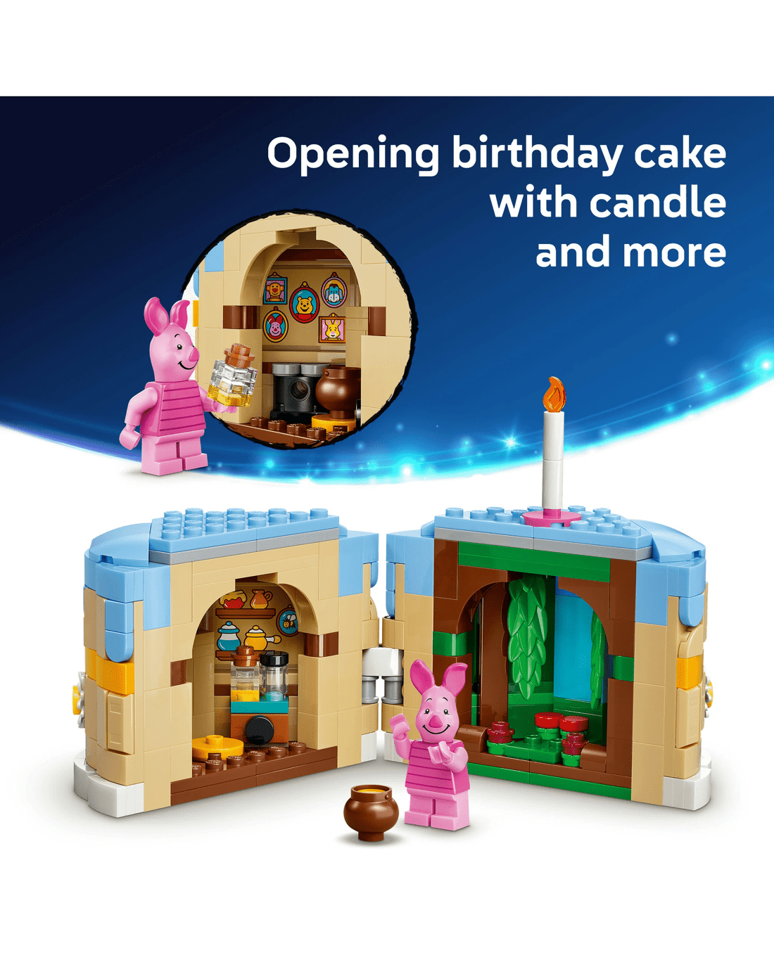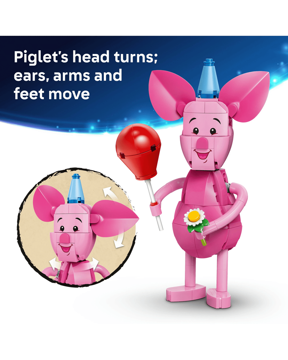 - Beloved Companion - This up-scaled Piglet’s Birthday Fun toy building set presents the Disney character, along with a birthday cake with candle, a LEGO Disney Piglet minifigure and more