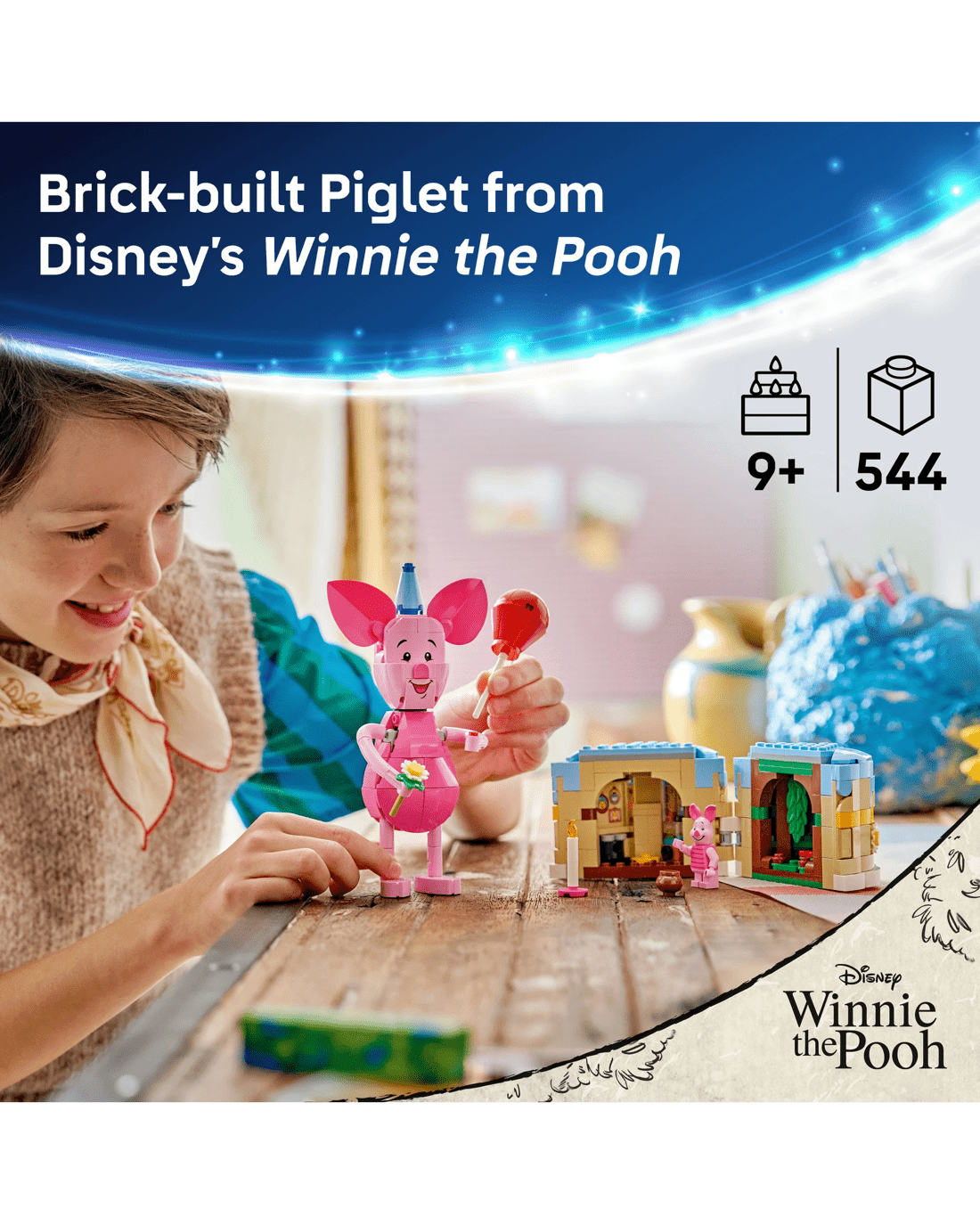 - Dimensions- Piglet from Disney’s Winnie the Pooh movie in this 544-piece LEGO Disney display building set stands over 17cm tall.