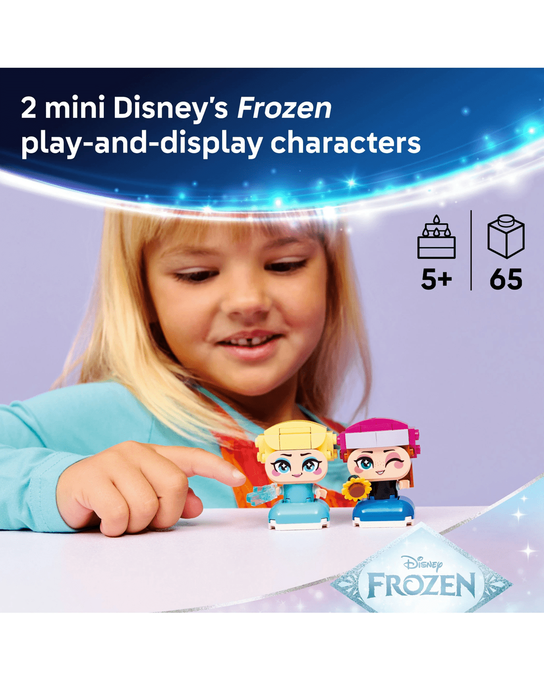 Treat kids to this LEGO Disney Frozen Mini Anna & Elsa Frozen toy building set. The small Elsa and Anna movie characters are designed to spark storytelling and play, with the included ice bolt and sunflower accessories. Each character has movable arms and can hold an accessory. They are also perfect for a cute display and are part of a larger collectable series that includes other brick-built Disney Princess character toys.