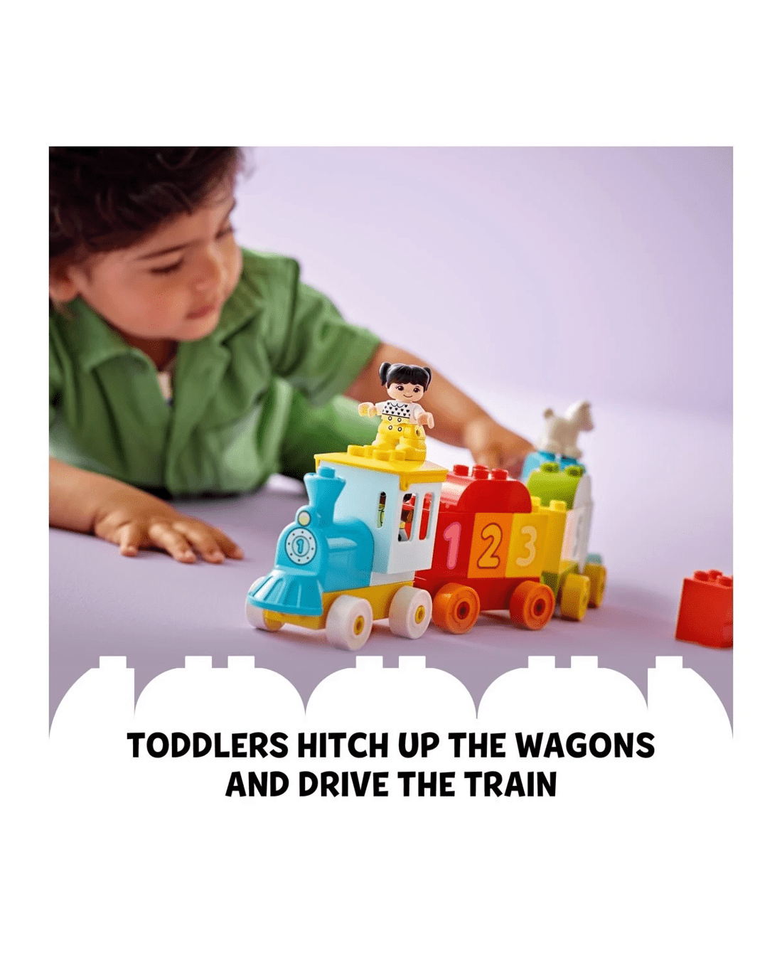 The perfect preschool introduction to numbers - Toddlers can place the number bricks on and off the wagons, line them up in the correct order and build them together into a number wall. With moving wheels, an opening roof and friendly DUPLO characters to share the fun, the Number Train will transport your toddler to a world of imaginative, developmental play!