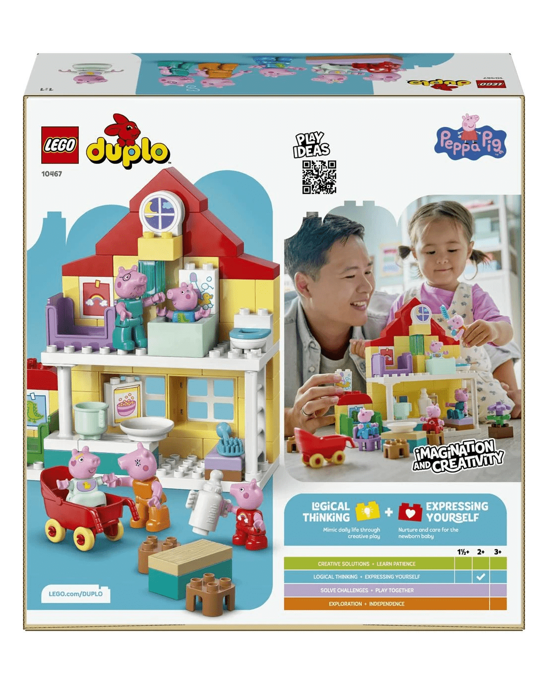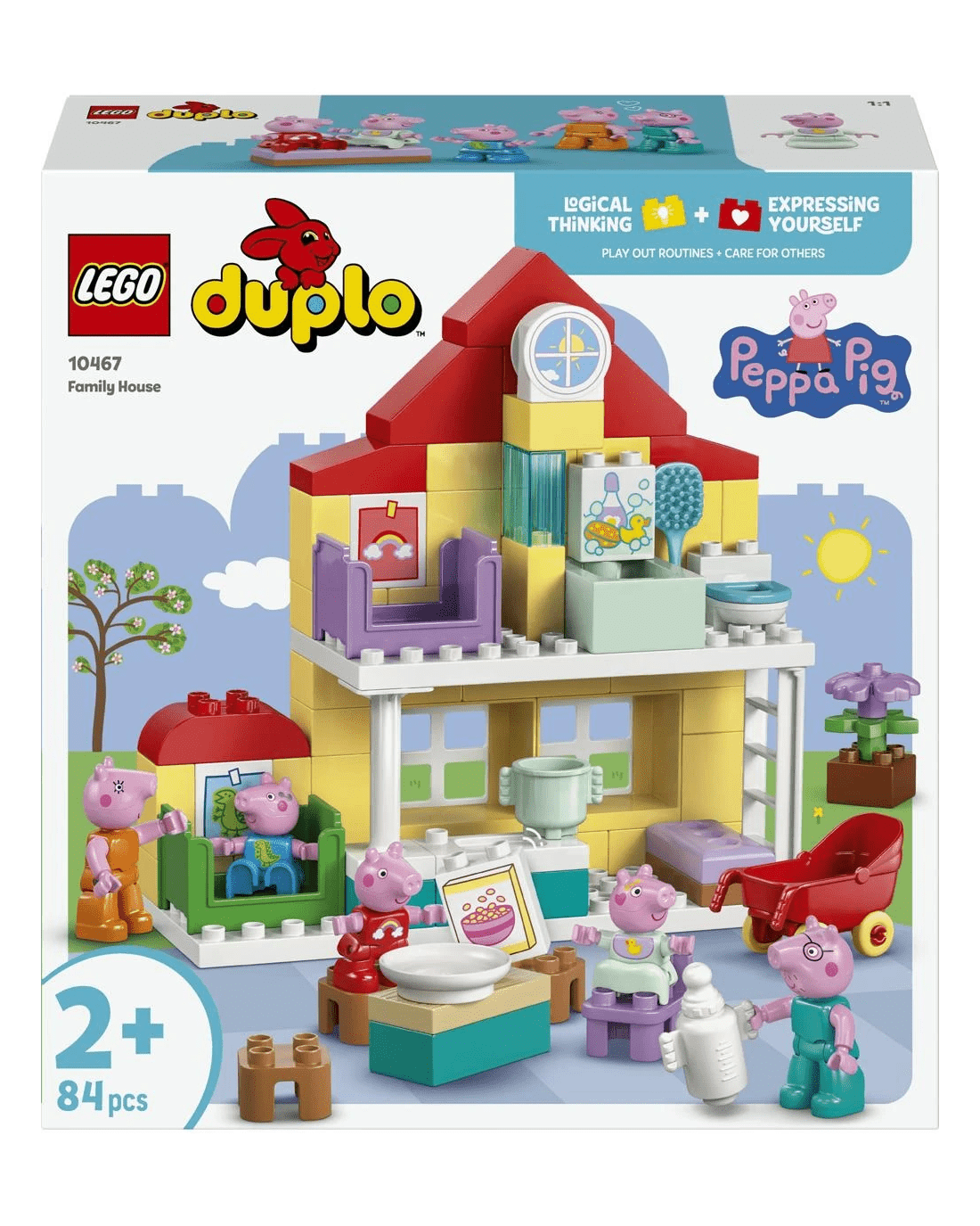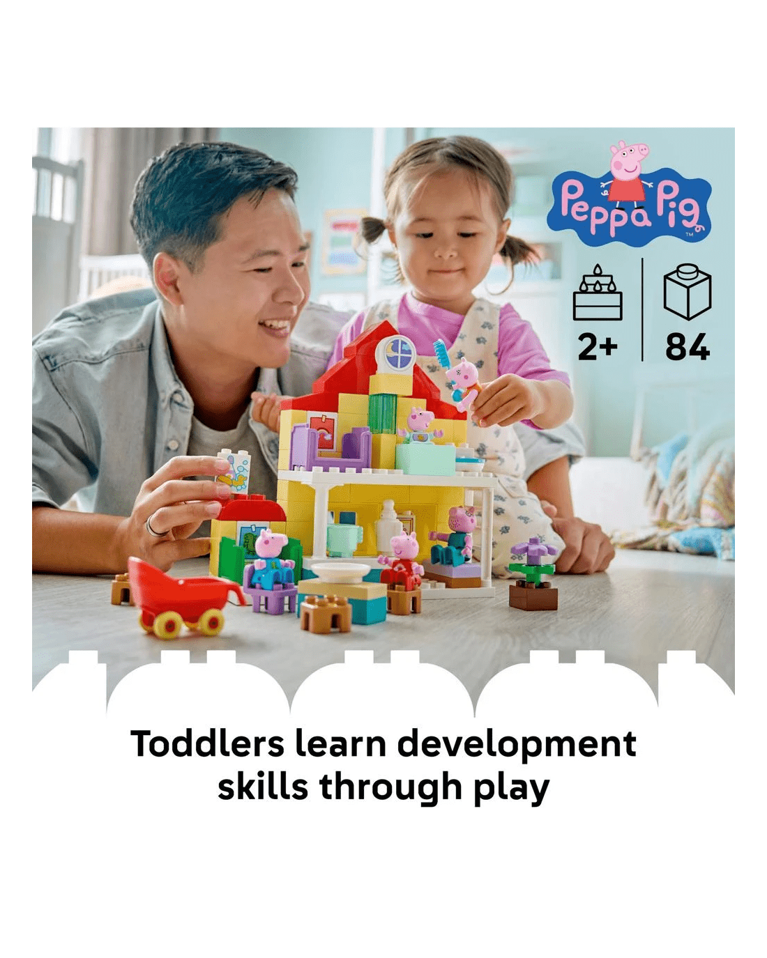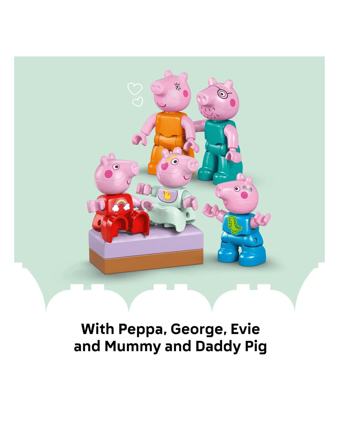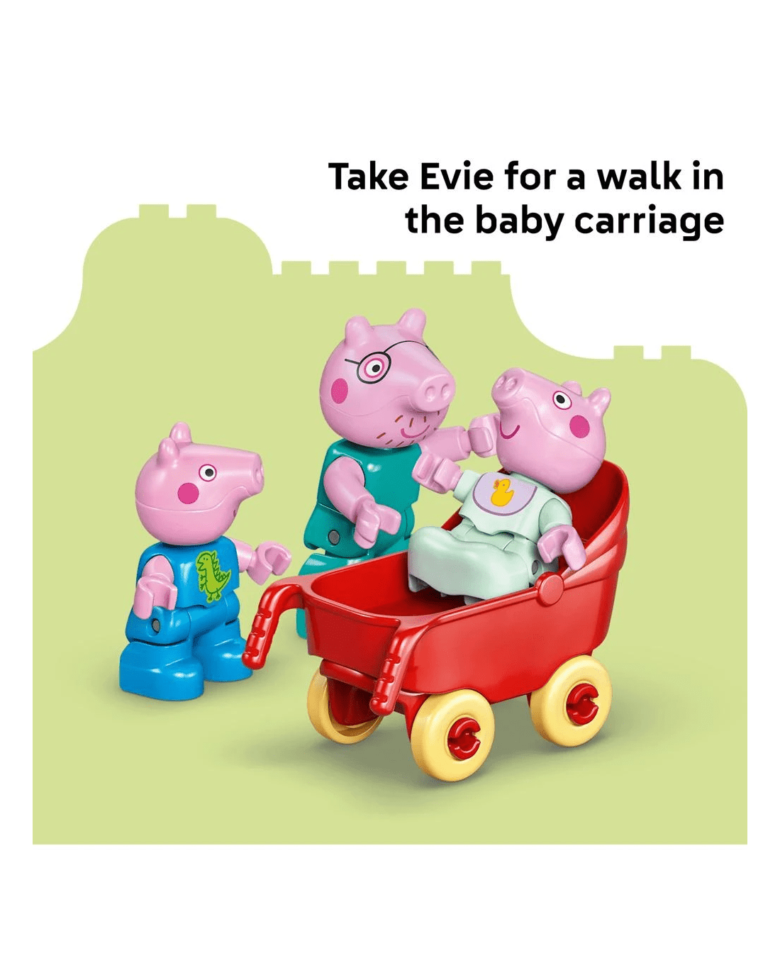 With this building set's five LEGO DUPLO figures - Mummy Pig, Daddy Pig, George, Evie and Peppa Pig - kids can grow their emotional intelligence as they imagine having a new family member. Packed with accessories for imaginative play, this toddler learning toy lets little builders imagine caring for the baby by taking her for a walk in the buggy, feeding her with the bottle or giving her a bath. Contains 84 pieces.