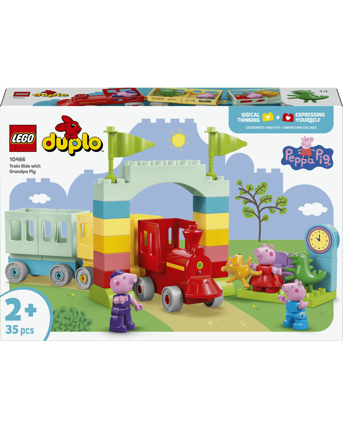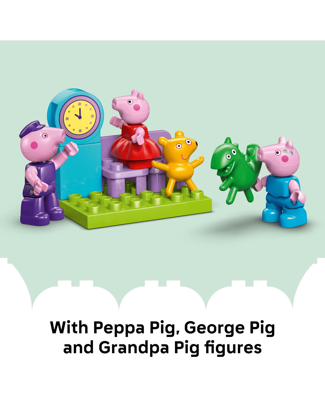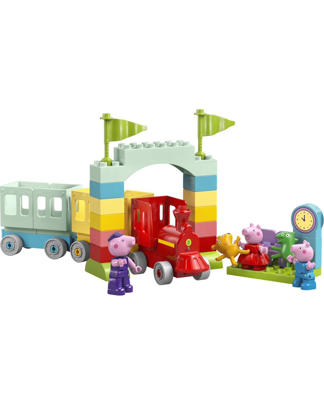 - Features for Creative Train Play - Includes Grandpa Pig, George Pig and Peppa Pig figures, a drivable toy train plus carriages, an arch made from bricks and a LEGO DUPLO station with a clock