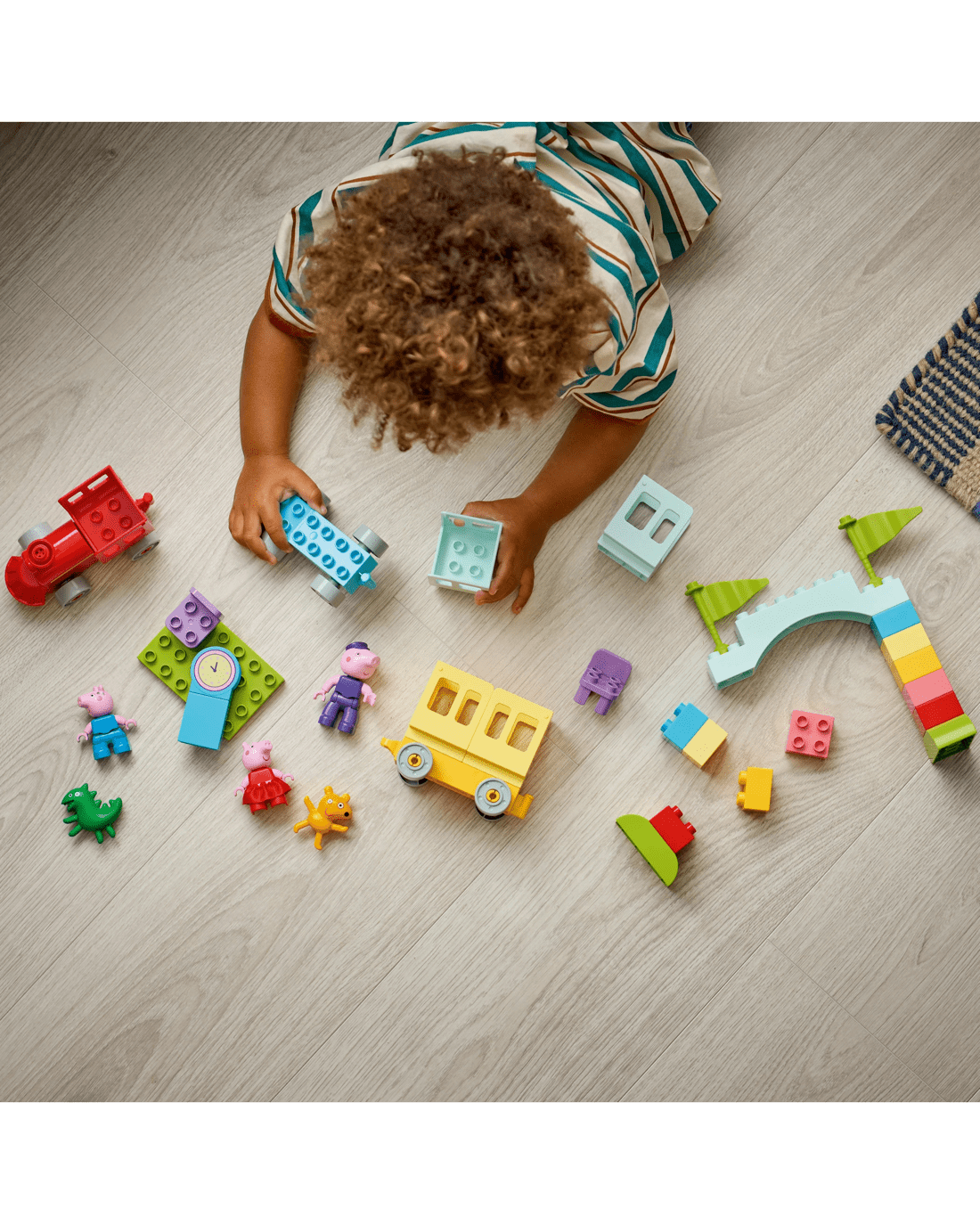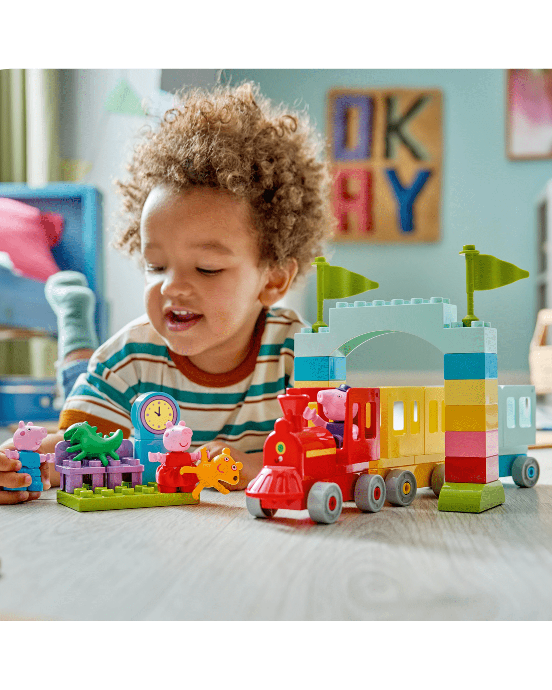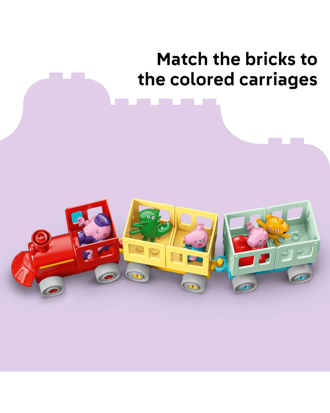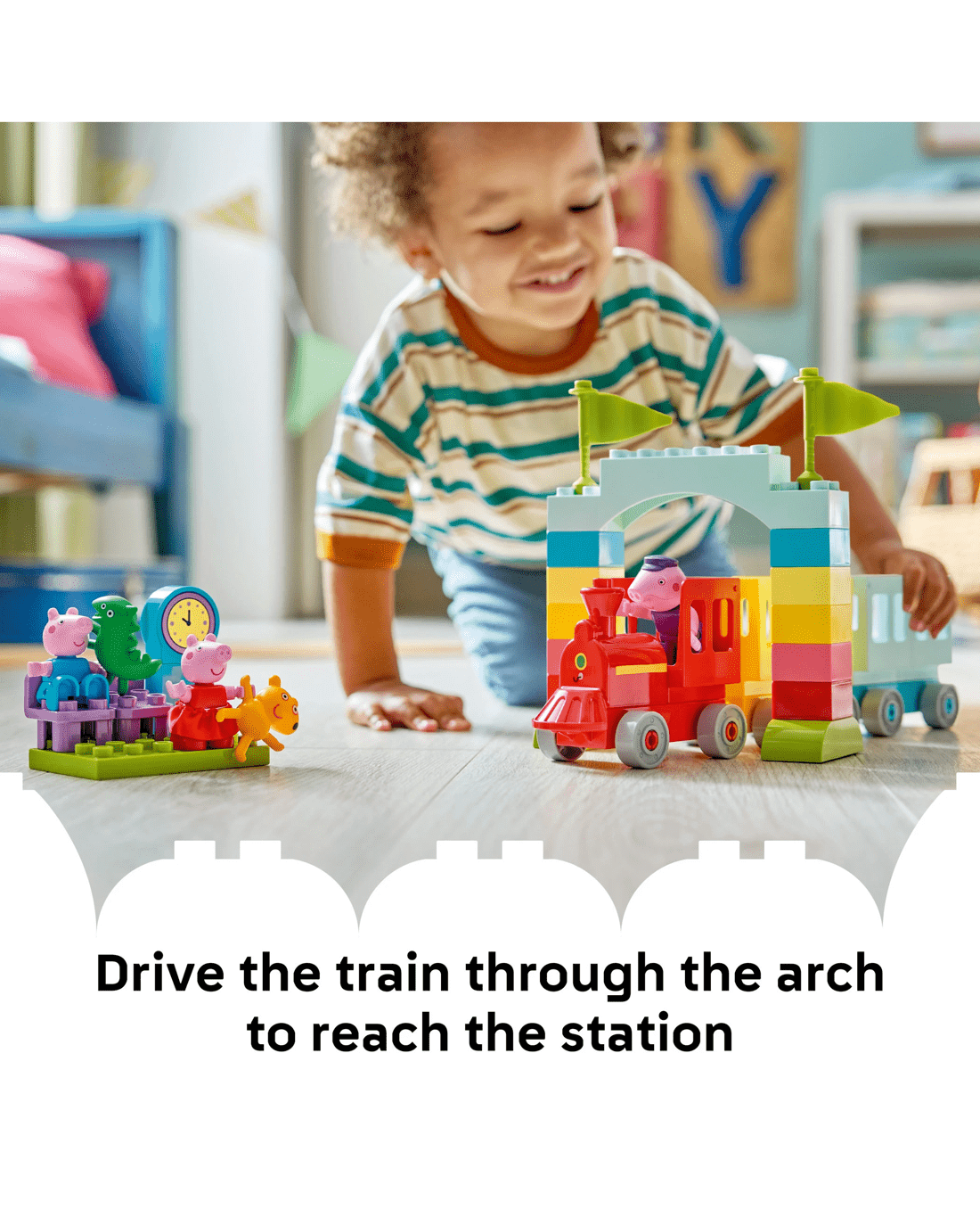 - Features for Creative Train Play - Includes Grandpa Pig, George Pig and Peppa Pig figures, a drivable toy train plus carriages, an arch made from bricks and a LEGO DUPLO station with a clock