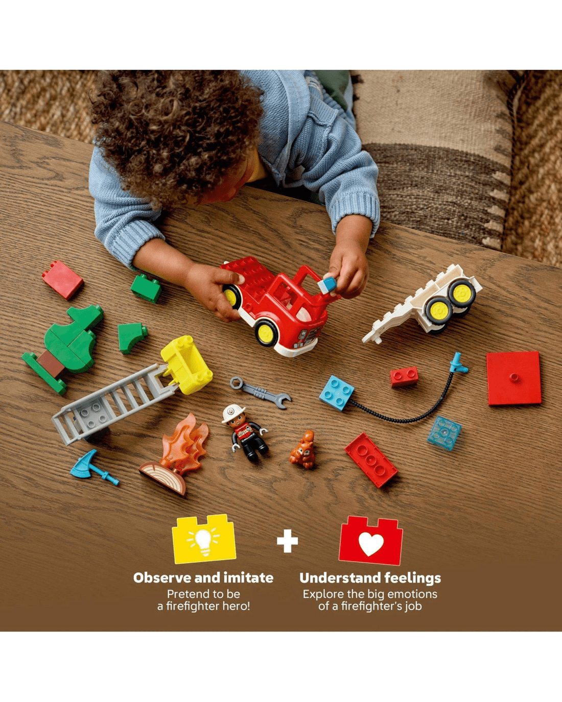 - Emergency Vehicle Toy - Toddlers grow their imagination inventing exciting stories about tackling a fire with the LEGO DUPLO Town Fire Engine with Hose and Firefighter playset