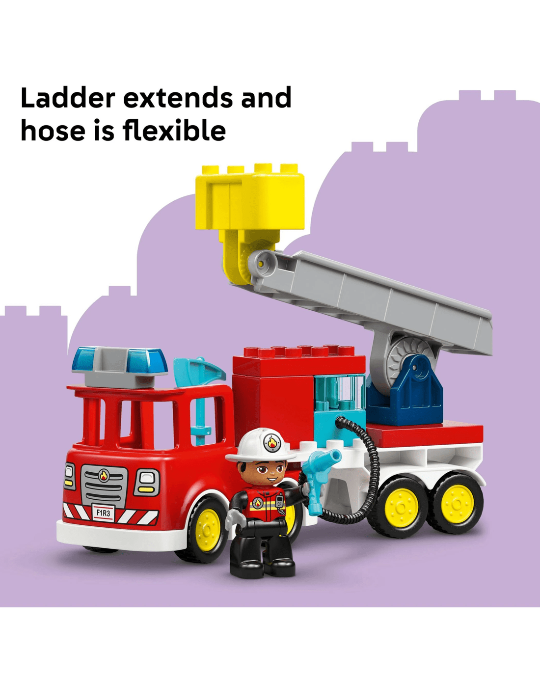 Fuel fun rescue pretend play for toddlers with LEGO DUPLO Town Fire Engine with Hose and Firefighter emergency vehicle toy. This fire engine toy is packed with features, such as a flexible hose, a tree and a LEGO DUPLO squirrel figure.