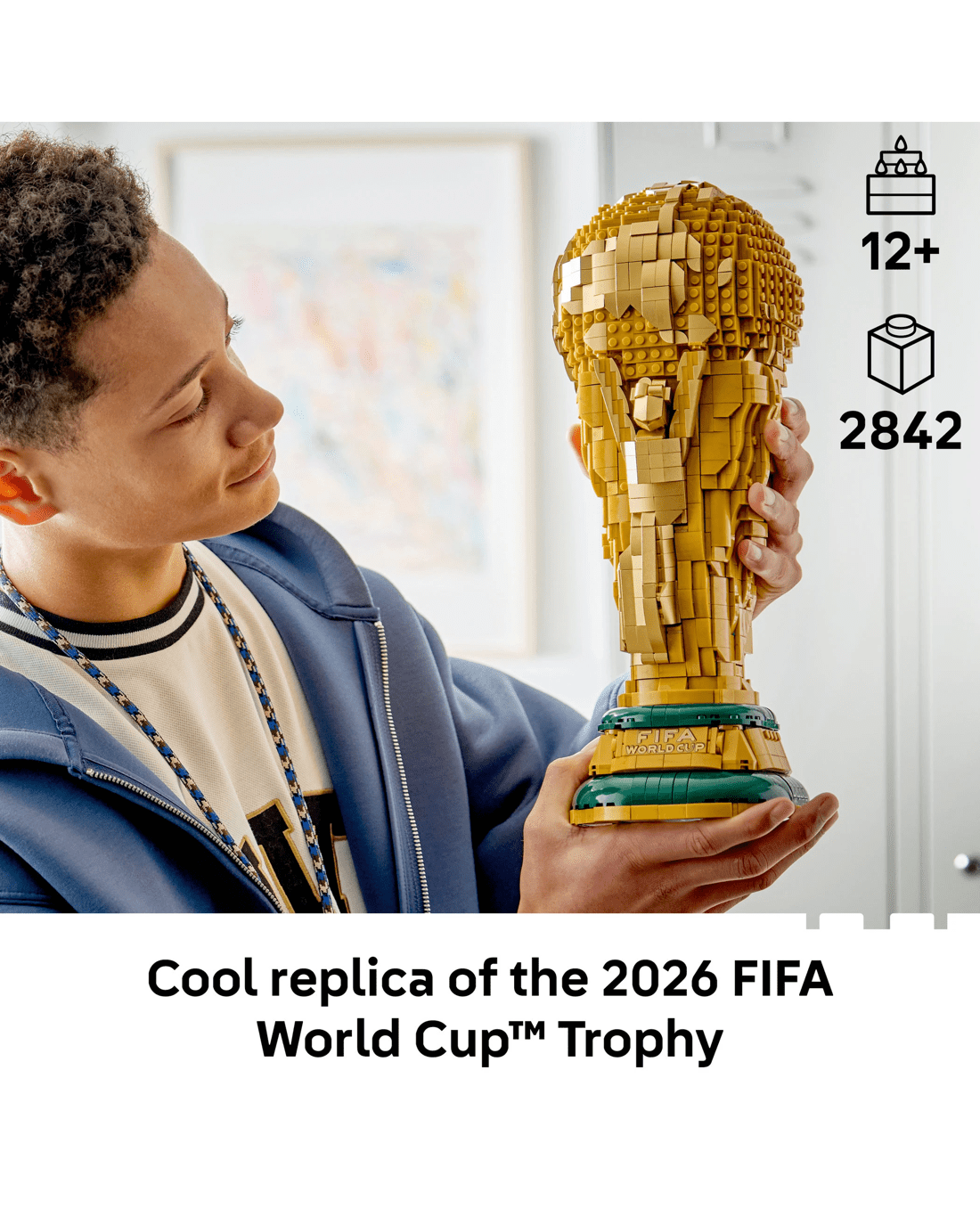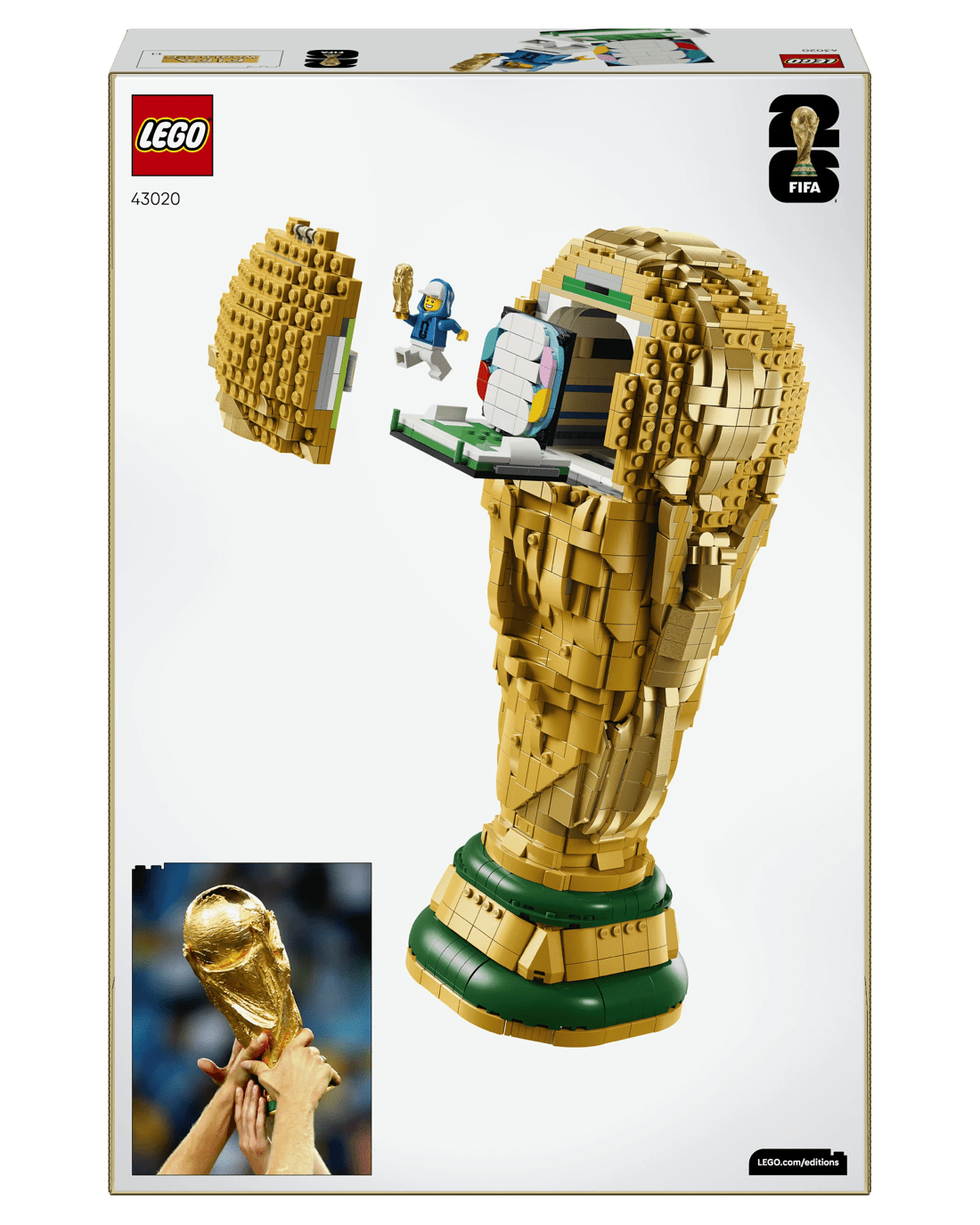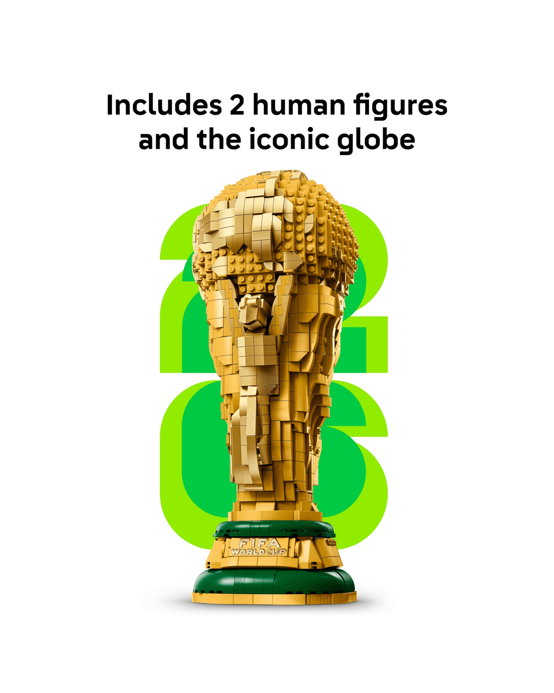 Sports stars will have lots of fun building this World Cup Trophy replica from LEGO bricks and discovering its authentic details. It features two human figures in a swirling movement holding up the Earth, the iconic globe and a plaque at the bottom naming past World Cup winners. The top globe of the LEGO trophy opens to reveal a FIFA World Cup 2026 branded minifigure holding a mini trophy toy and a backdrop that shows the 2026 World Cup logo. The small scene can be kept inside the trophy or taken out to be displayed next to it.