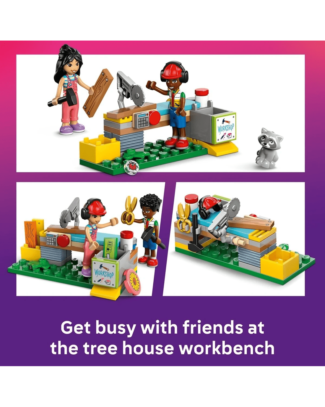 See imaginations grow with this LEGO Friends Friendship Tree House Hangout building kit. This detailed kids' set lets girls and boys create their own friendship adventures. It comes with four LEGO Friends minidolls, a dog figure and a raccoon figure, plus a buildable workbench with tools.