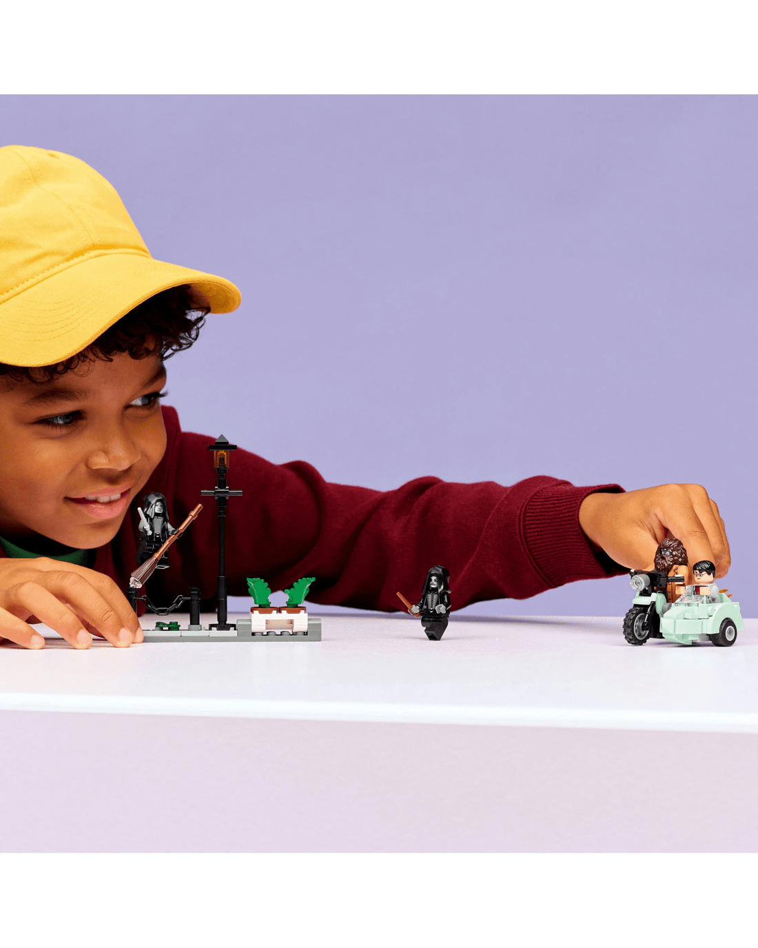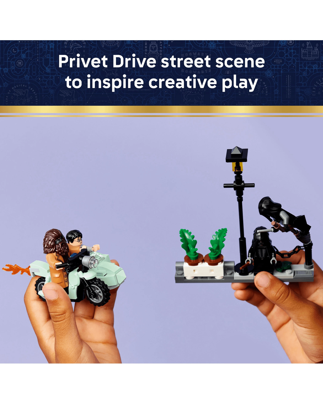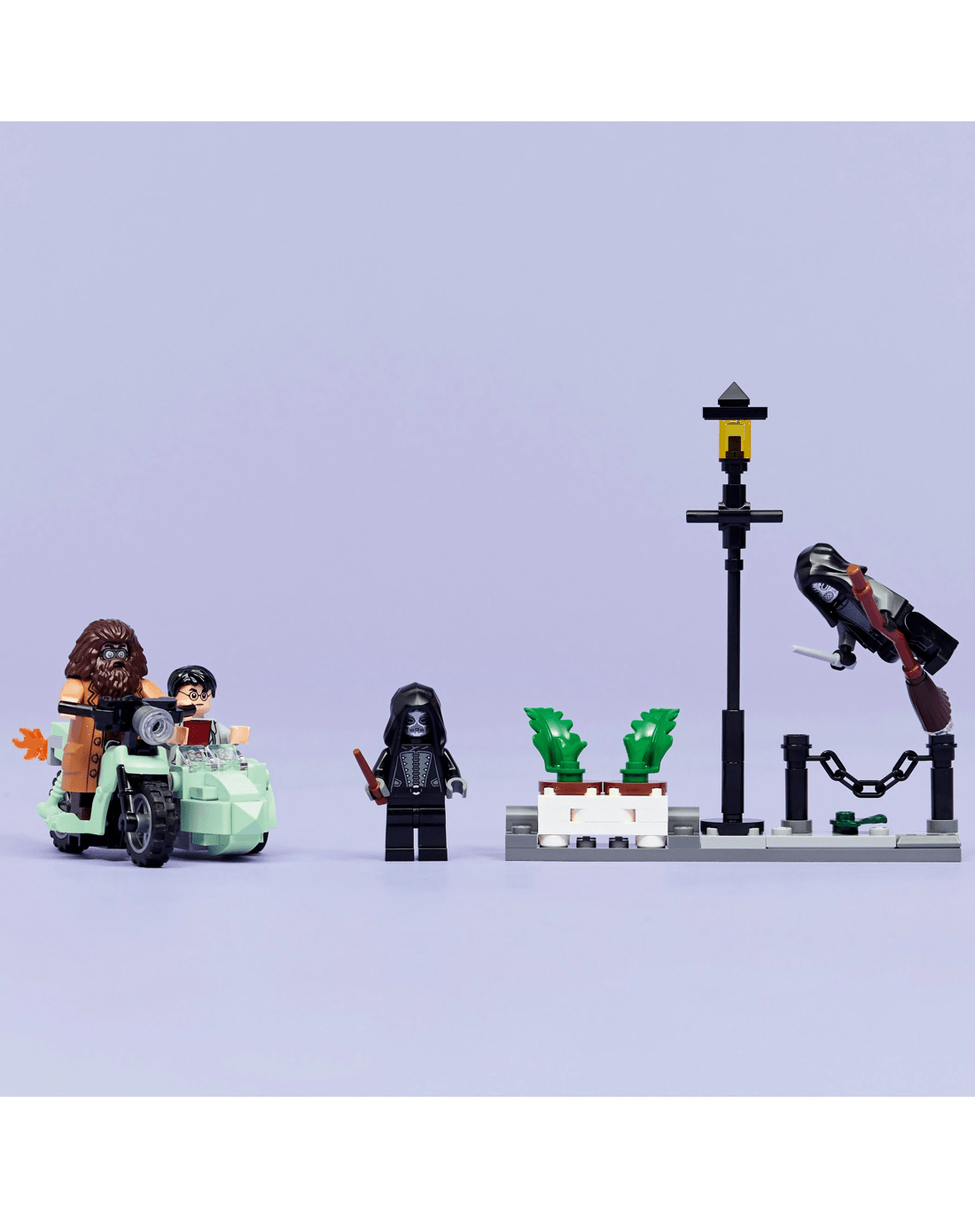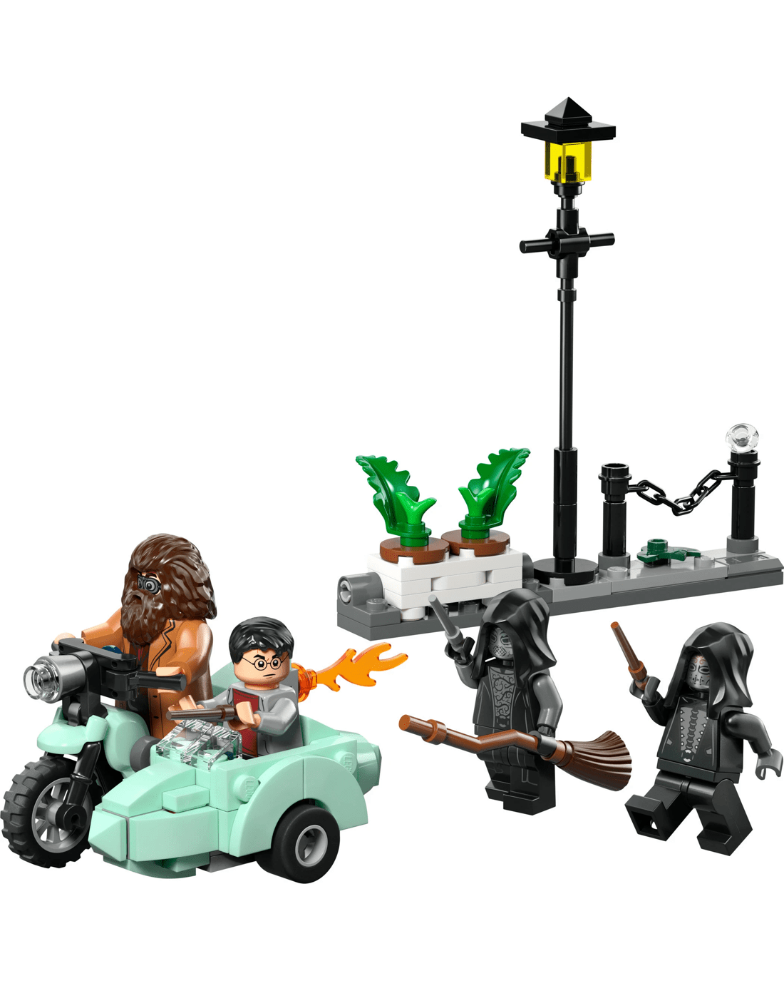 Place the Rubeus Hagrid minifigure on the motorcycle and Harry Potter in the sidecar. Pose the two Death Eater minifigures on the Privet Drive scene, which features a lamppost and a planter of flowerpots that is designed to be flipped over during the heroes' daring escape.