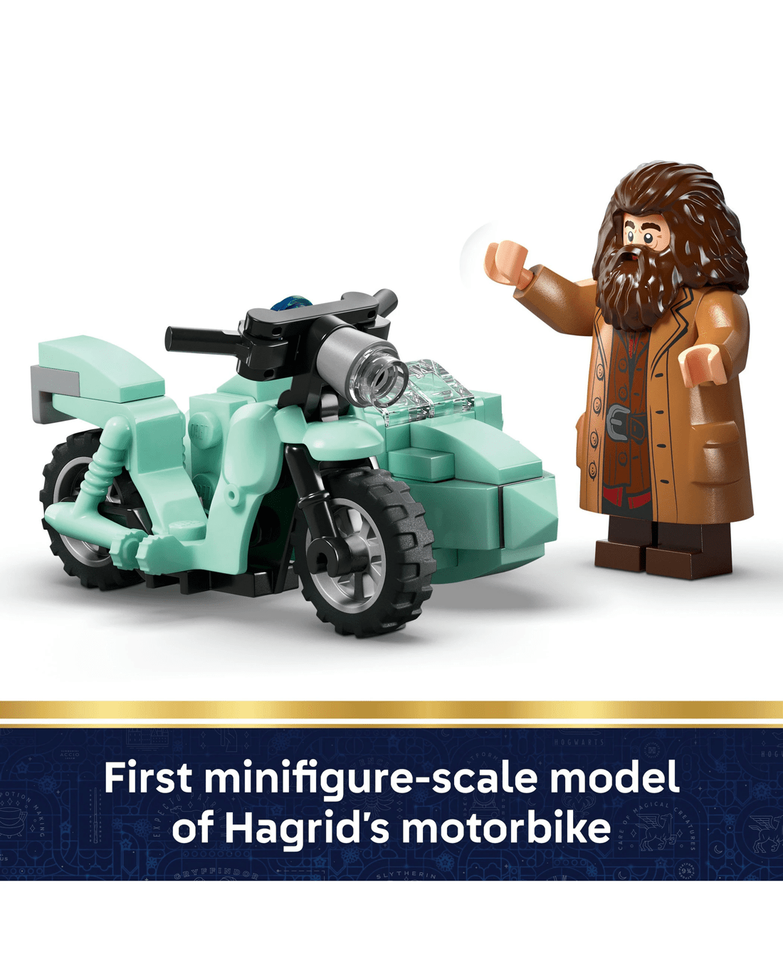 - Motorcycle Model with Sidecar - Place Rubeus Hagrid on the first minifigure-scale LEGO model of his flying motorcycle with Harry Potter in the sidecar