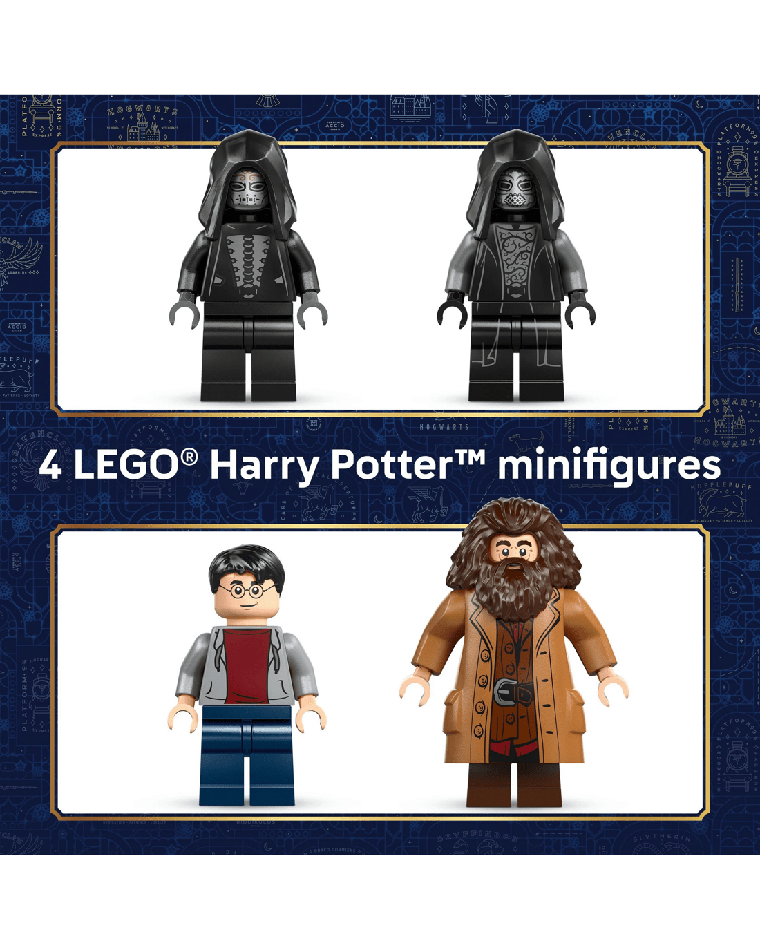 - 4 Lego Harry Potter Minifigures - Role-play adventure stories with Harry Potter, Rubeus Hagrid (wearing his signature motorcycle goggles) and 2 Death Eaters
