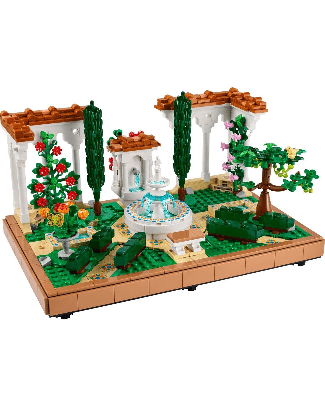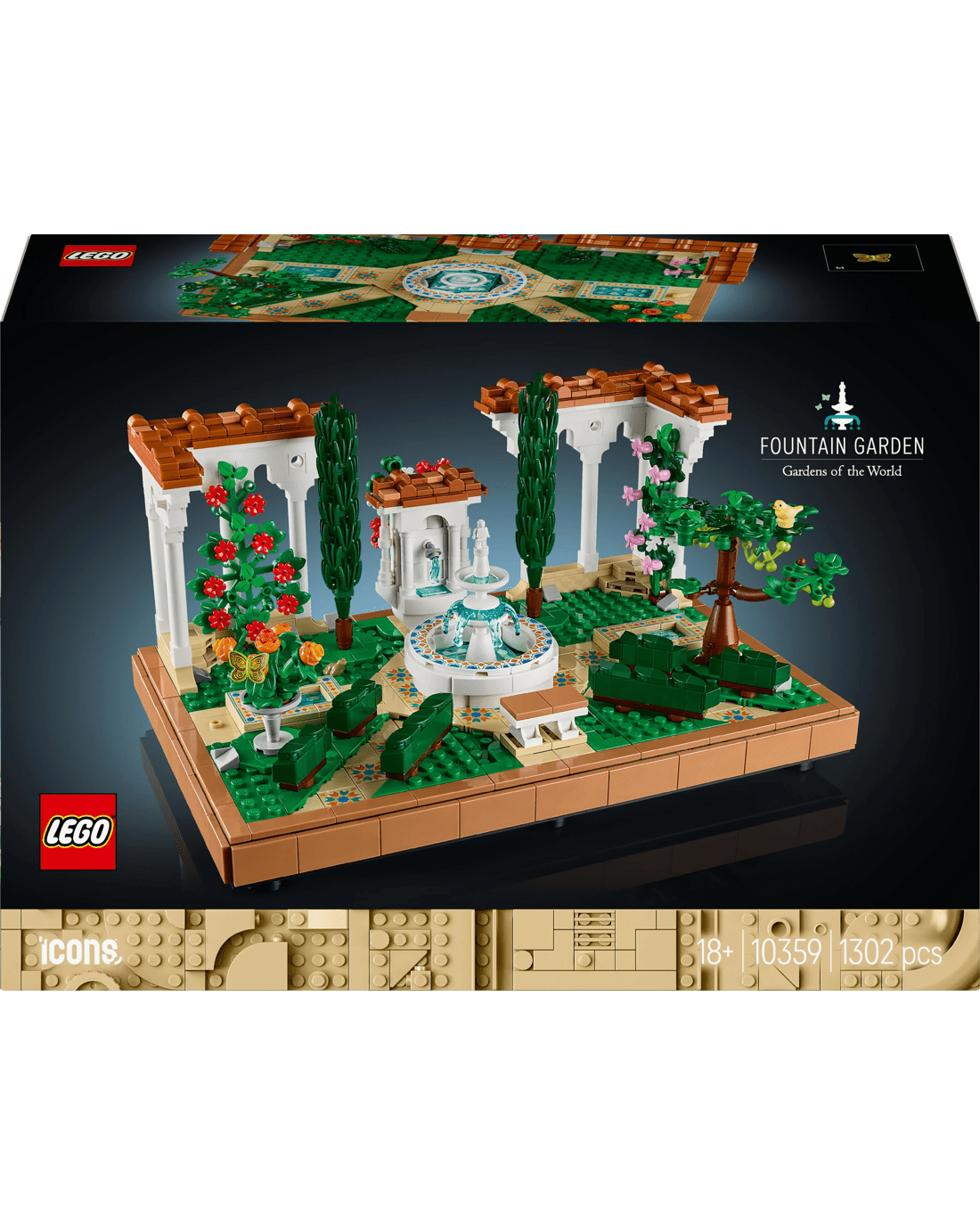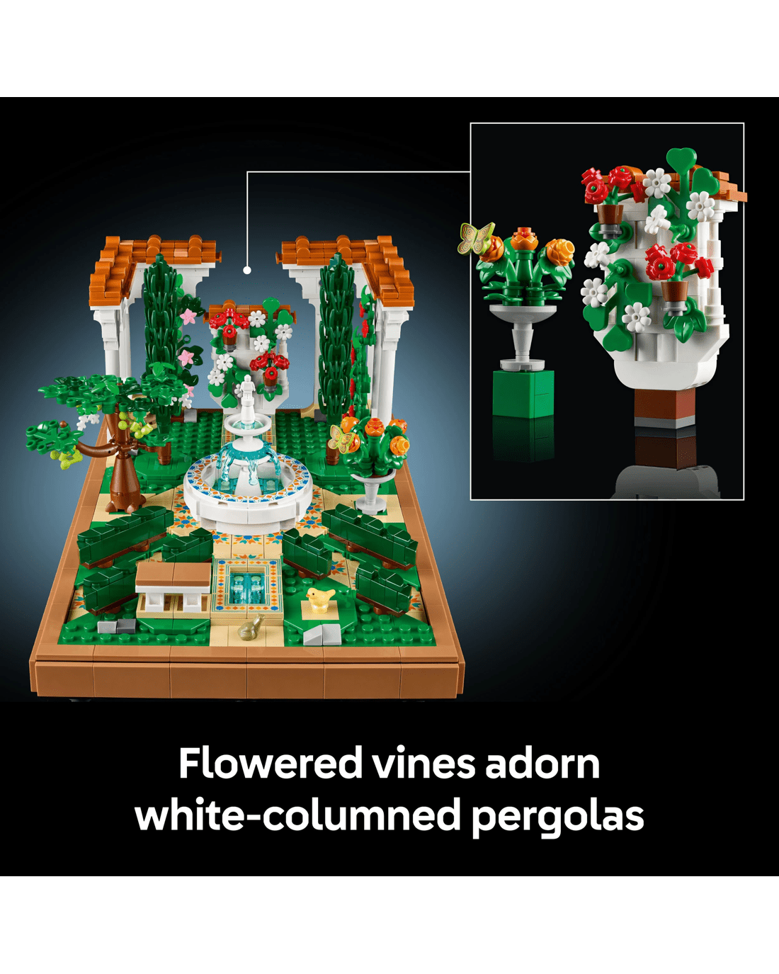- What's in the box - The LEGO Fountain Garden features a tiered fountain, lavabo, 2 cypress trees, flowering grape vines, 4 pergolas and tiled pathways, plus luna moth, bird and frog figures