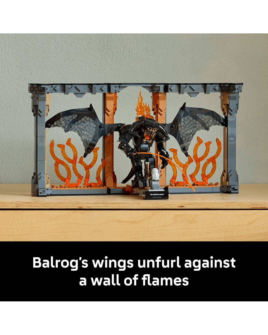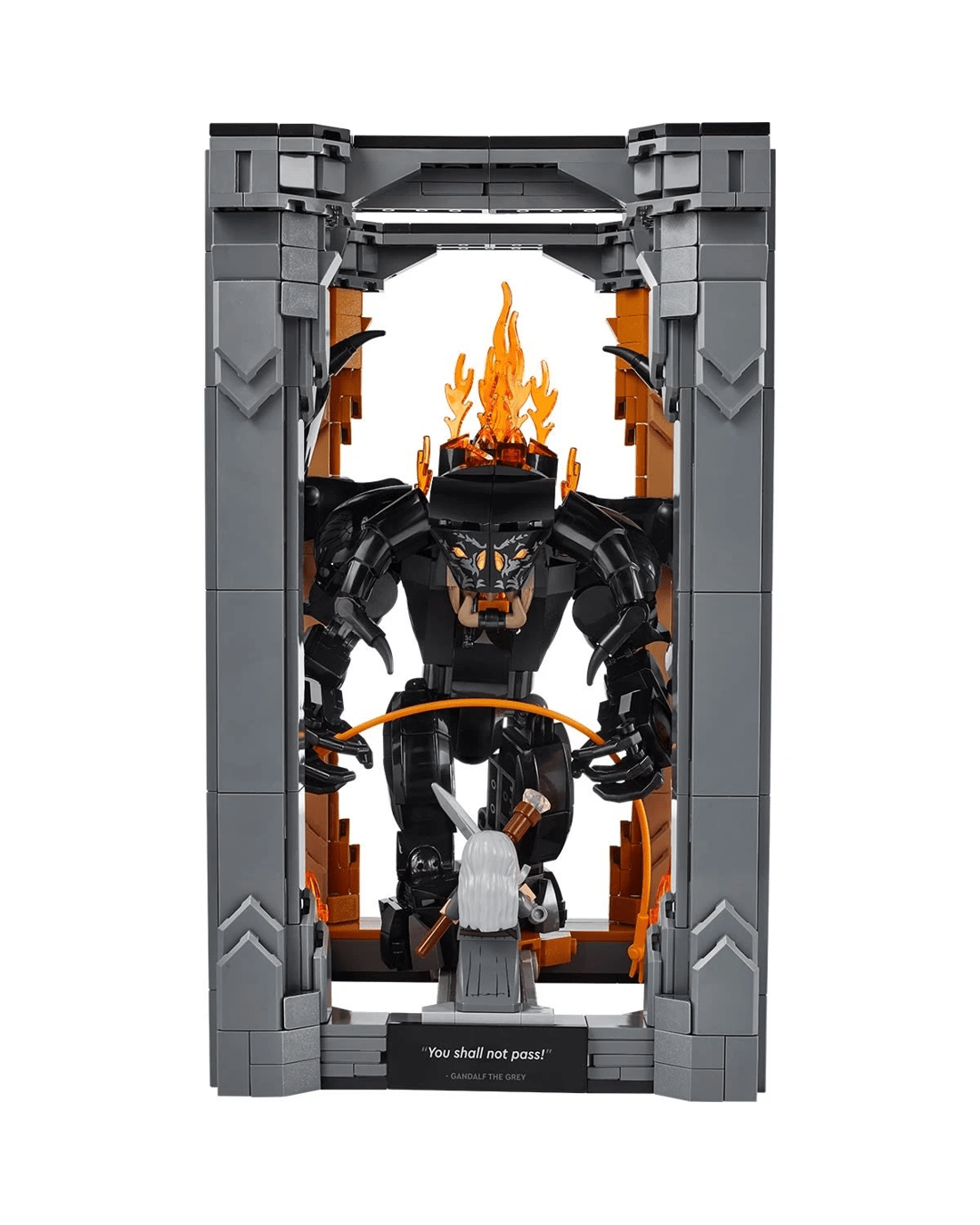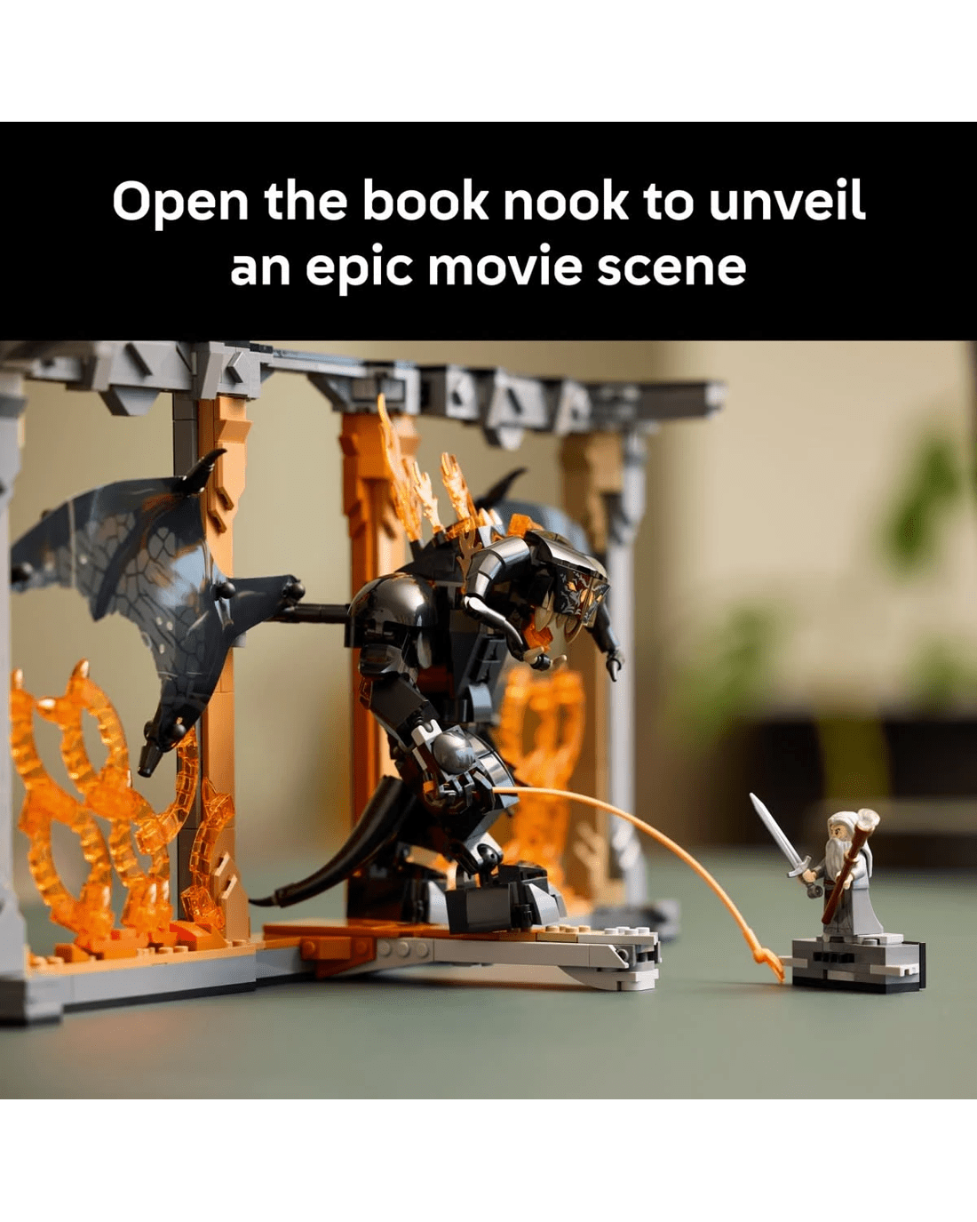 - Features and functions - Open the book nook to reveal a depiction of the Bridge of Khazad-dum showdown and pose the detachable Gandalf the Grey minifigure and Balrog figure for a dynamic display