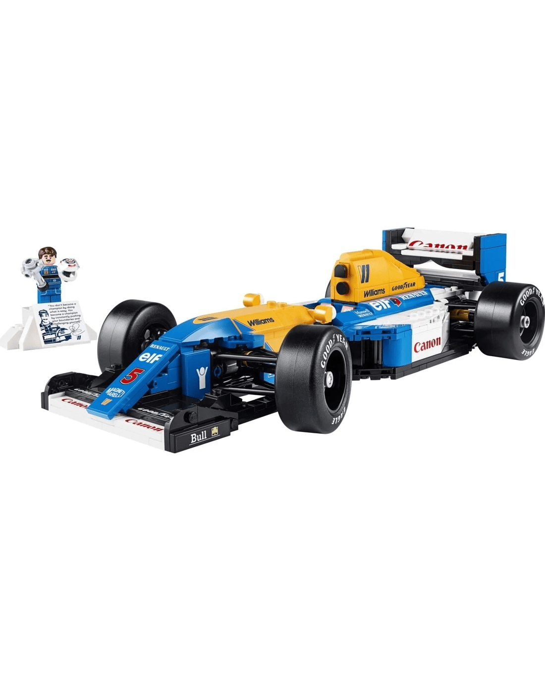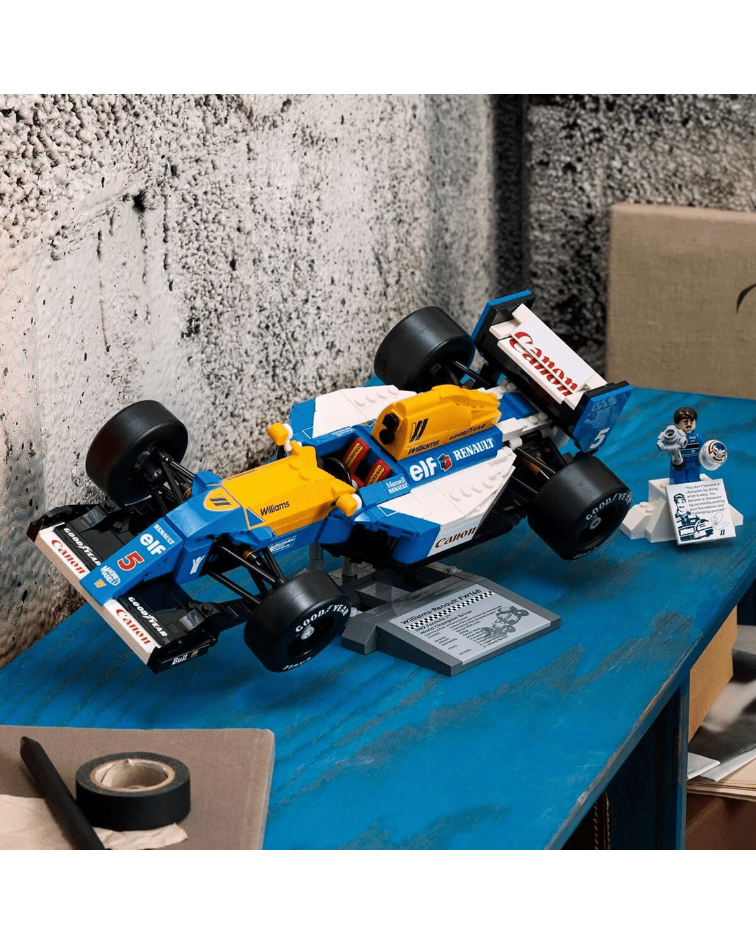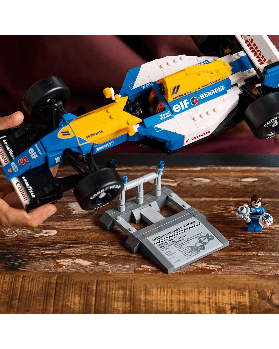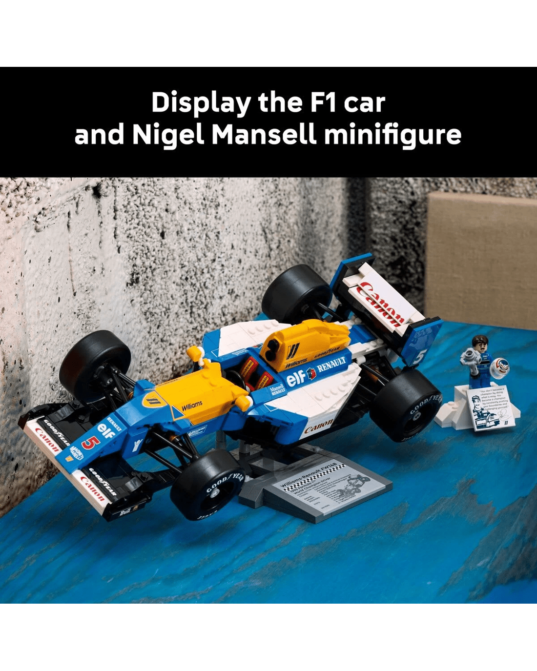 - Desk decor for the home and office - Includes a Williams Racing FW14B display stand with printed vehicle statistics and a Nigel Mansell minifigure display podium with a photo and a Nigel Mansell quote