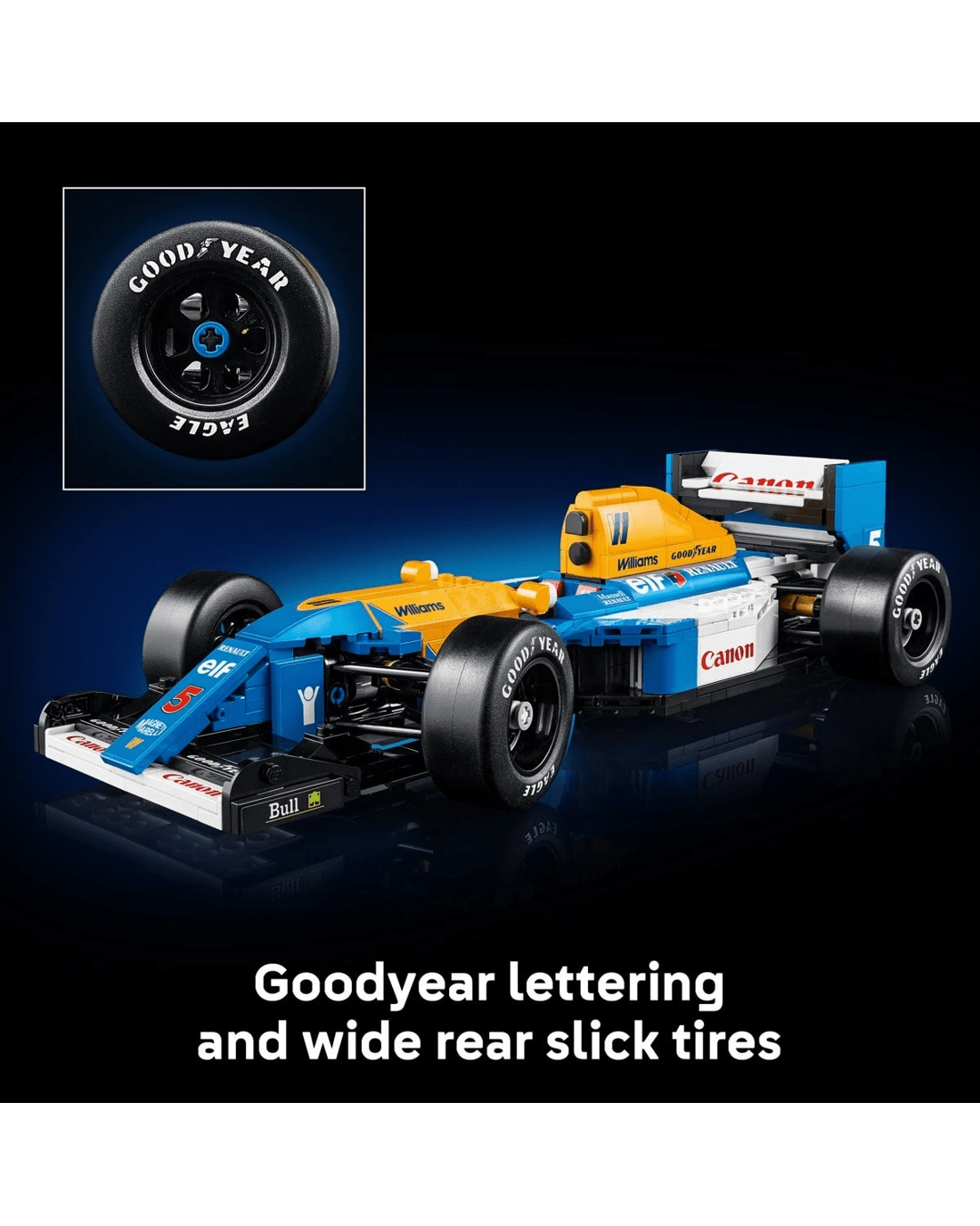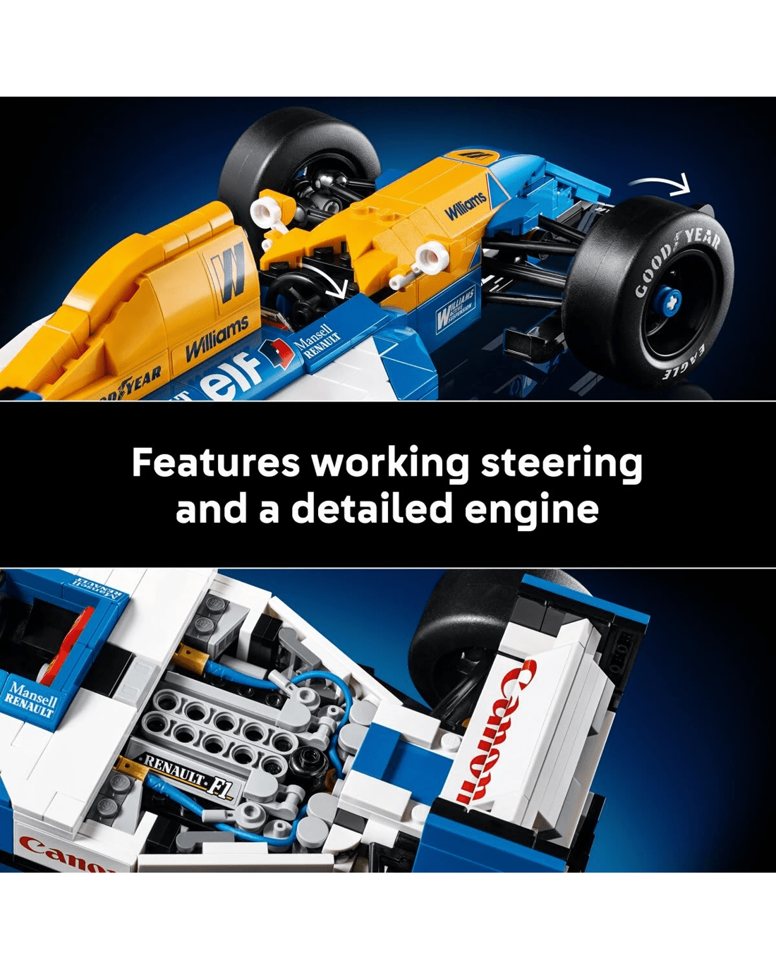 - Features and functions - This LEGO Icons Williams Racing FW14B F1 race car model features working steering, wide rear slick tyres with printed Goodyear lettering, plus a detailed engine