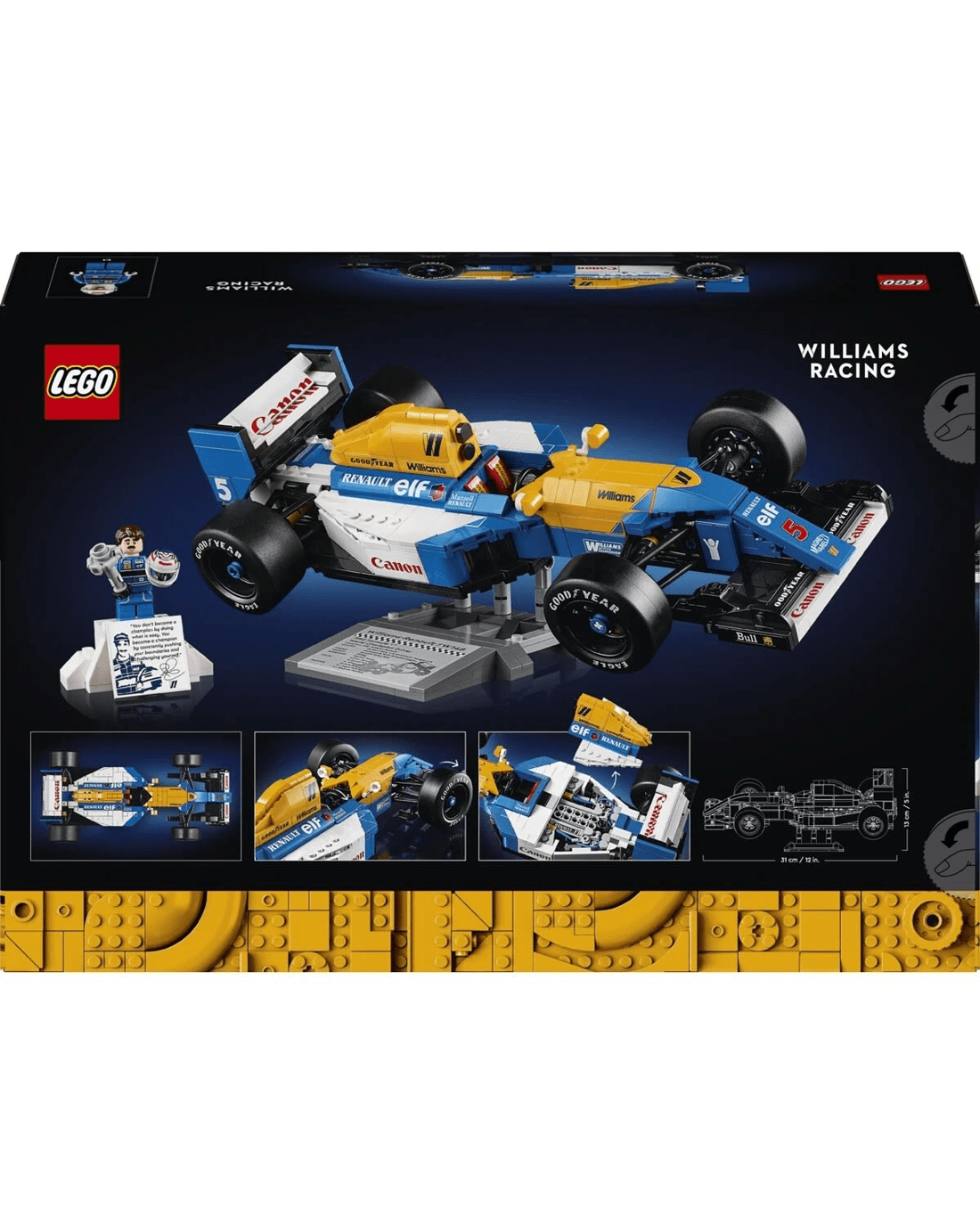 - What's in the box? - Everything you need to build a LEGO F1 Williams Racing FW14B race car and Nigel Mansell minifigure, plus a display stand, display podium, driver's helmet and trophy