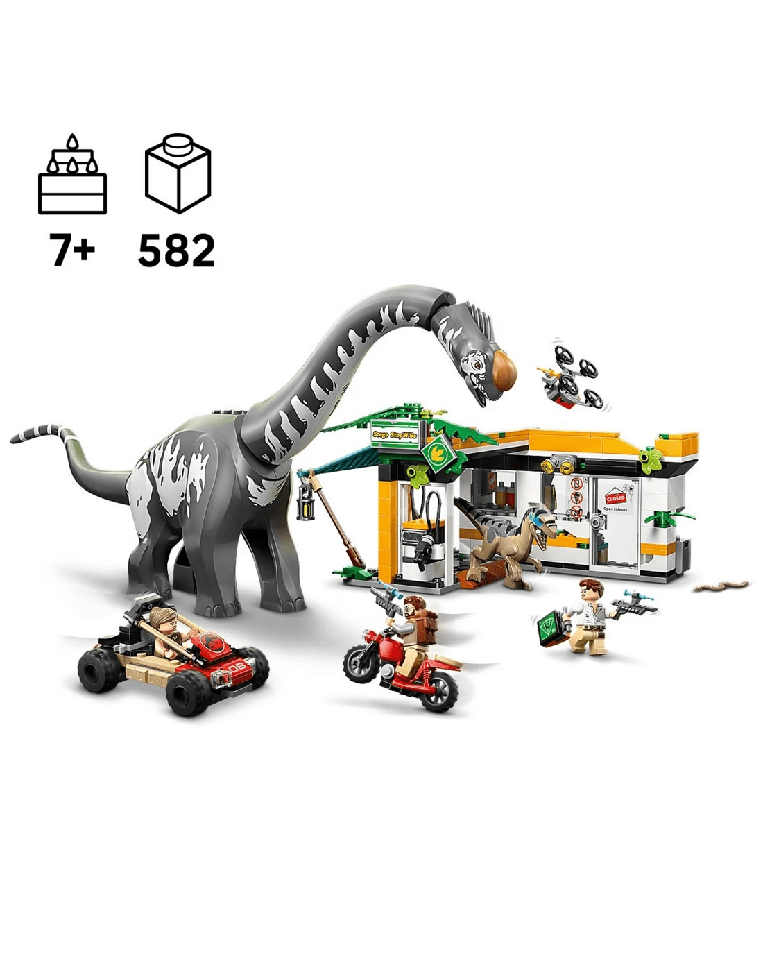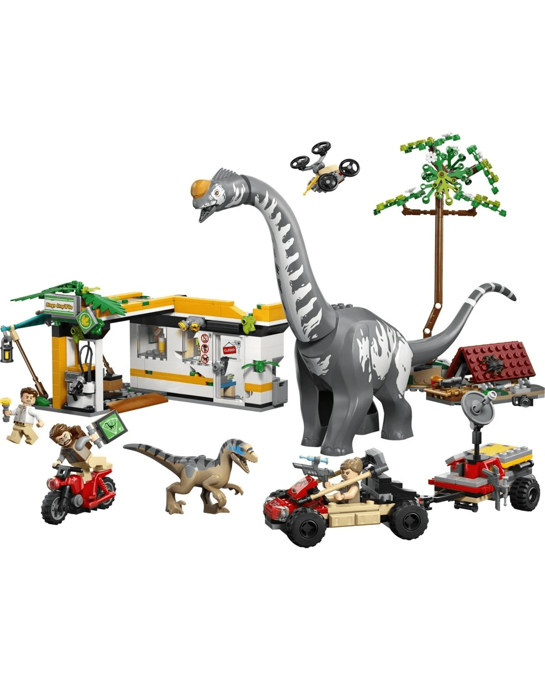 - Creative functions - The set includes a falling tree, a drone that attaches to the toy vehicle or the station roof, a Velociraptor with opening jaw and Titanosaurus with movable head, neck and tail