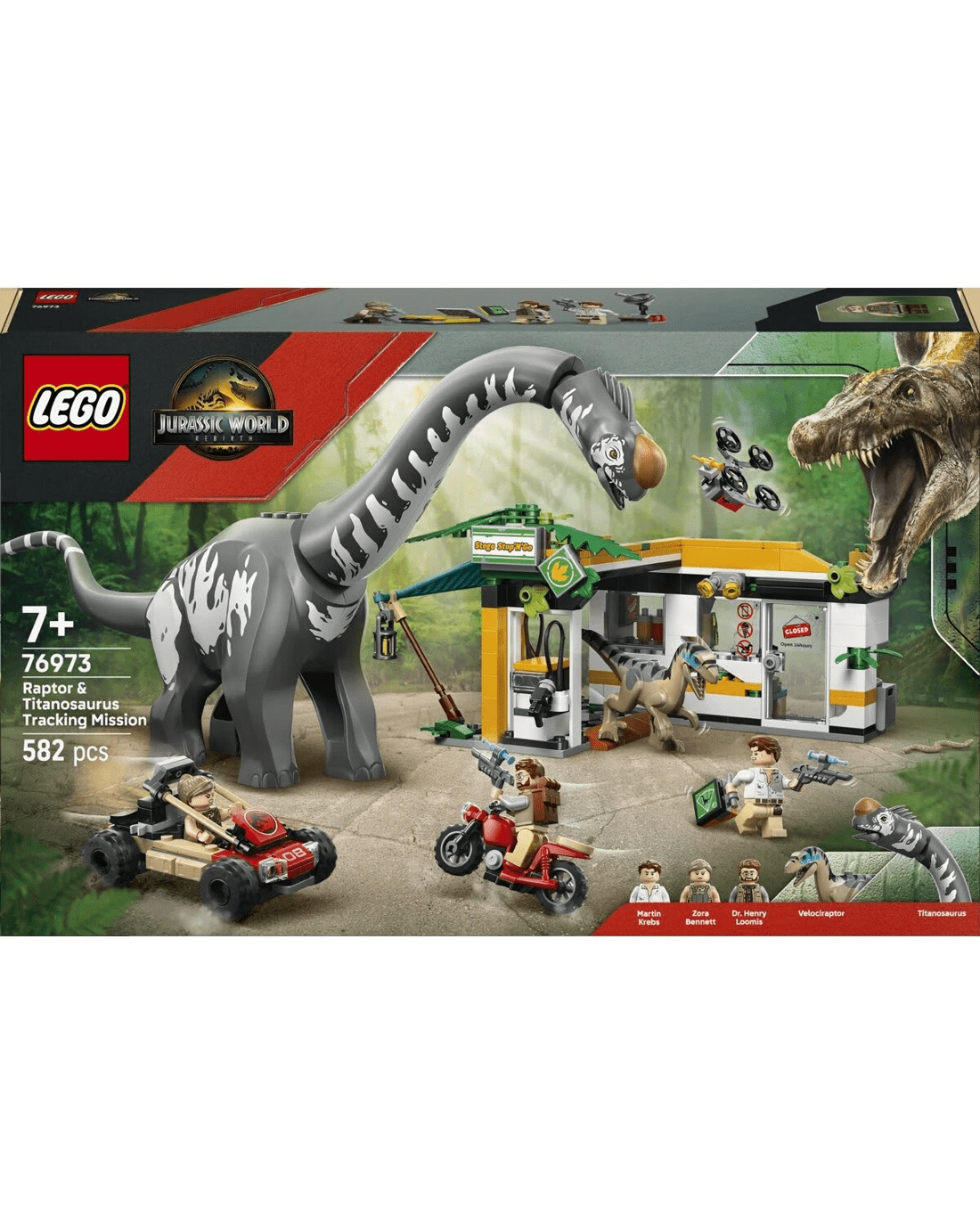 Thrilling chases and action await kids and film fans in this Raptor & Titanosaurus Tracking Mission LEGO Jurassic World building kit. The dinosaur gift for boys and girls features moulded Titanosaurus and Velociraptor toy figures and three minifigures: Zora Bennett, Martin Krebs and Dr. Henry Loomis. The Velociraptor has a moving jaw and the Titanosaurus has a movable neck, head and tail. The interactive toy playset includes a charging station, an off-road vehicle with a trailer, a syringe case with three syringes, a motorcycle, buildable drone, camp area with falling tree function and more. The building kit is easy to take out for playdates and makes a great choice for kids who love adventures and dinosaur toys. This set also works with other LEGO Jurassic World sets (sold separately). And the LEGO Builder app guides young fans on an intuitive building adventure, letting them zoom in and rotate models in 3D, save sets and track progress. Set contains 582 pieces.