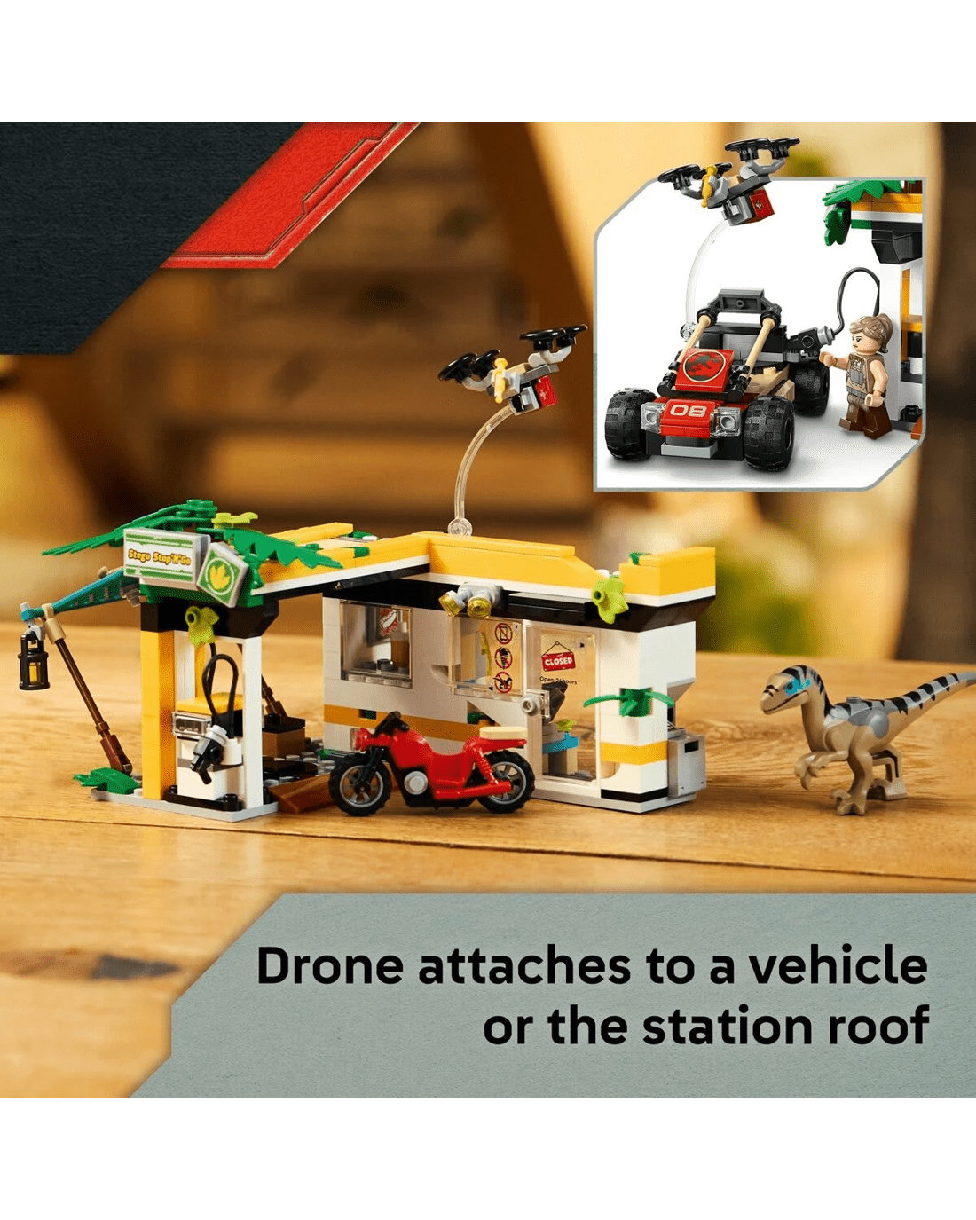 - Detailed playset - This LEGO Jurassic World set includes a toy charging station with storytelling items, a camp area and tree, a small motorcycle toy, a drone and an off-road vehicle with a trailer