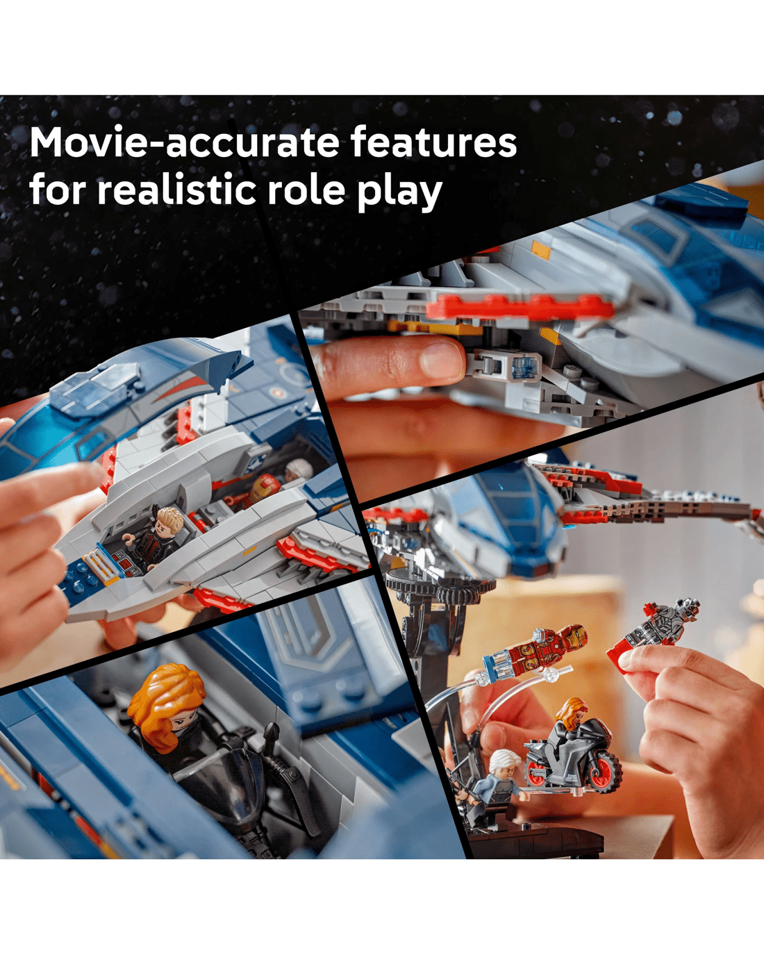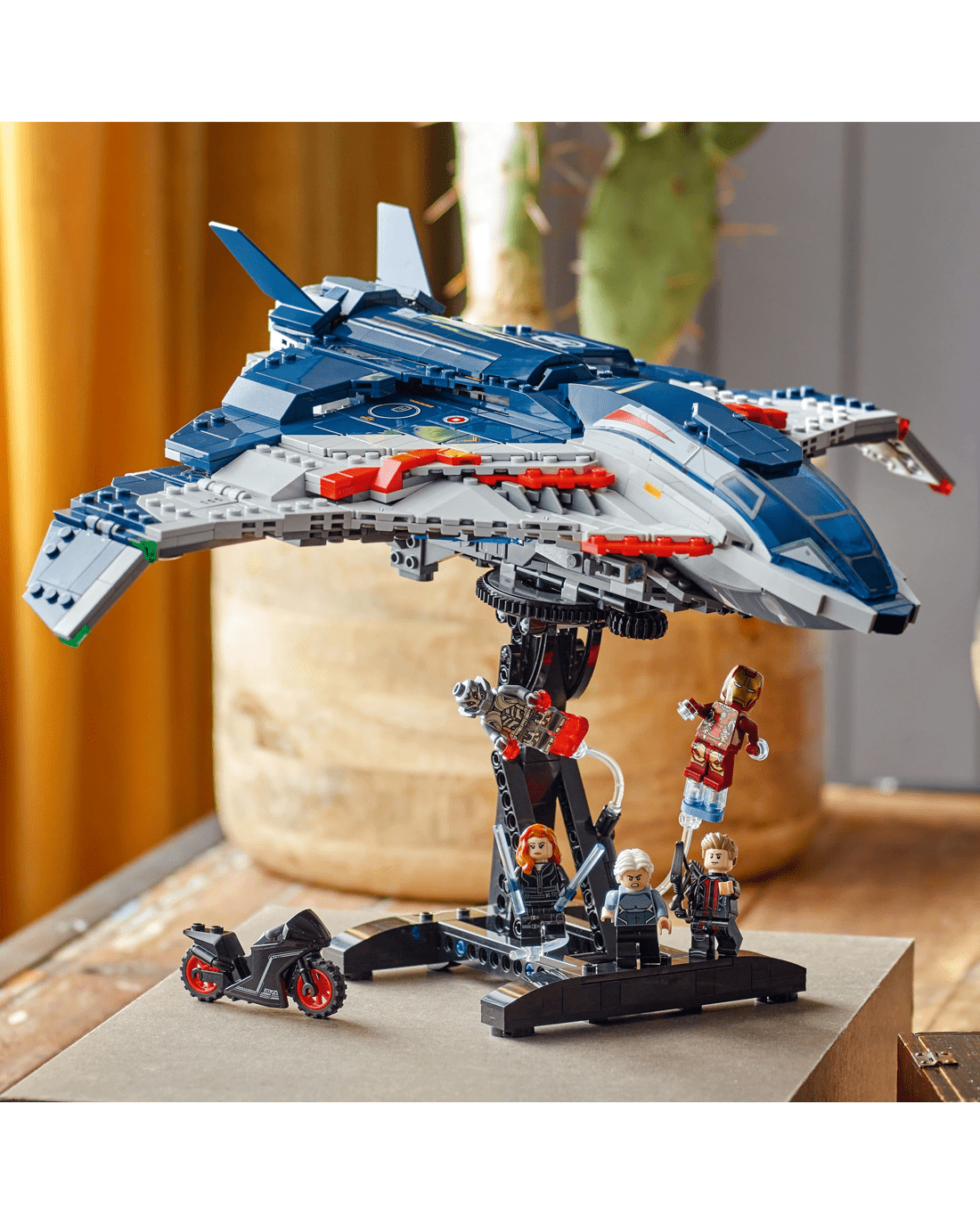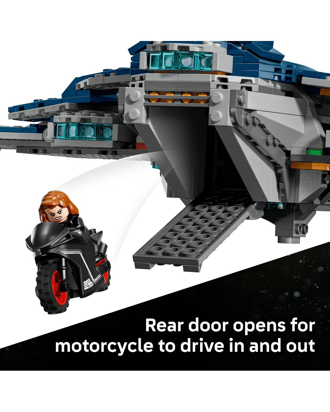 - Avengers Quinjet - The aircraft has an opening cockpit, 2 stud shooters at the front, storage for weapons and an opening rear door so kids can drive the motorcycle in and out